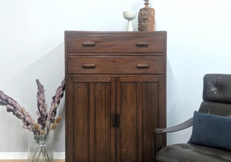 This British-made oak piece is a handsome vintage catch. Dating from the 1940s-early 1950s, it comes with bags of old-fashioned charm and character. There’s a lot of practical storage for your book collection or treasures behind two sliding glass doors, along with a generous cupboard below for those things you don’t want on display. The design is simple and unfussy, a hallmark of ‘Commodity Controlled’ furniture like this. Made to comply with the war-time and post-war utility scheme, it was at a time when resources, like wood, were scarce but the demand for essential domestic goods like clothes and furniture continued. The CC scheme ensured they were manufactured to strict austerity guidelines. Solidly crafted in oak, it’s a piece lasted a lifetime but has many more years of service to go. The tidy width and shallow depth means it would slot nicely into an alcove or by a chimney breast