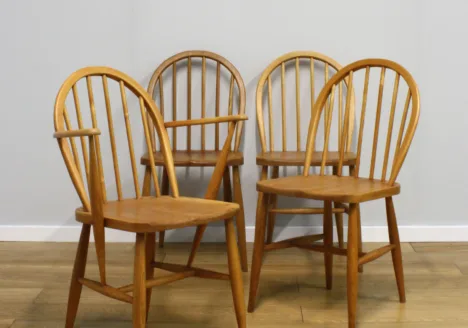 Here is a fully restored pair of much sought-after, Ercol 370A carver dining chairs. One of the most popular and enduring chair designs in the Ercol Windsor range, the 370 (the version of the chair without arms) and 370A were made between 1957 and 1982. These particular chairs date from the 1960s. Made from solid British elm and beech ‘blond’ woods with six back spindles and a generous seat height and width, providing great comfort. We love the upturned, welcoming arms of the carver chairs. This is classic, vintage Ercol at its best. They built furniture to last and the fact these chairs are 50+ years old and still solid and stable proves that. They have much to offer and would be as at home in a midcentury inspired interior as they would around a homely country cottage kitchen table. The restoration process for an Ercol dining chair is a labour of love as in our view they require hand-sanding to get the best finish without being too hard and invasive. This takes a great deal of time but the results are worth it.