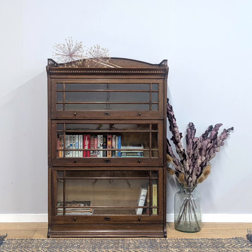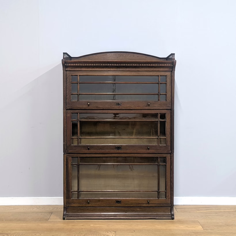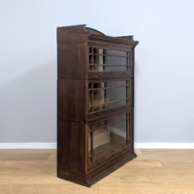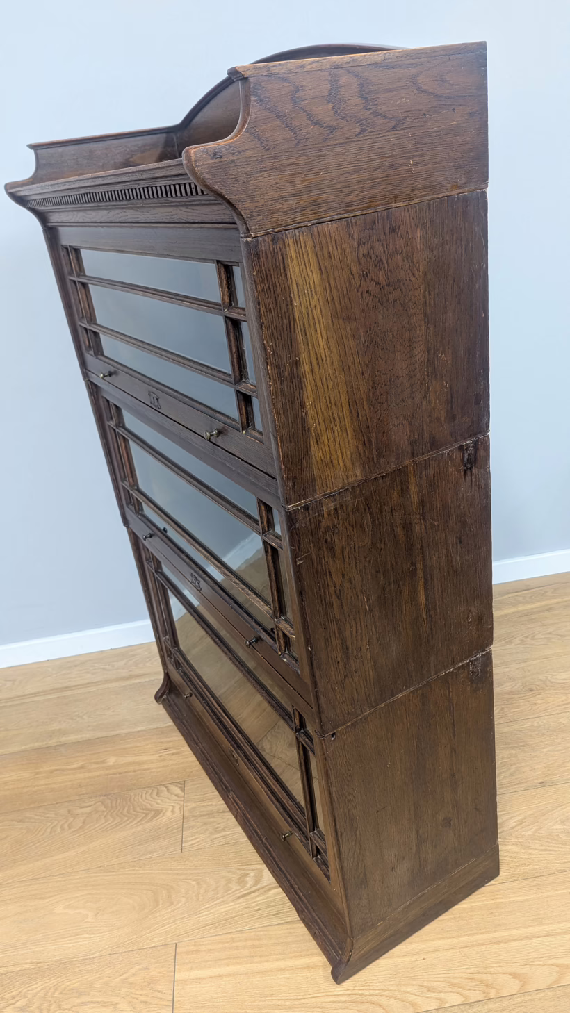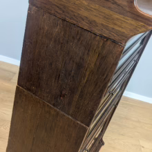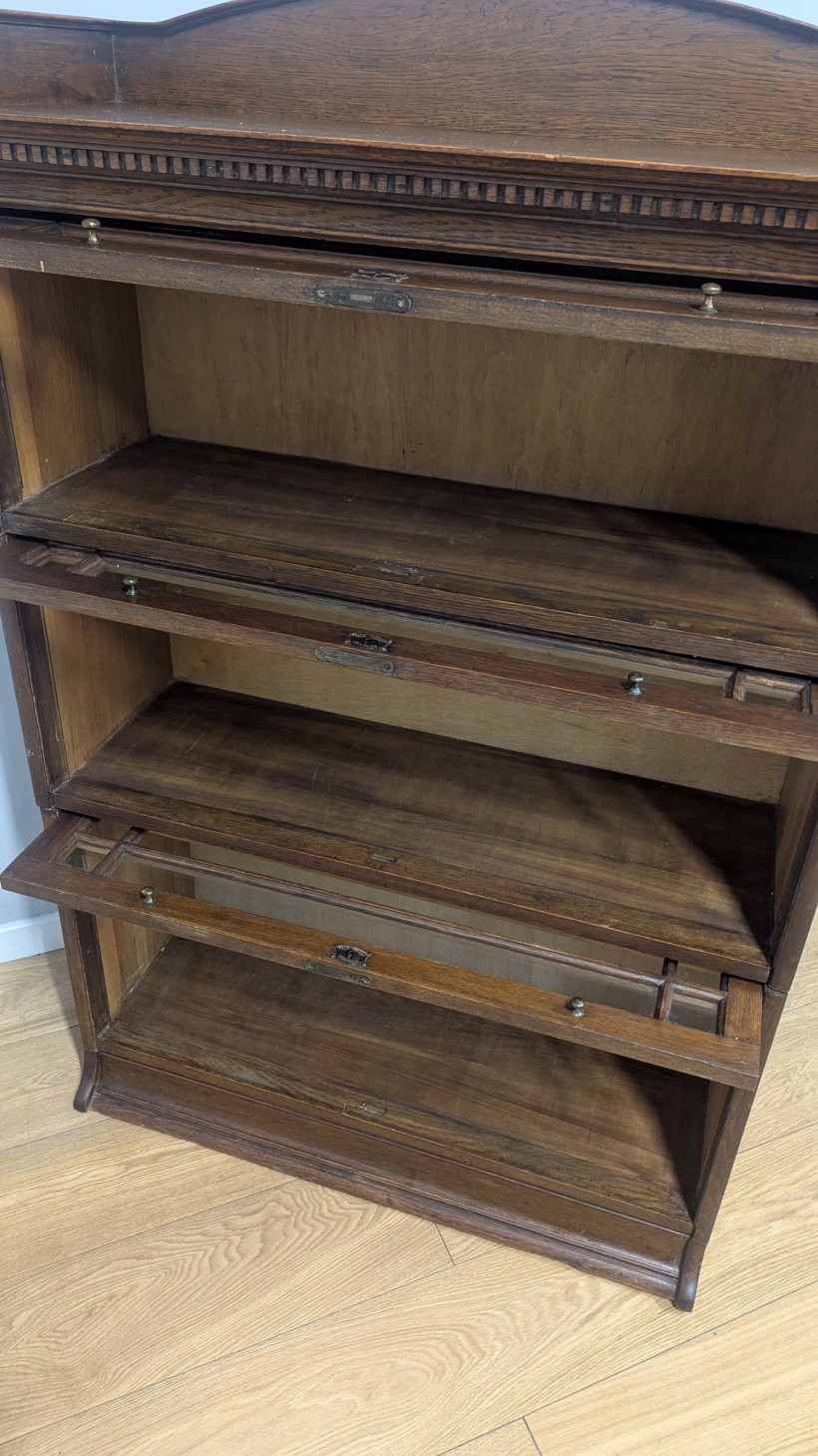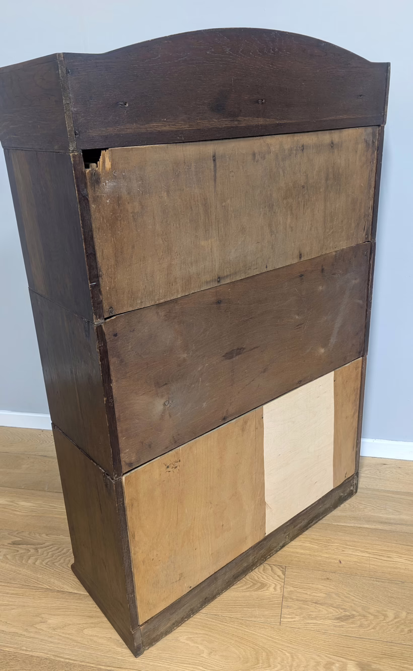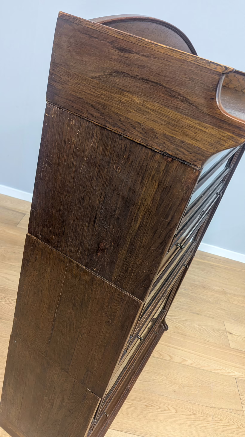 This is an original, vintage piece that is ‘sold as seen’. It is in good, used condition. It has been checked and cleaned inside and out, and we have applied a natural beeswax polish to revive the wood on the exterior surfaces but otherwise the finish is all original. There are five stacking sections in total – the top section with an additional open shelf, three graduated glazed bookcases and the base section. They simply slot on top of one another with no tools required. It is a freestanding piece. The glass doors of the three bookcases lift up and slide back and there are no cracked panels. They lift and move with ease although we would advise this is done with a gentle touch. The brass buttons handles are original and securely attached, and the Lebus name is seen on the brass lock escutcheons. Sadly we do not have the keys. The bookcase interiors are clean and tidy with some light superficial marks and scuffs from use as shown in our photos. As you would expect with an antique item such as this, there are signs of wear and tear here and there on the exterior surfaces, primarily concentrated on the back. There is some missing plywood on one section, a small hole in another, along with various other knocks and bruises as we’ve shown. We spotted a handful of historical woodworm holes in the base section but there is nothing active and likely hasn’t been for decades. When stacked the bookcase is solid and stable, slotting into place easily. We believe it is mahogany. Do browse through our photos for a good sense of its condition. If you would like us to share a video of the piece with you via WhatsApp drop us a line – we’d be very happy to oblige. Likewise, if you’ve any queries, just get in touch.