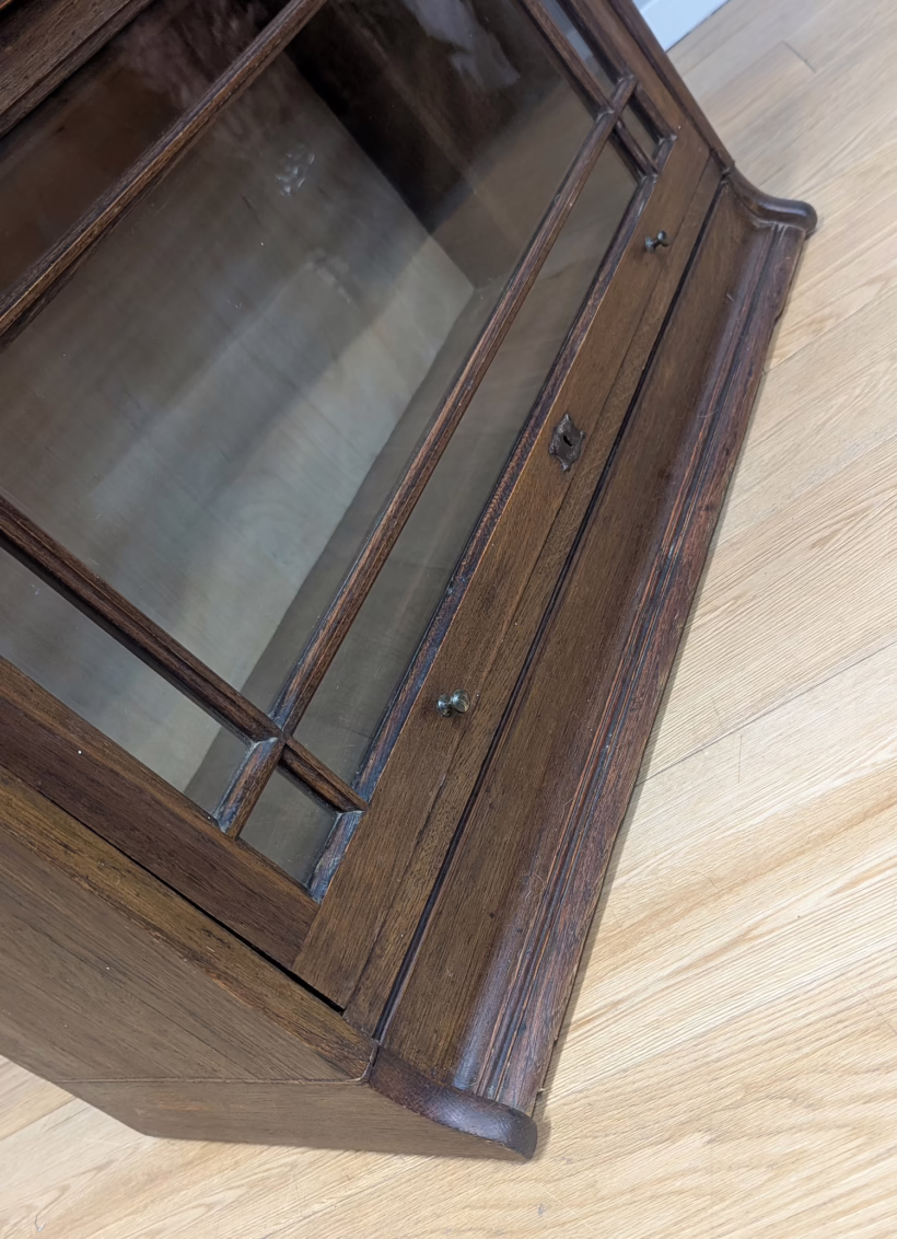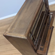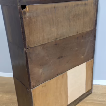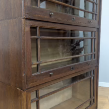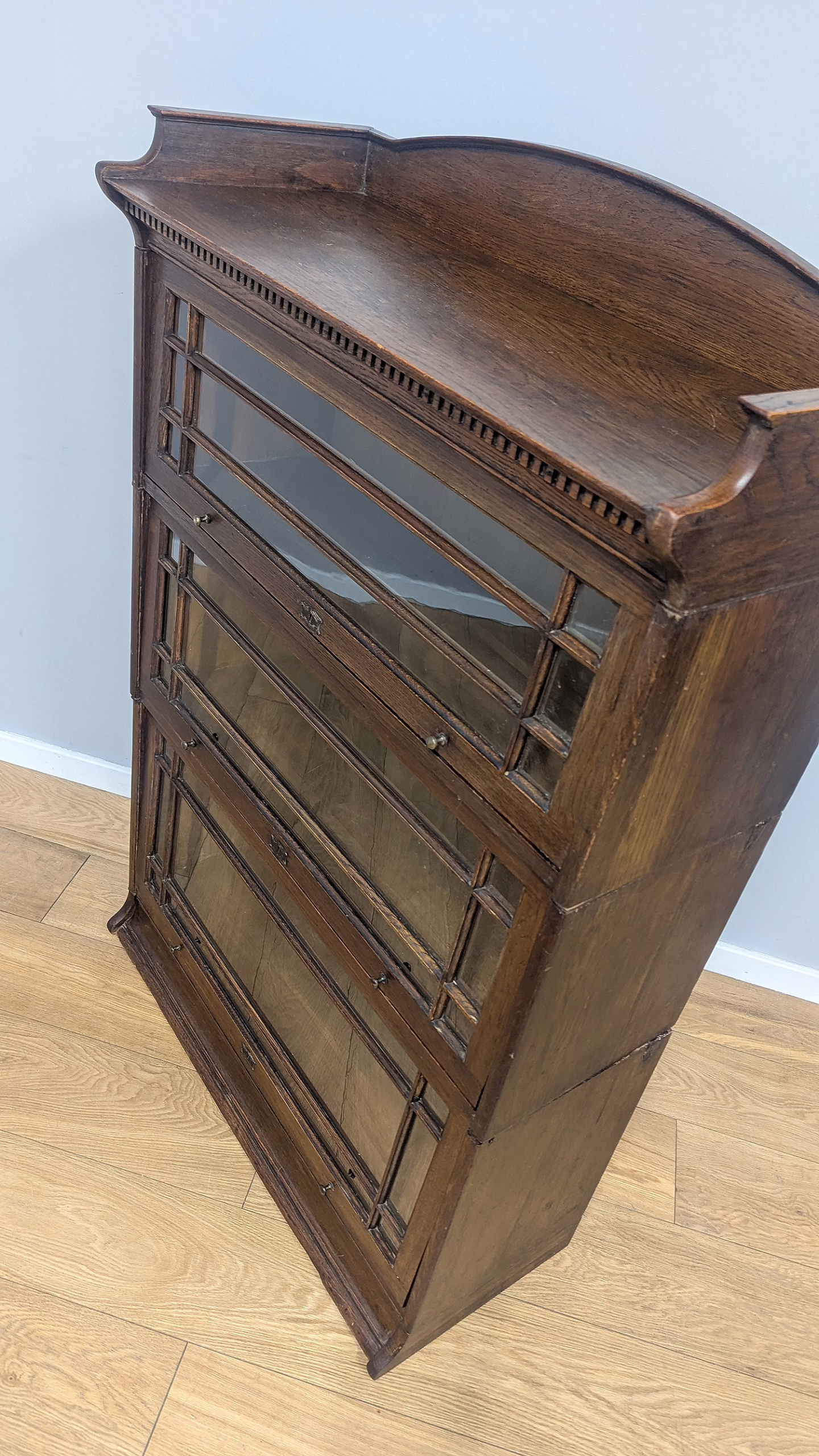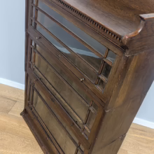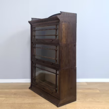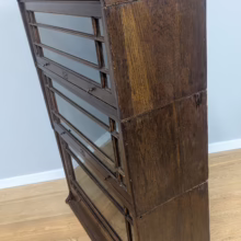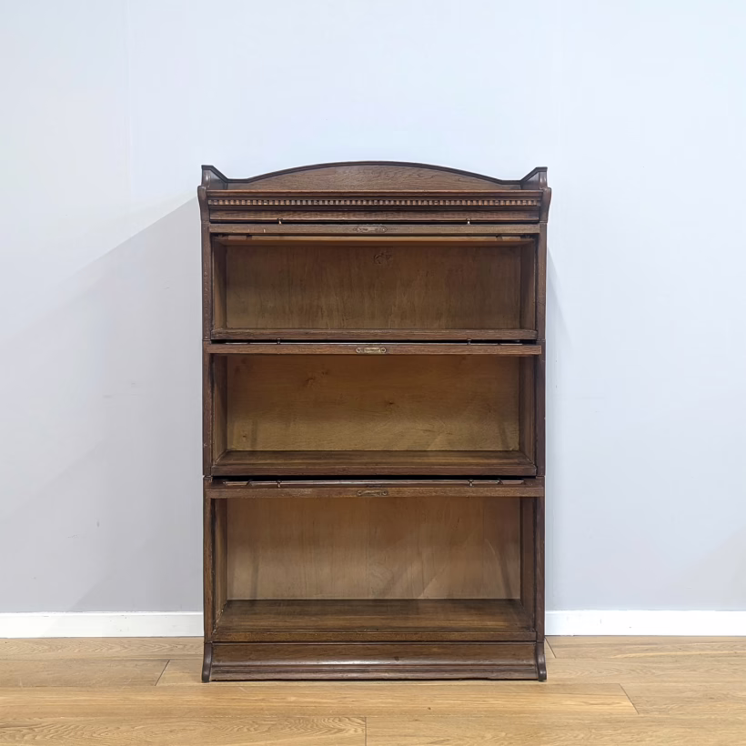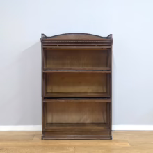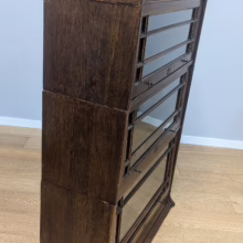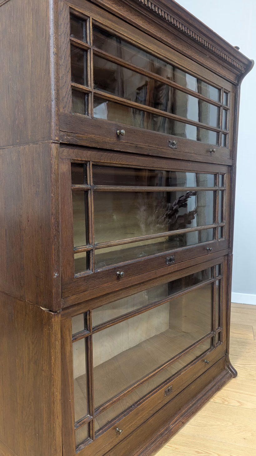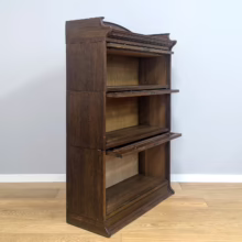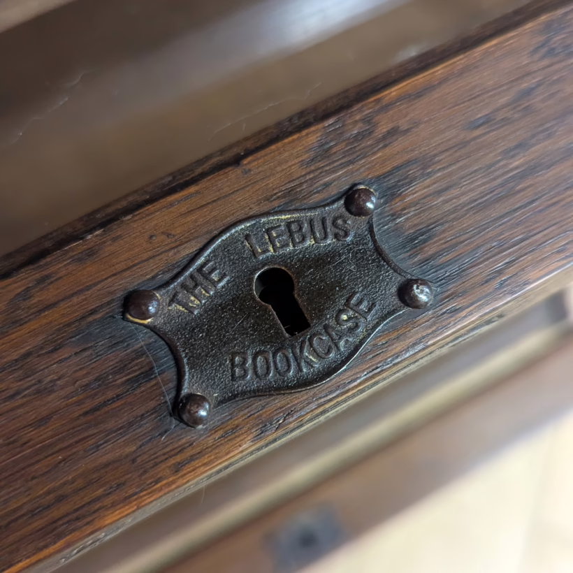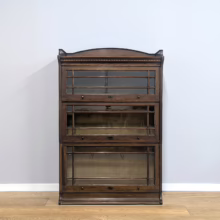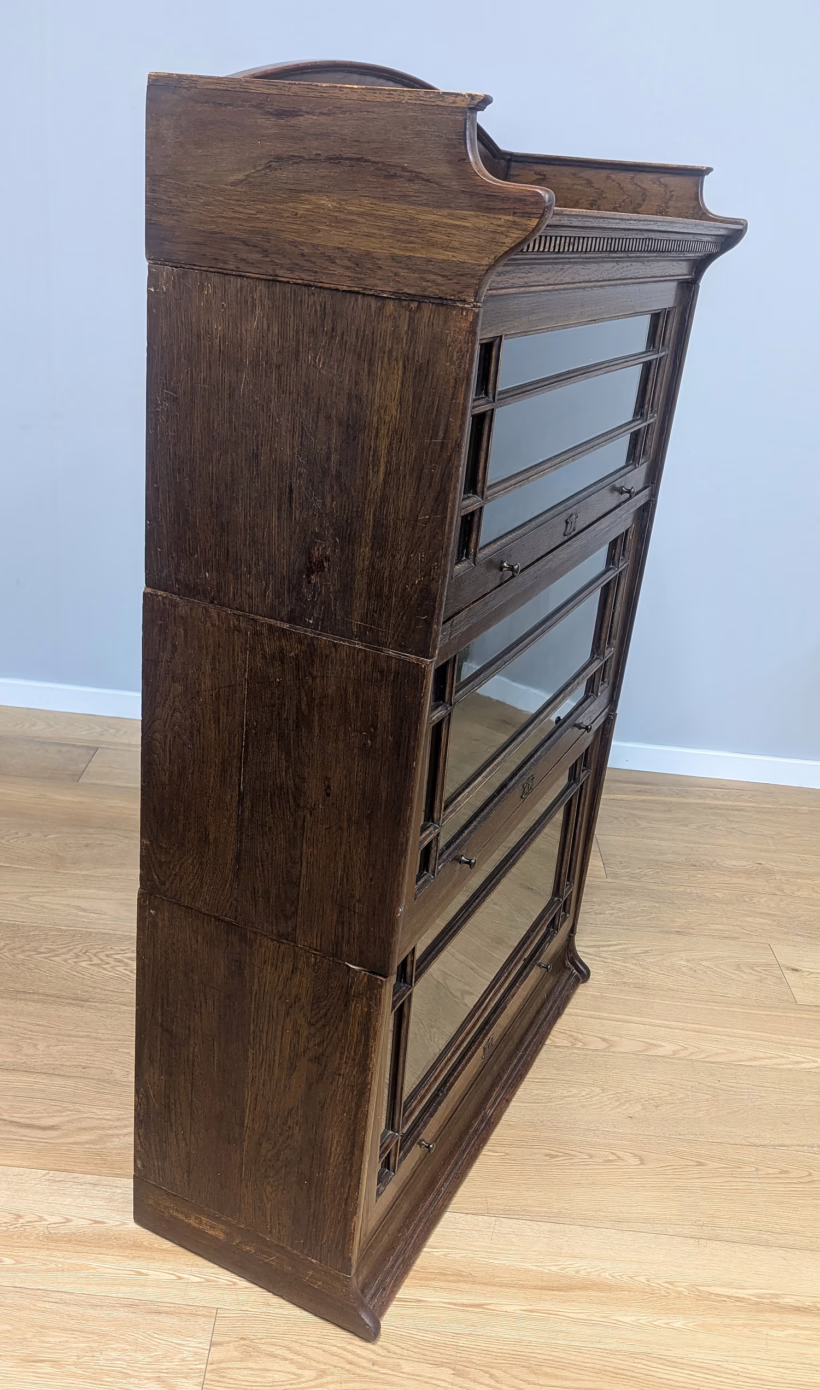 This is an original, vintage piece that is ‘sold as seen’. It is in good, used condition. It has been checked and cleaned inside and out, and we have applied a natural beeswax polish to revive the wood on the exterior surfaces but otherwise the finish is all original. There are five stacking sections in total – the top section with an additional open shelf, three graduated glazed bookcases and the base section. They simply slot on top of one another with no tools required. It is a freestanding piece. The glass doors of the three bookcases lift up and slide back and there are no cracked panels. They lift and move with ease although we would advise this is done with a gentle touch. The brass buttons handles are original and securely attached, and the Lebus name is seen on the brass lock escutcheons. Sadly we do not have the keys. The bookcase interiors are clean and tidy with some light superficial marks and scuffs from use as shown in our photos. As you would expect with an antique item such as this, there are signs of wear and tear here and there on the exterior surfaces, primarily concentrated on the back. There is some missing plywood on one section, a small hole in another, along with various other knocks and bruises as we’ve shown. We spotted a handful of historical woodworm holes in the base section but there is nothing active and likely hasn’t been for decades. When stacked the bookcase is solid and stable, slotting into place easily. We believe it is mahogany. Do browse through our photos for a good sense of its condition. If you would like us to share a video of the piece with you via WhatsApp drop us a line – we’d be very happy to oblige. Likewise, if you’ve any queries, just get in touch.