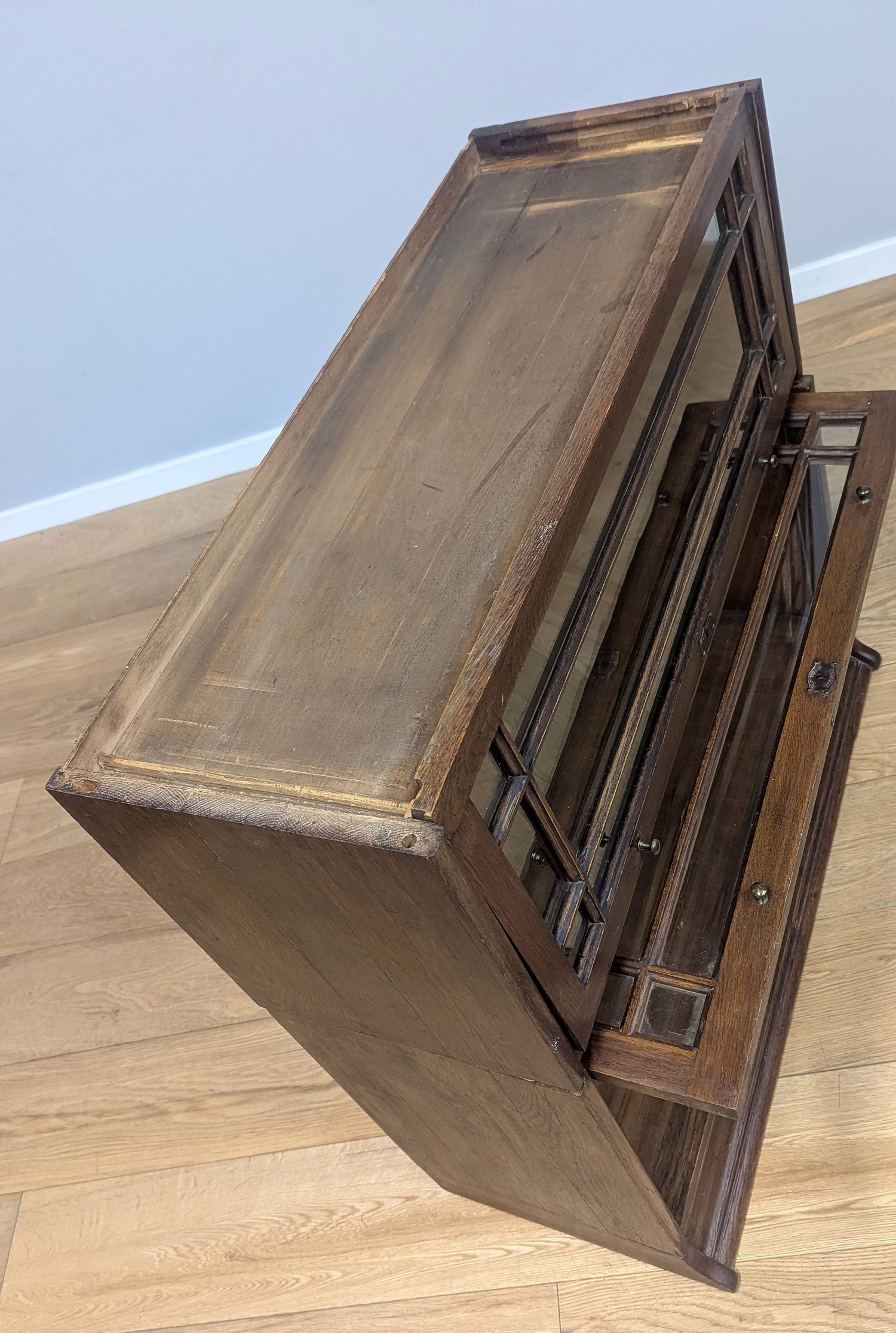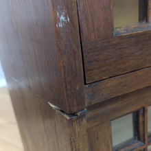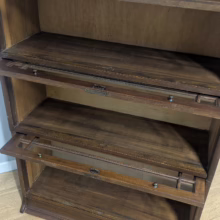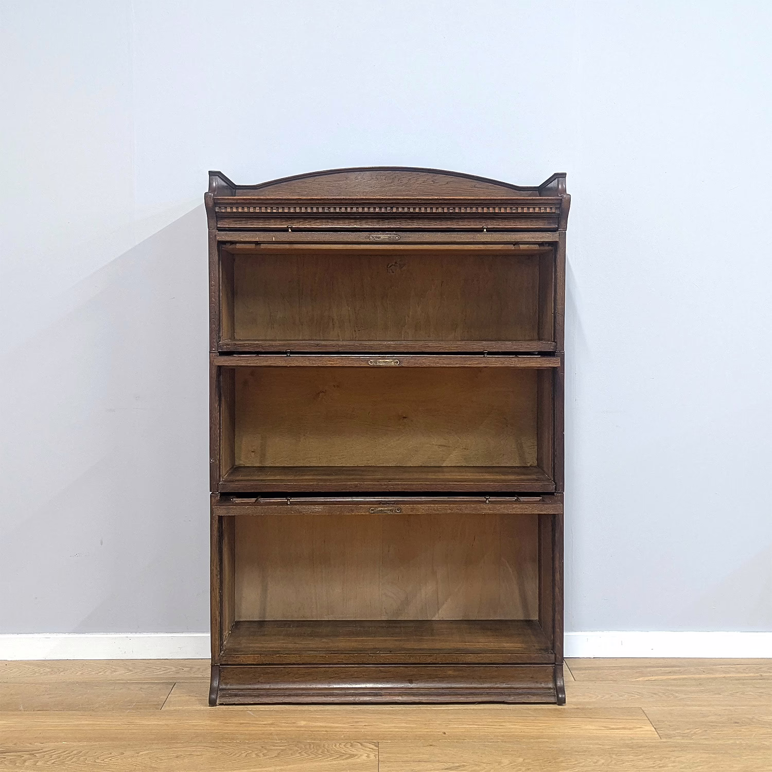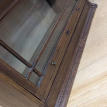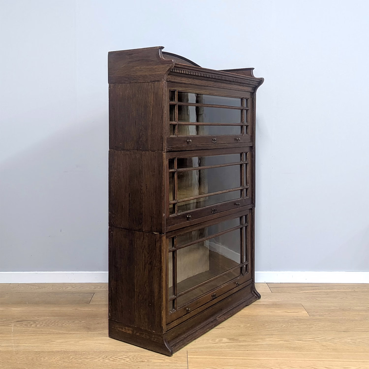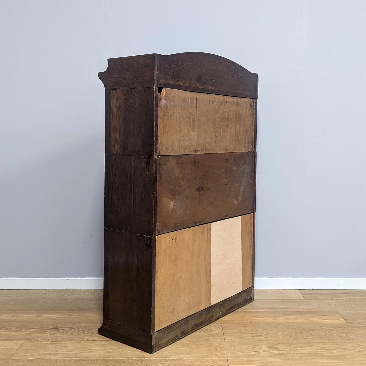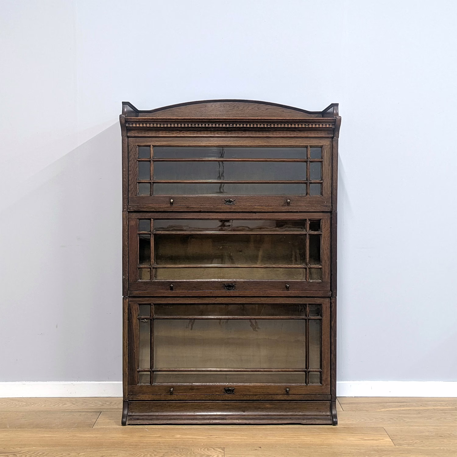 This is an original, vintage piece that is ‘sold as seen’. It is in good, used condition. It has been checked and cleaned inside and out, and we have applied a natural beeswax polish to revive the wood on the exterior surfaces but otherwise the finish is all original. There are five stacking sections in total – the top section with an additional open shelf, three graduated glazed bookcases and the base section. They simply slot on top of one another with no tools required. It is a freestanding piece. The glass doors of the three bookcases lift up and slide back and there are no cracked panels. They lift and move with ease although we would advise this is done with a gentle touch. The brass buttons handles are original and securely attached, and the Lebus name is seen on the brass lock escutcheons. Sadly we do not have the keys. The bookcase interiors are clean and tidy with some light superficial marks and scuffs from use as shown in our photos. As you would expect with an antique item such as this, there are signs of wear and tear here and there on the exterior surfaces, primarily concentrated on the back. There is some missing plywood on one section, a small hole in another, along with various other knocks and bruises as we’ve shown. We spotted a handful of historical woodworm holes in the base section but there is nothing active and likely hasn’t been for decades. When stacked the bookcase is solid and stable, slotting into place easily. We believe it is mahogany. Do browse through our photos for a good sense of its condition. If you would like us to share a video of the piece with you via WhatsApp drop us a line – we’d be very happy to oblige. Likewise, if you’ve any queries, just get in touch.