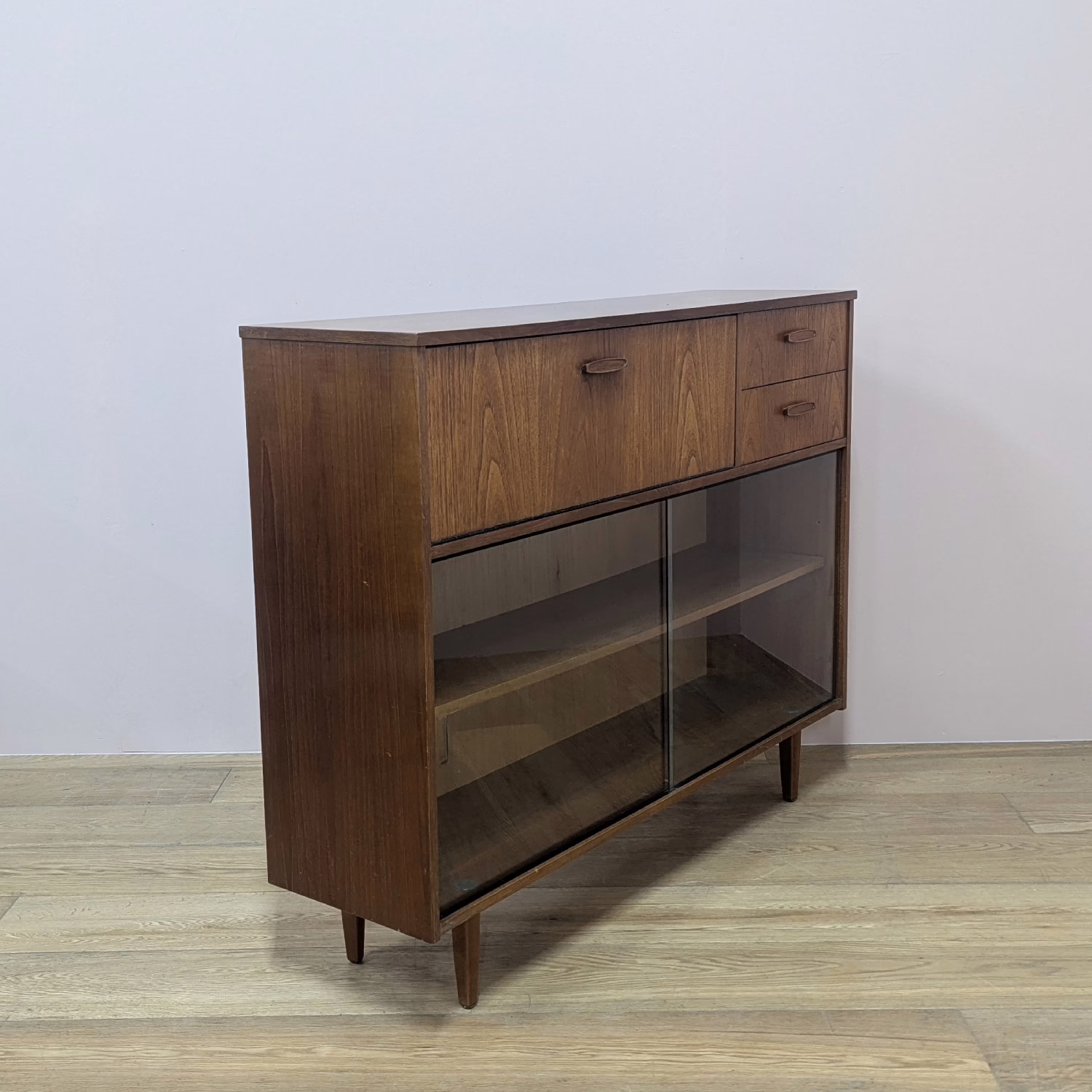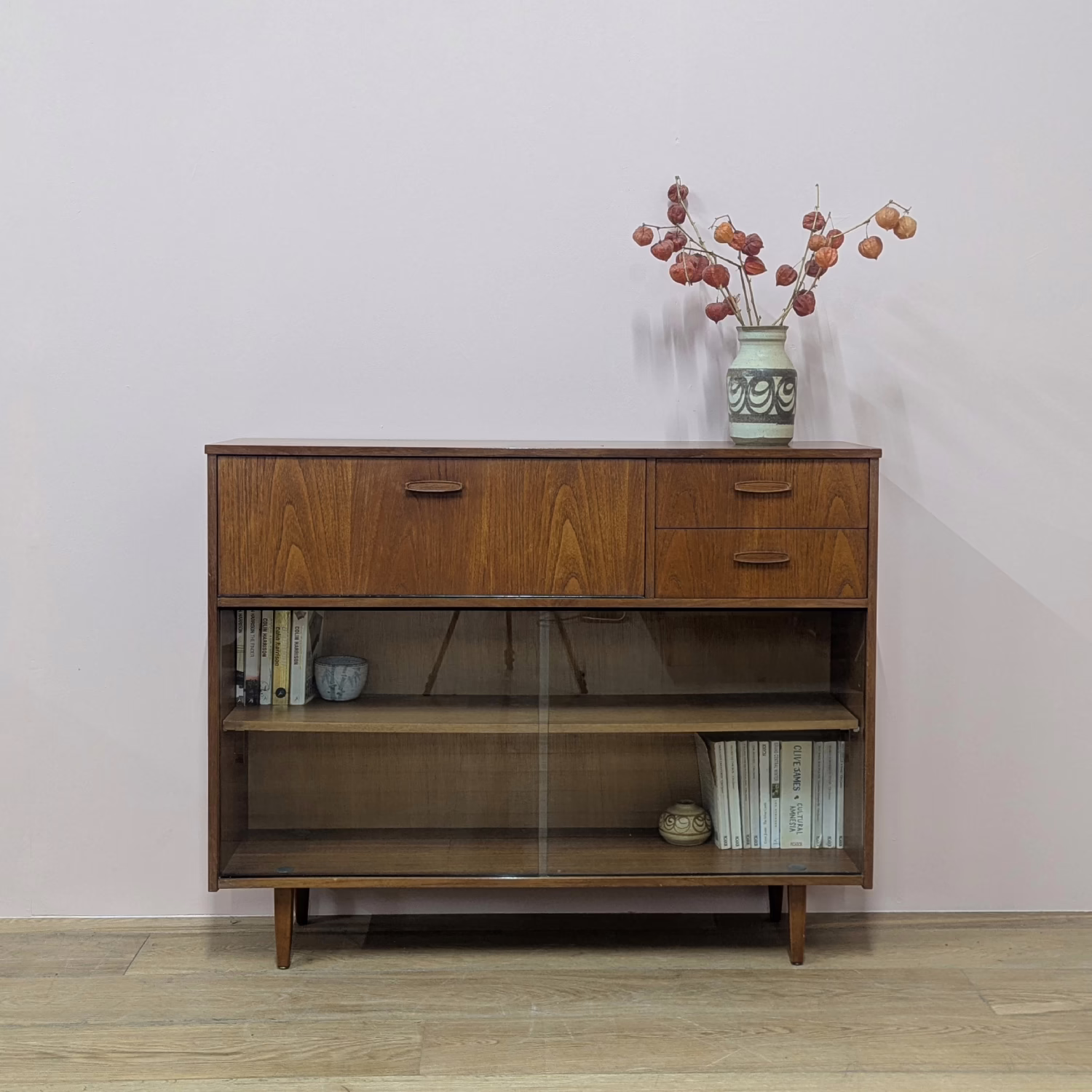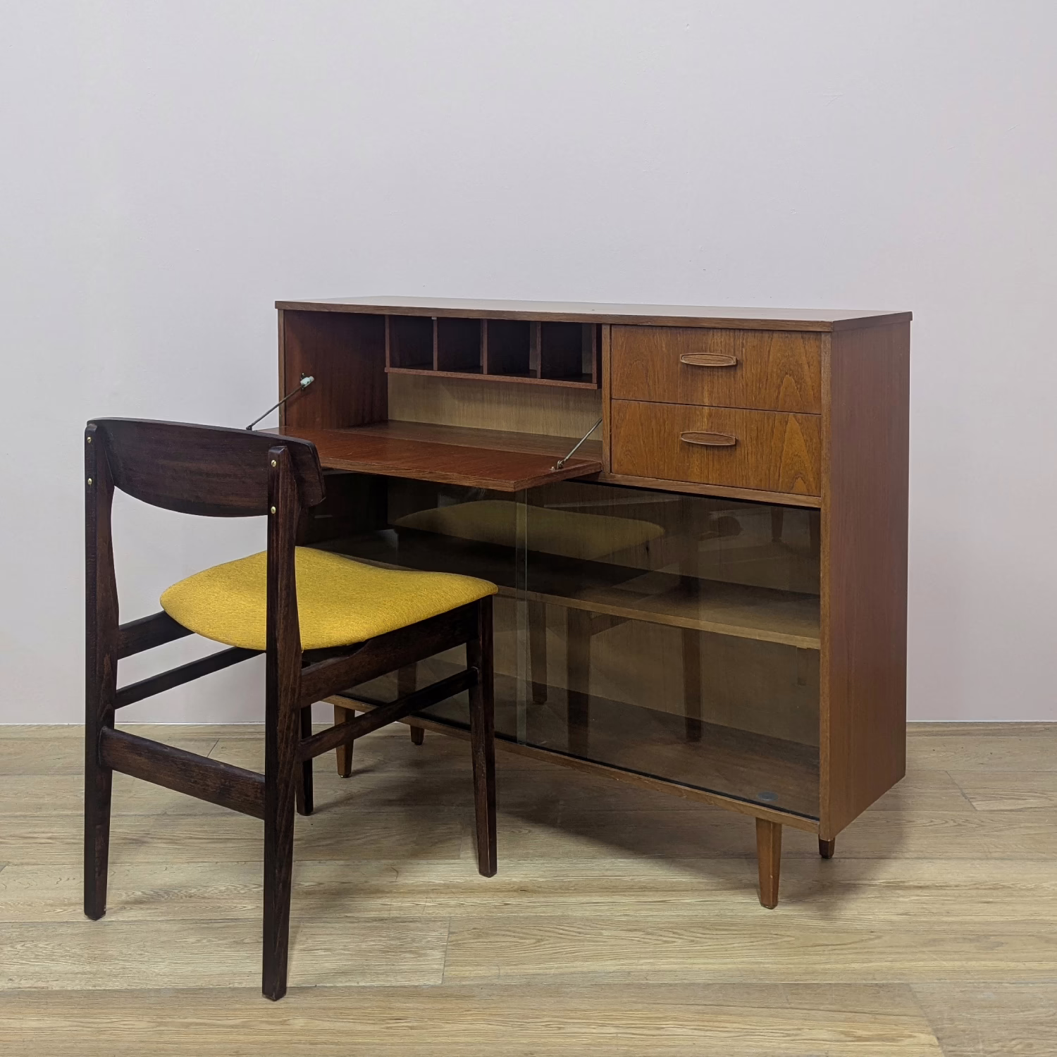 This is an original, vintage cabinet that ‘sold as seen’. It is in good – very good, used condition. We have thoroughly checked and cleaned this piece inside and out, reviving the wood with a natural beeswax polish but otherwise the finish is original. It’s in great order with just minor signs of wear and tear in line with its age. The lower glazed section features two glass doors which slide with ease in their runners. Inside there is an adjustable shelf and the interior is clean and tidy here. In the upper section there are two drawers and a small, fall-door bureau with further pigeonhole storage inside. Again, the interiors are in good, clean order with just light signs of use. All hinges and handles are securely attached and in good order too. It’s stable, solid and very well-made with no repairs or areas of concern. The Avalon maker’s mark can be seen inside the top drawer. Please browse our photos for an accurate account of this item. Any queries, do get in touch.