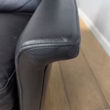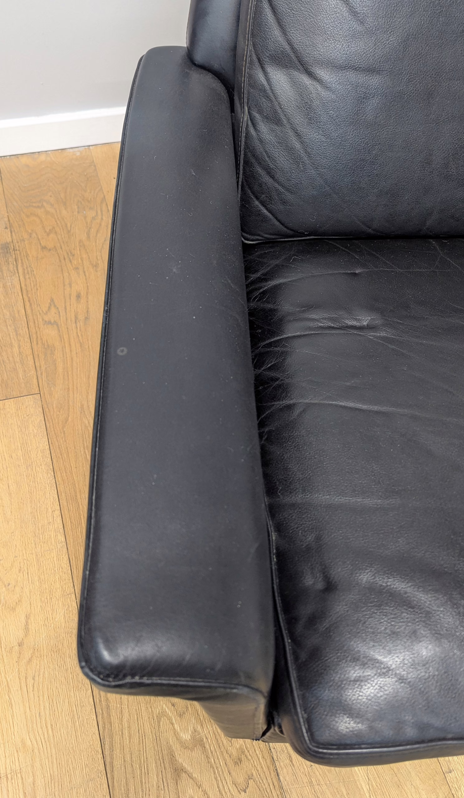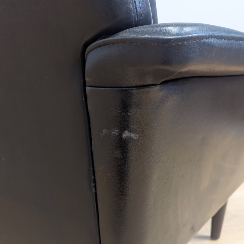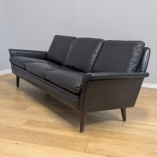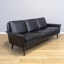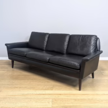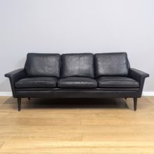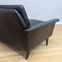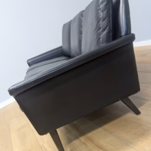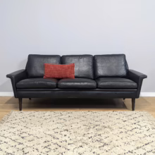 Low profile, dark and rather masculine, this vintage Danish sofa is as stylish as they come. We love the winged arms that strike a pose from all sides. We love too the angle of the back legs, creating a dramatic profile viewed from the ends. With soft, supple black leather cushions, it doesn’t sacrifice comfort for good looks. The tilt, the generous seat depth, the supple upholstery make this a loungey, inviting couch. A quality sofa, expertly designed and crafted, ready to serve a busy household. Leather is a superb option for high traffic living spaces – it’s robust, easy to clean and able to withstand the rigours of busy family life.
