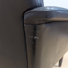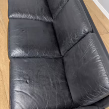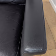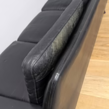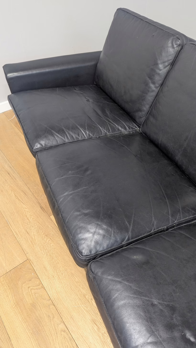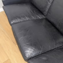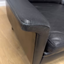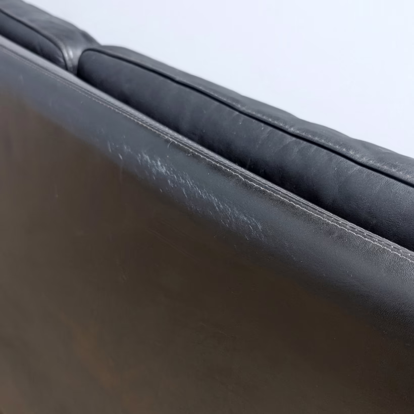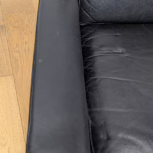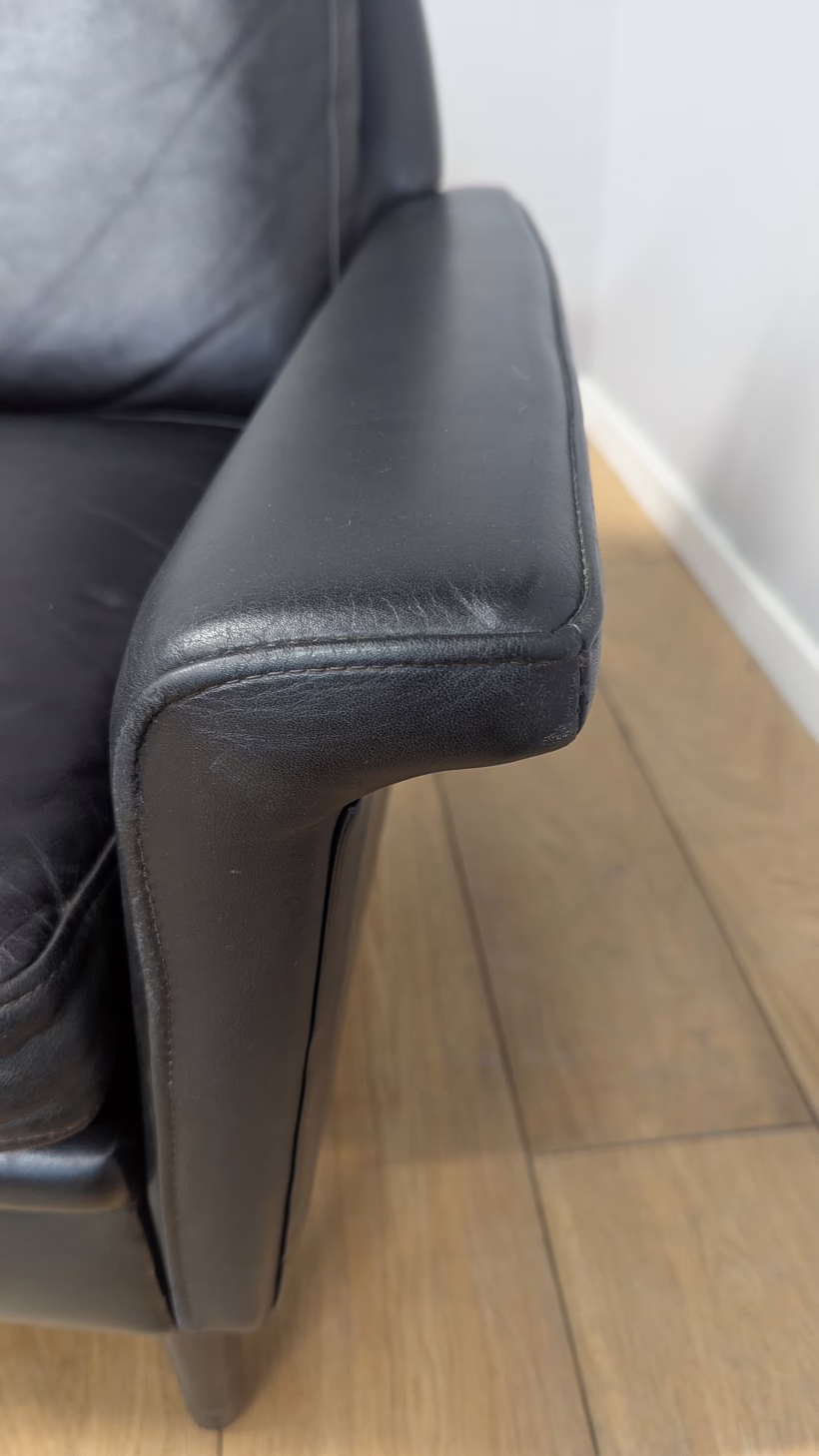 This original, vintage sofa is ‘sold as seen’. It is in good, used condition. We have checked and cleaned the sofa, applying a natural beeswax polish to the solid wood legs and a natural, nourishing balm to the leather upholstery, both the fixed and the cushions. There are six separate cushions, all in good – very good order with plump inners and working zips. These cushions simply sit on the frame. The cushion leather is a little wrinkled here and there on top through use, and there is some sunlight fading on the top of one of the back cushions, as shown, but otherwise the wear is minimal. The fixed leather upholstery on the frame is in good order too, holding the form of the frame tightly. There are some scuffs and blemishes to the leather here and there which is shown across our photos including a small knock on the bottom back corner. Overall, these are minor signs of wear to the leather, in line with what we might expect on a piece of this age. The finishing cloth underneath the cushions is lightly marked but nothing unsavoury. The sofa is really well-made, solid and stable with no repairs or concerns. There is no maker’s mark but it was imported from directly from Denmark and dates from the late 1960s / early 1970s. If you have any queries or would like to view this sofa, just get in touch.