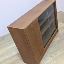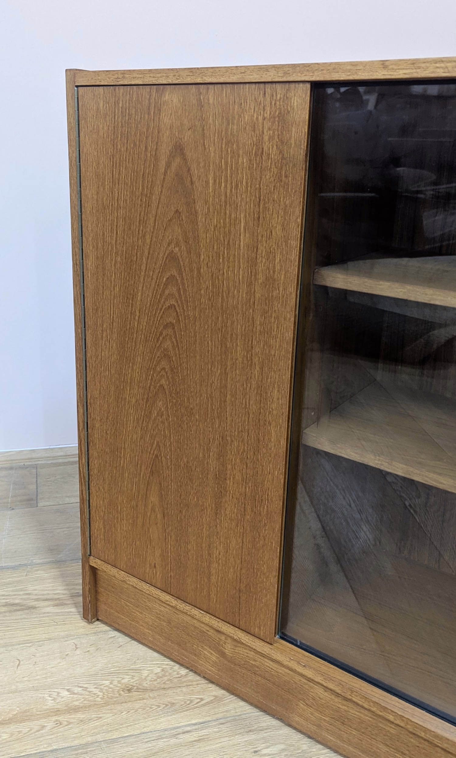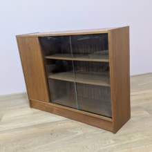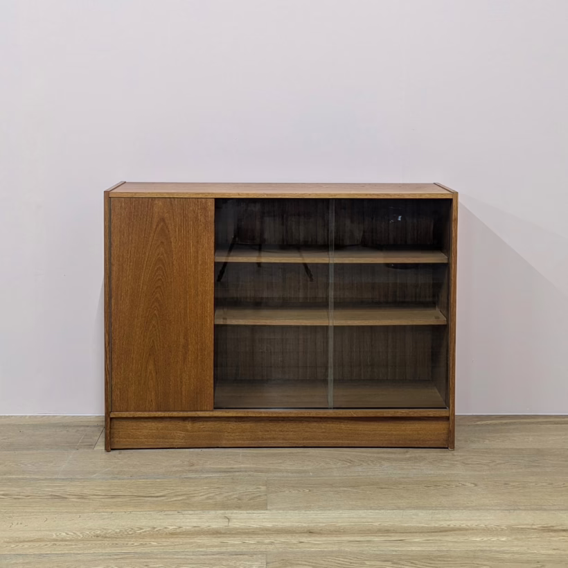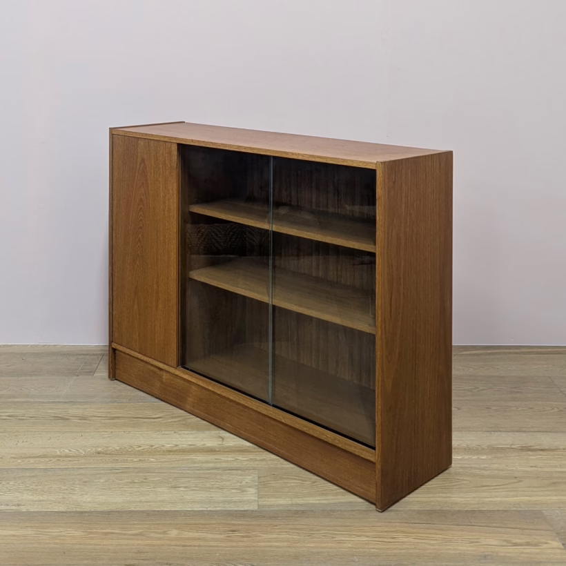 This original, vintage cabinet is ‘sold as seen’. Overall it is in good – very good, used condition. The piece has been cleaned, inside and out, and a natural beeswax polish applied and buffed on the external surfaces, but otherwise the finish is original. The left hand cupboard has a recessed handle with hinges and closures in good working order and a clean interior. There are two adjustable shelves in the cupboard. The right hand side features a glazed bookcase / display cabinet and a further two adjustable shelves. Again, the interior is in clean order and there are glass doors that slide well. The external surfaces have some light marks and scuffs which overall is minor – do look through our photos for an true sense of its condition. There’s no maker’s mark but this is a nicely made, stable piece, British in origin and with no areas of concern. Any queries, please get in touch.
