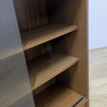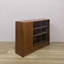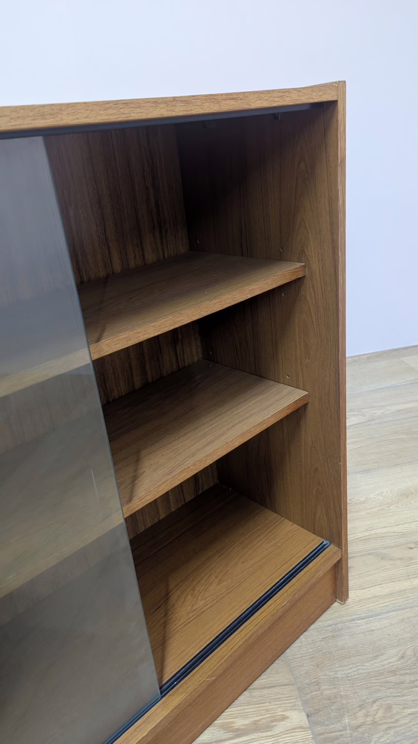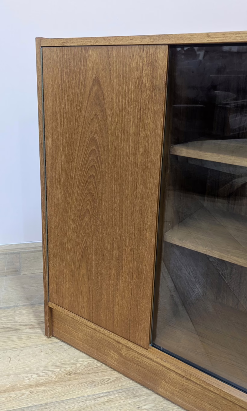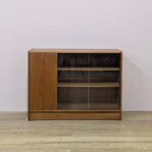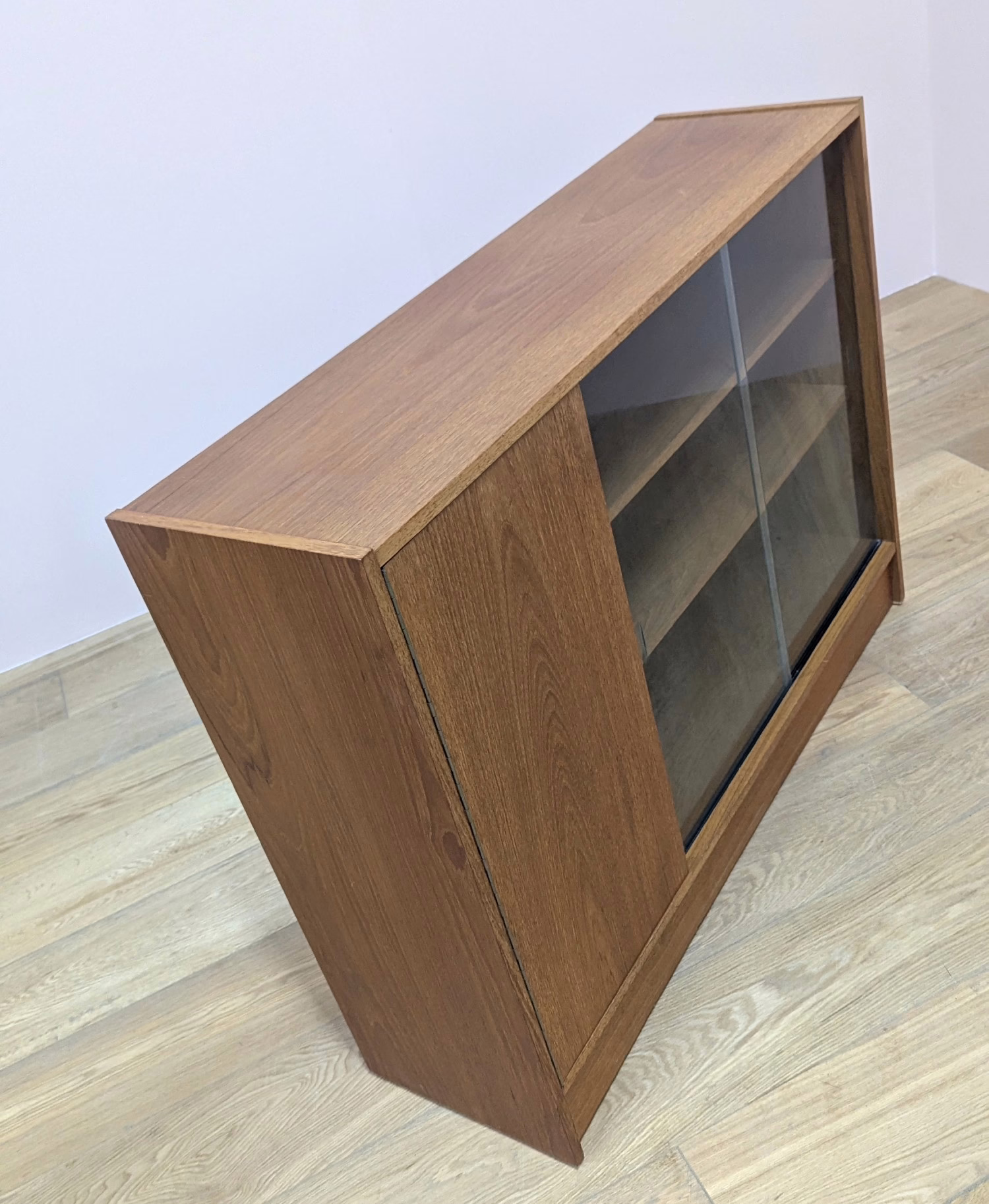 This original, vintage cabinet is ‘sold as seen’. Overall it is in good – very good, used condition. The piece has been cleaned, inside and out, and a natural beeswax polish applied and buffed on the external surfaces, but otherwise the finish is original. The left hand cupboard has a recessed handle with hinges and closures in good working order and a clean interior. There are two adjustable shelves in the cupboard. The right hand side features a glazed bookcase / display cabinet and a further two adjustable shelves. Again, the interior is in clean order and there are glass doors that slide well. The external surfaces have some light marks and scuffs which overall is minor – do look through our photos for an true sense of its condition. There’s no maker’s mark but this is a nicely made, stable piece, British in origin and with no areas of concern. Any queries, please get in touch.