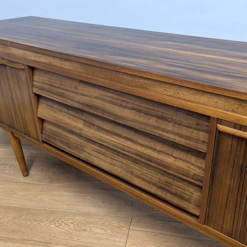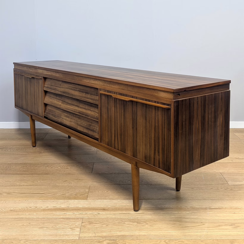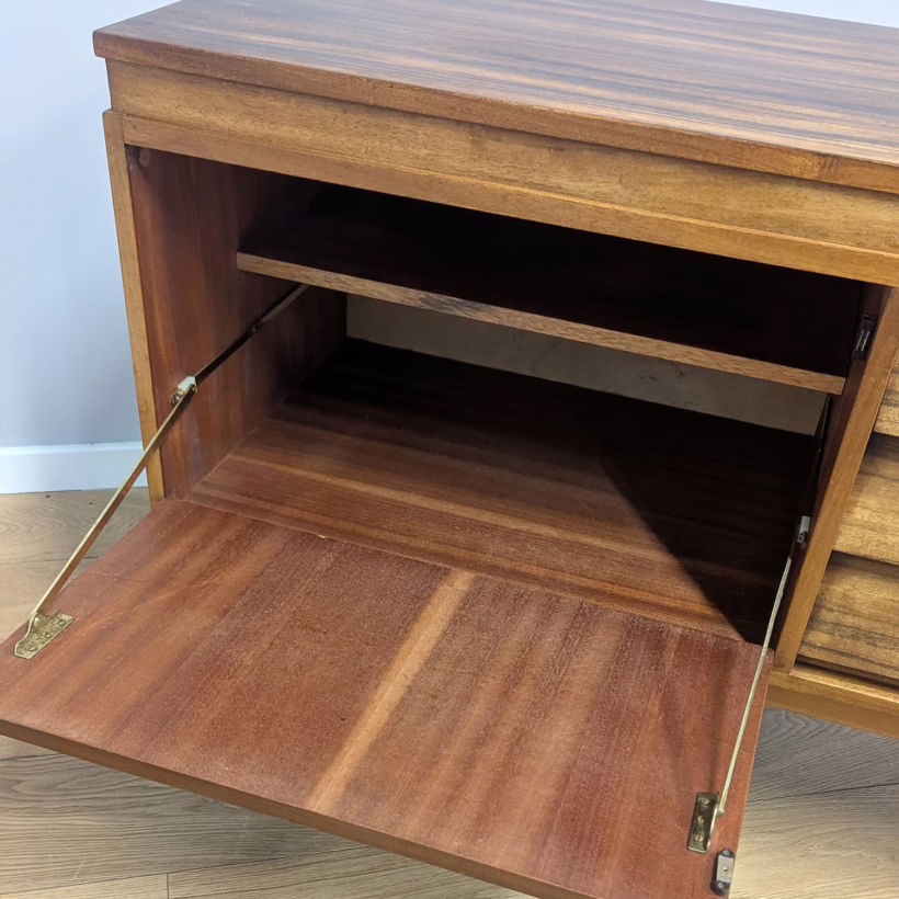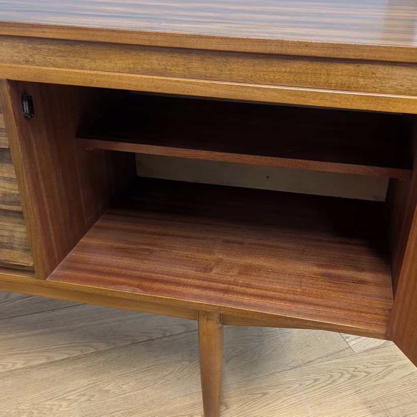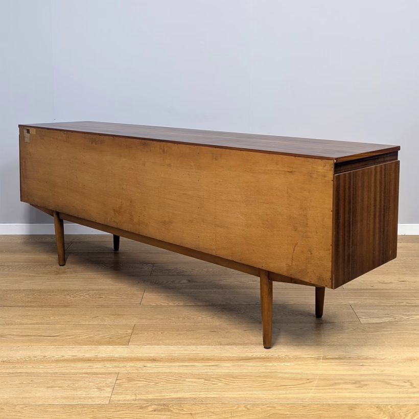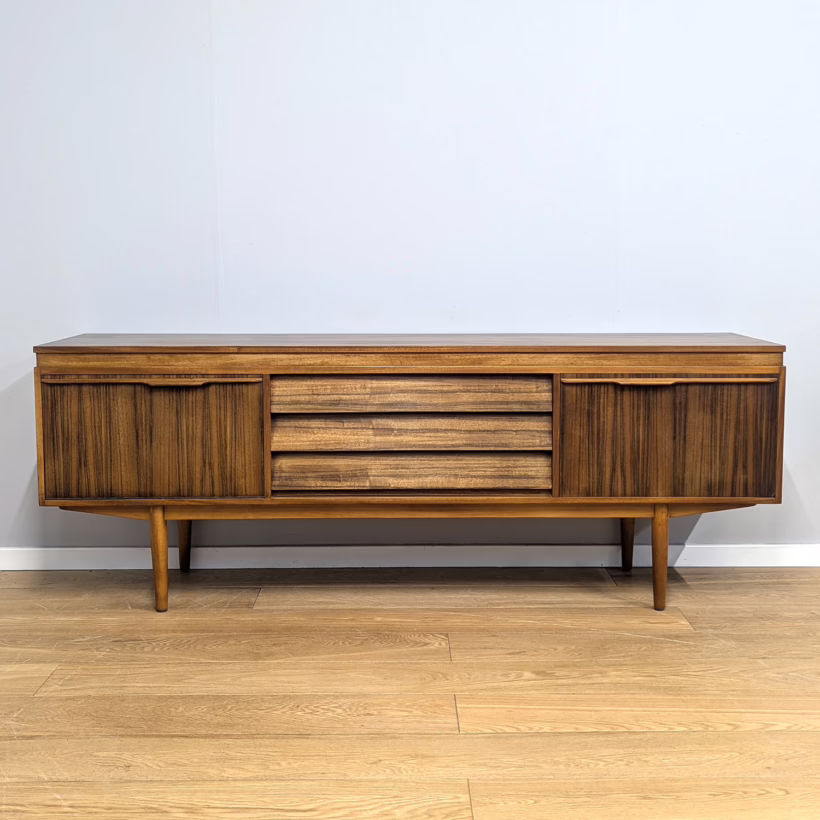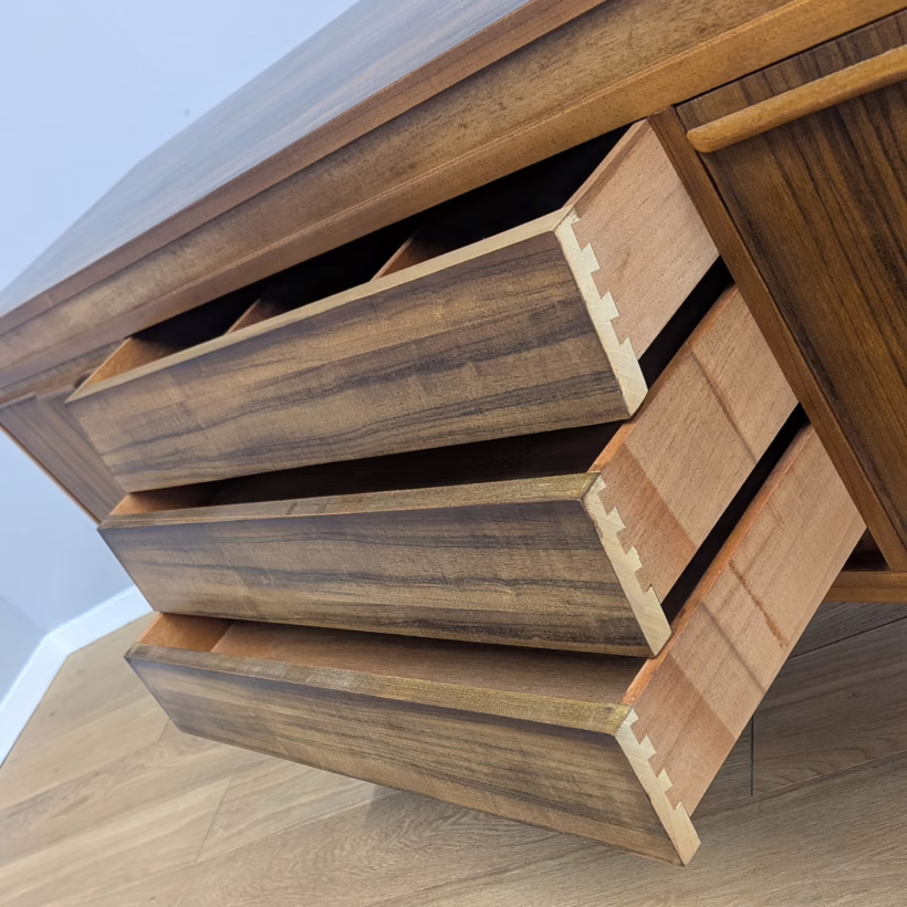 This original, vintage sideboard is ‘sold as seen’. Overall it is in good – very good, used condition. The piece has been checked, cleaned inside and out, and a natural beeswax polish applied and buffed on the external surfaces, but otherwise the finish is original. The three, centred ‘beehive’ drawers slide with ease, have clean interiors and are well-made with dovetail joints. The top drawer is sectioned and green felt-lined for cutlery. The left hand cupboard features a fall door and removable internal shelf, designed for bottles. The right hand cupboard features a recessed shelf which can be removed. All hinges, closures and handles are in very good order and both cupboards have clean, tidy interiors with just light signs of use. There are light marks and dents here and there on the exterior wood surfaces, very minor signs of use in line with its age. We have made a professional repair to the left hand side rear leg as the wood had split here – see our photo. The repair isn’t noticeable and it’s now as strong as ever. It’s an expertly crafted piece of furniture, very well-made, thoughtfully designed and sturdy. There is no maker’s stamp but this is a well-documented Morris of Glasgow piece that we attribute with 100% confidence. Do browse our photos for a good sense of its fine condition. If you’ve any questions, please do get in touch. Very happy to help.