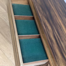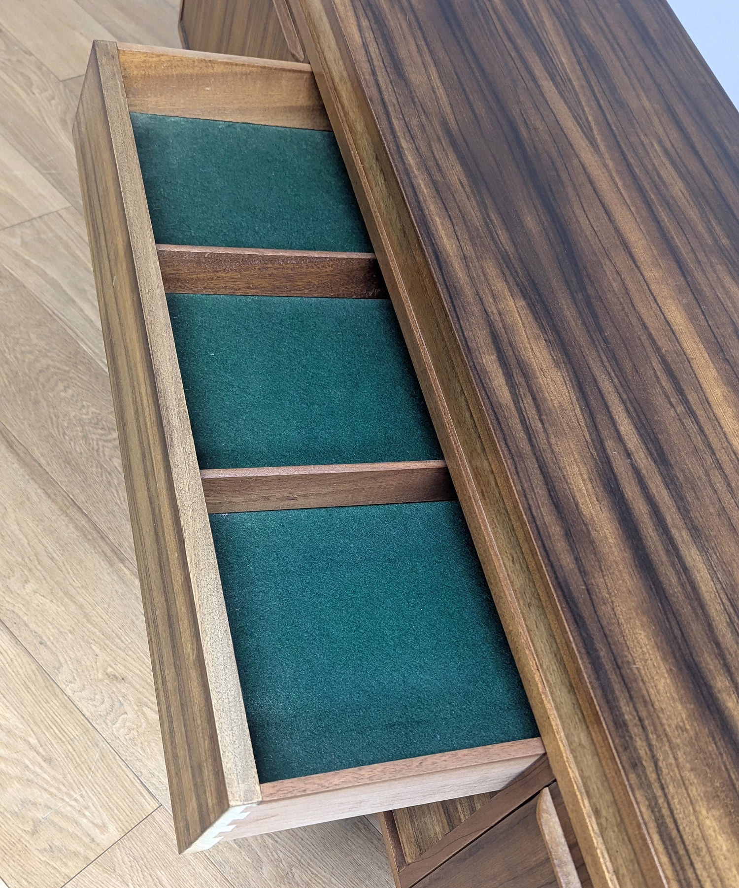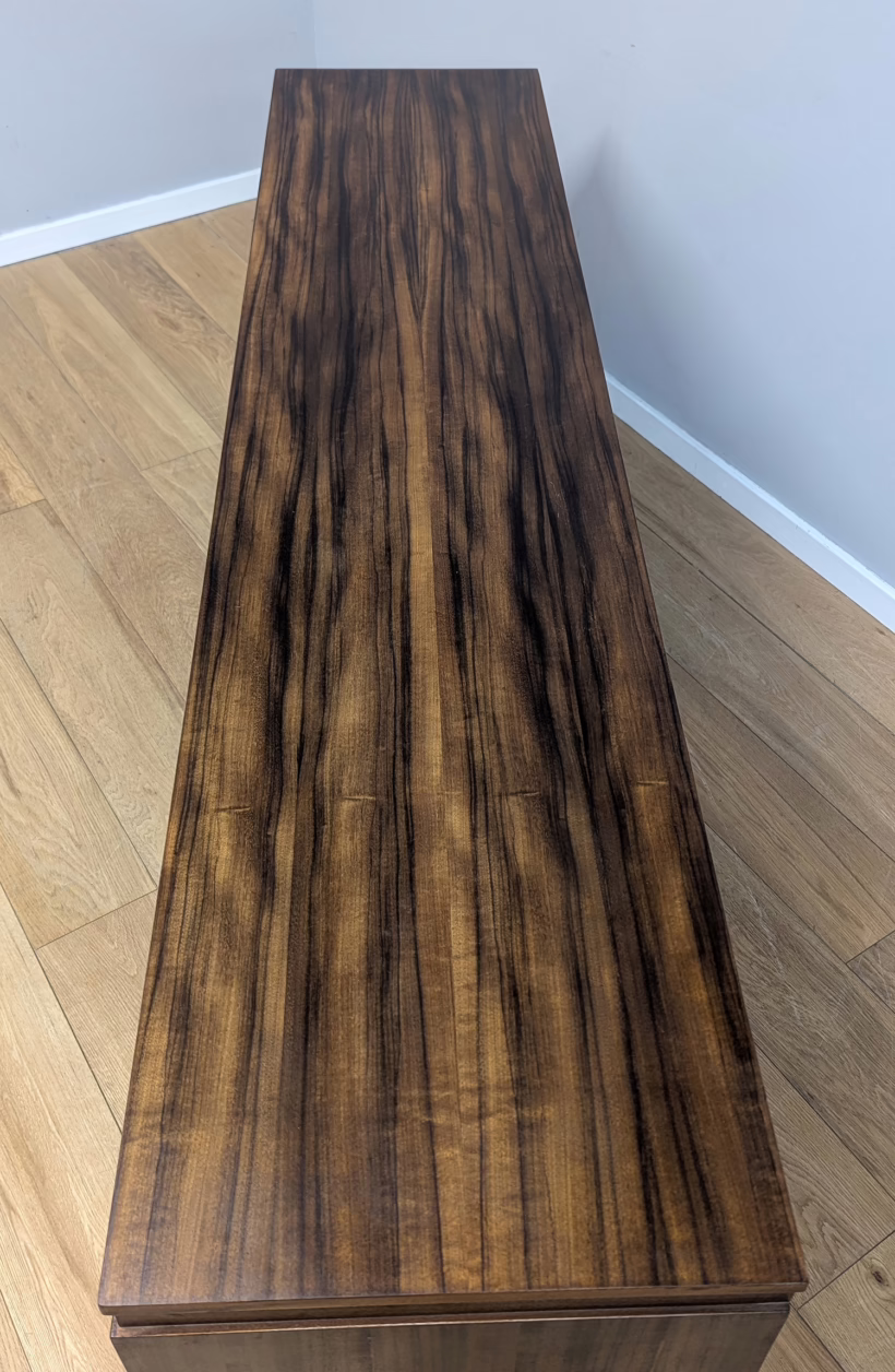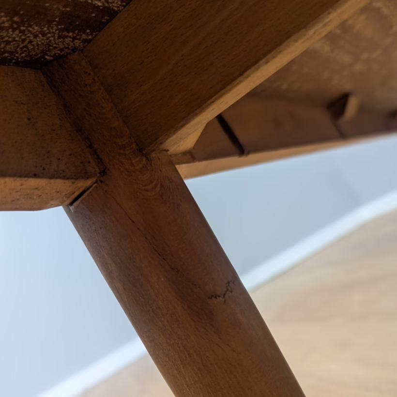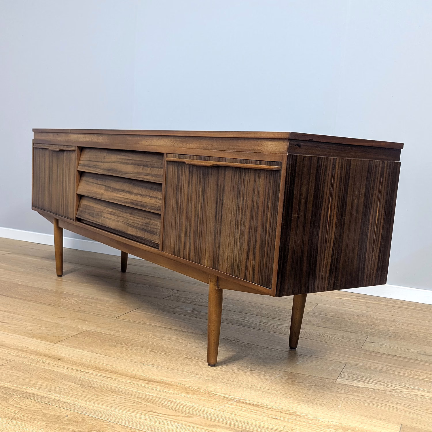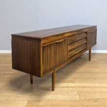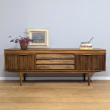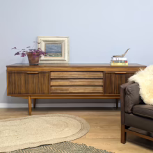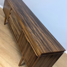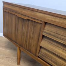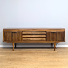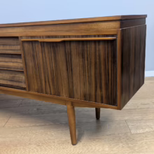 This original, vintage sideboard is ‘sold as seen’. Overall it is in good – very good, used condition. The piece has been checked, cleaned inside and out, and a natural beeswax polish applied and buffed on the external surfaces, but otherwise the finish is original. The three, centred ‘beehive’ drawers slide with ease, have clean interiors and are well-made with dovetail joints. The top drawer is sectioned and green felt-lined for cutlery. The left hand cupboard features a fall door and removable internal shelf, designed for bottles. The right hand cupboard features a recessed shelf which can be removed. All hinges, closures and handles are in very good order and both cupboards have clean, tidy interiors with just light signs of use. There are light marks and dents here and there on the exterior wood surfaces, very minor signs of use in line with its age. We have made a professional repair to the left hand side rear leg as the wood had split here – see our photo. The repair isn’t noticeable and it’s now as strong as ever. It’s an expertly crafted piece of furniture, very well-made, thoughtfully designed and sturdy. There is no maker’s stamp but this is a well-documented Morris of Glasgow piece that we attribute with 100% confidence. Do browse our photos for a good sense of its fine condition. If you’ve any questions, please do get in touch. Very happy to help.