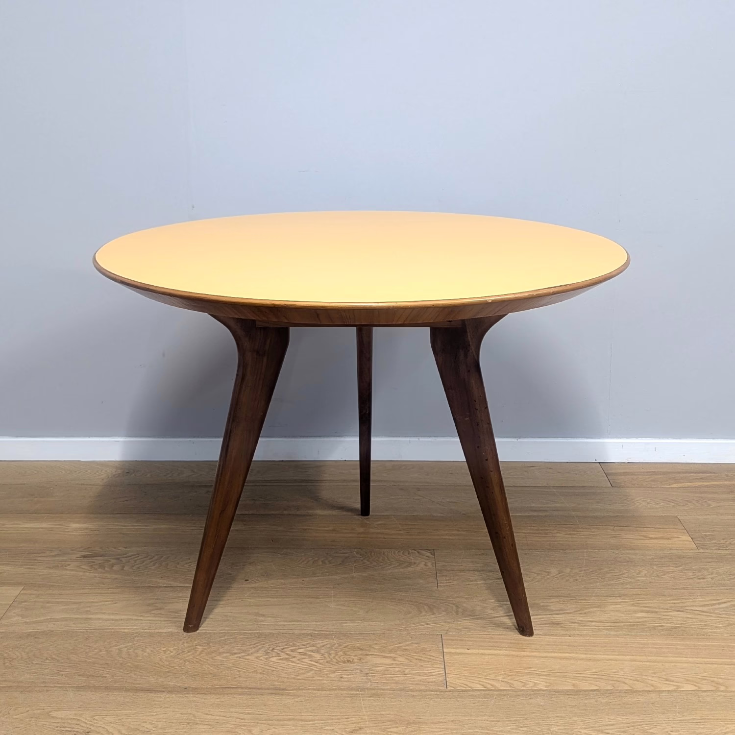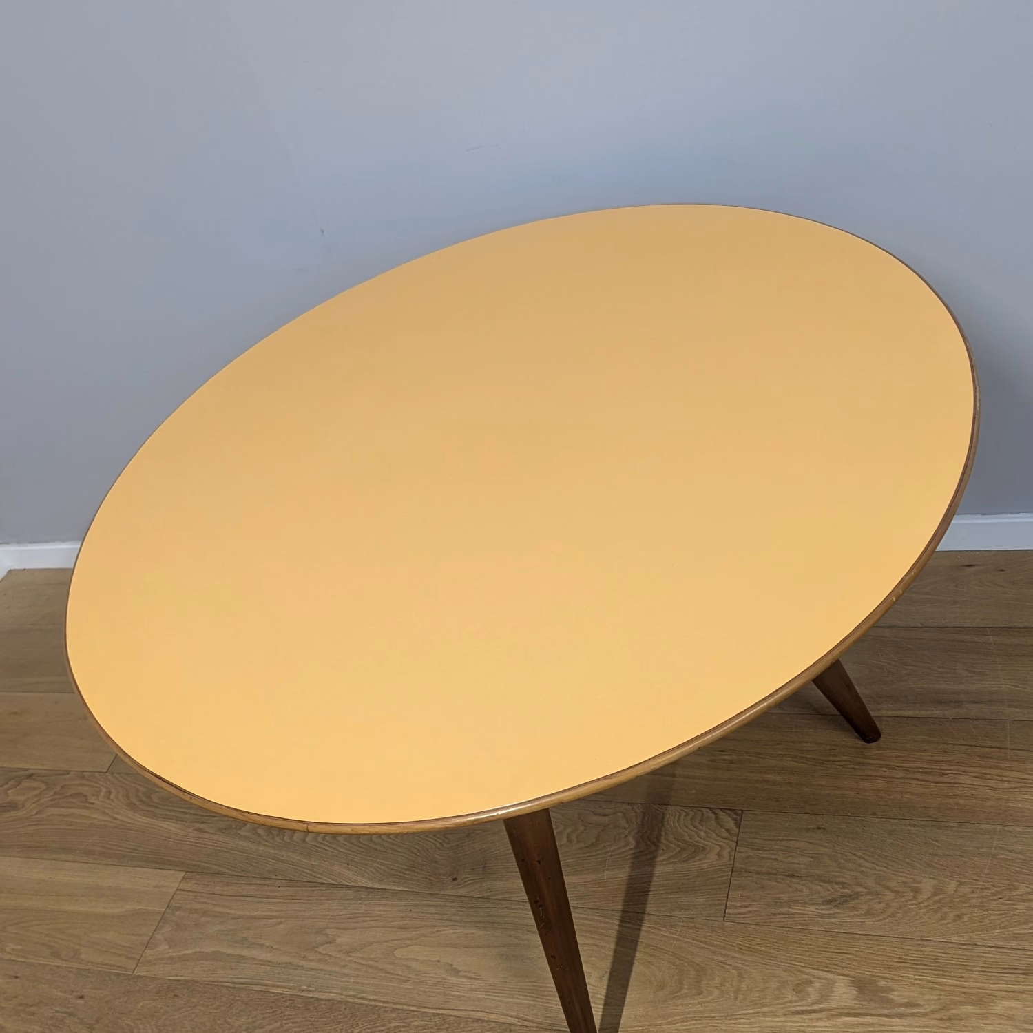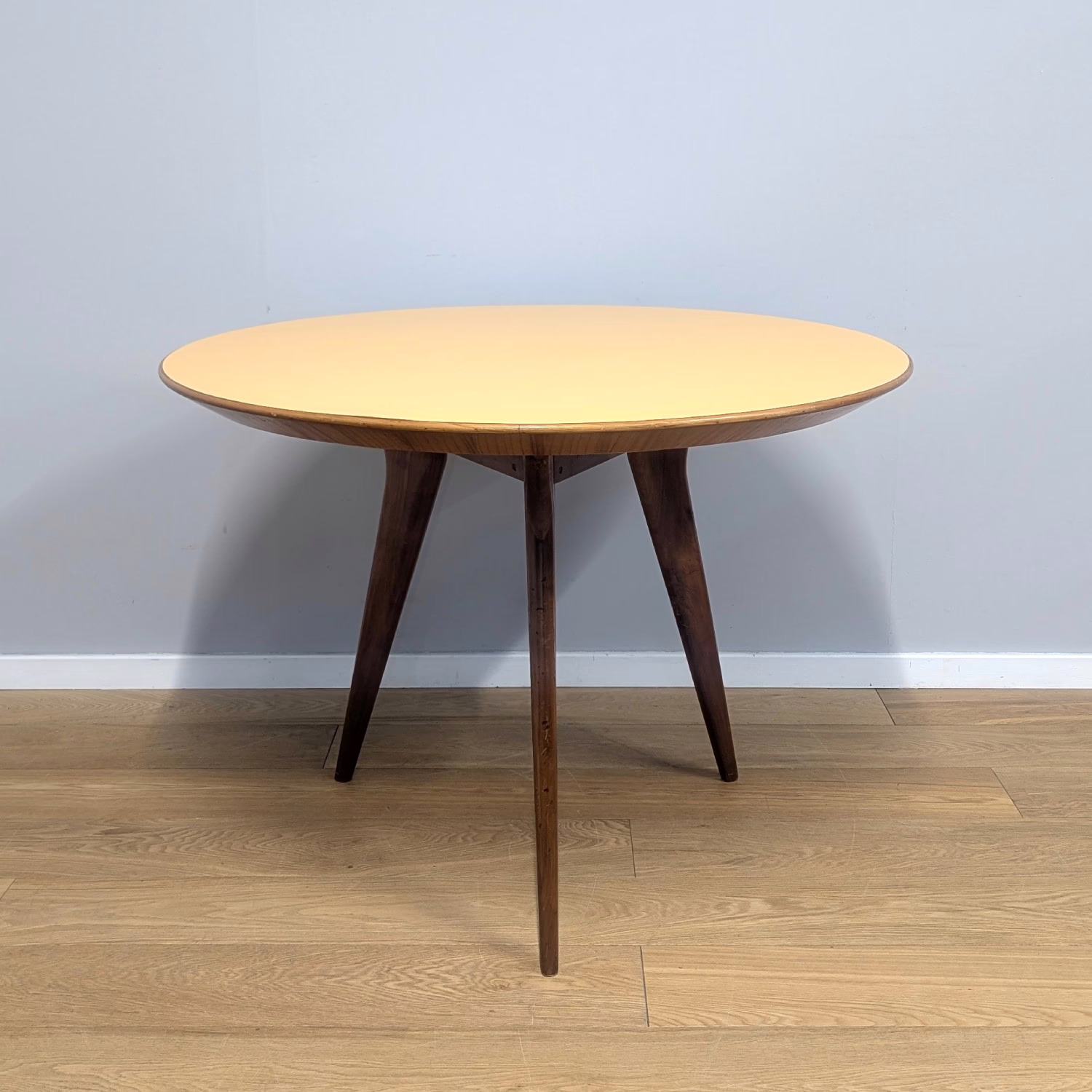 This original, vintage table is ‘sold as seen’. It is in good – very good, used condition. We have checked and cleaned the table, reviving its original finish with a natural beeswax polish. The yellow Formica table top is in very good order with just superficial scuffs and marks from use. The thick bevelled edge has a few knocks and dents here and there, as we’ve shown, as do the trio of legs but this is in line with what we would expect with a vintage piece of this age – do browse our photos for an accurate representation of tone and condition. It is solid and sturdy with no wobbles or signs of repair. There is no maker’s mark but research tells us it’s Italian in origin and it dates from the 1960s. If you’ve any questions or would like to take a look at this table, please get in touch.