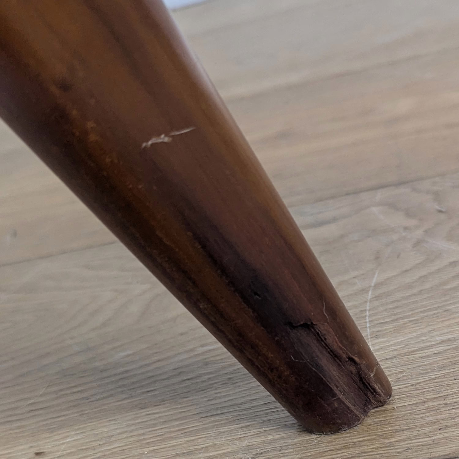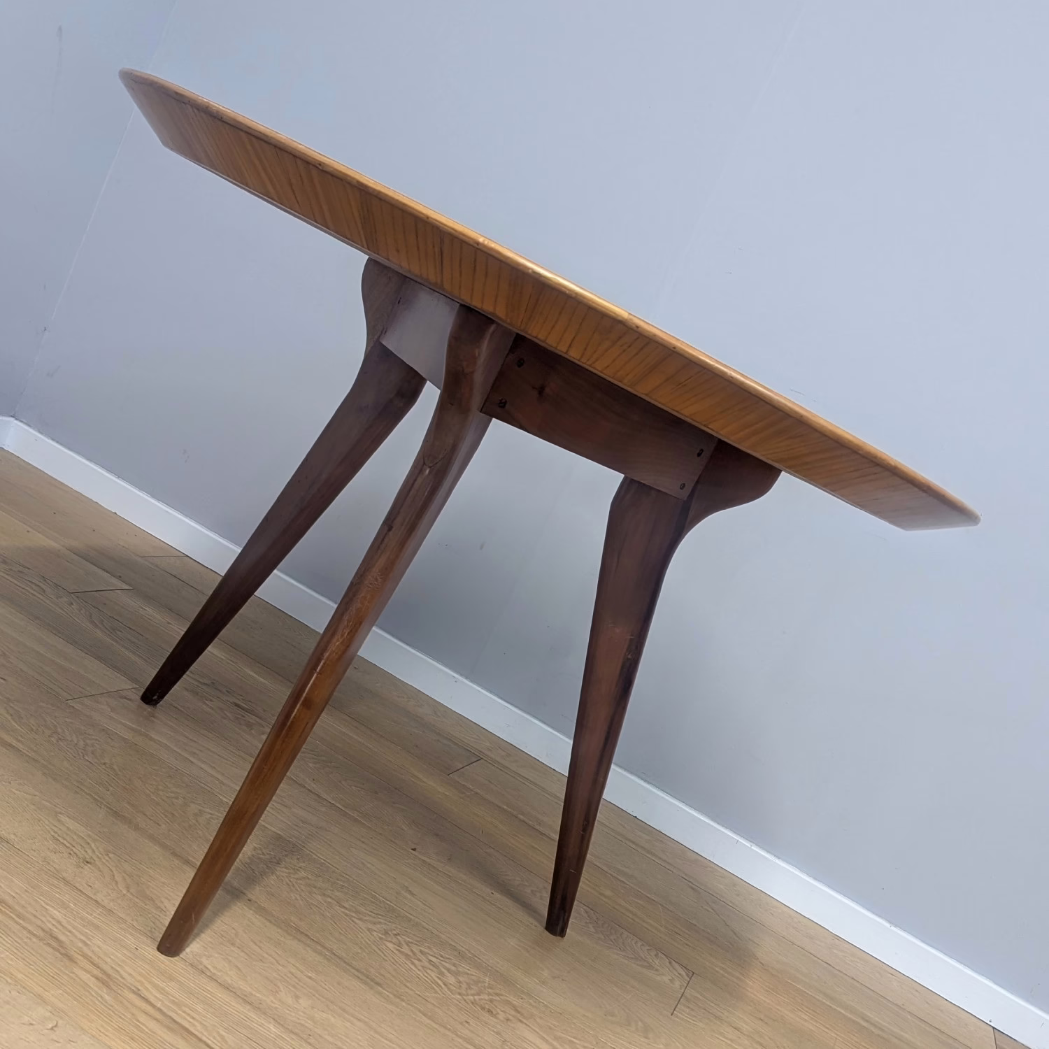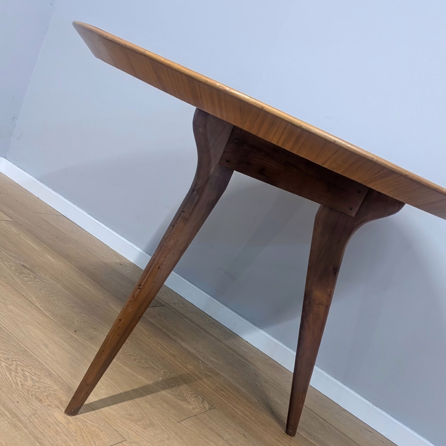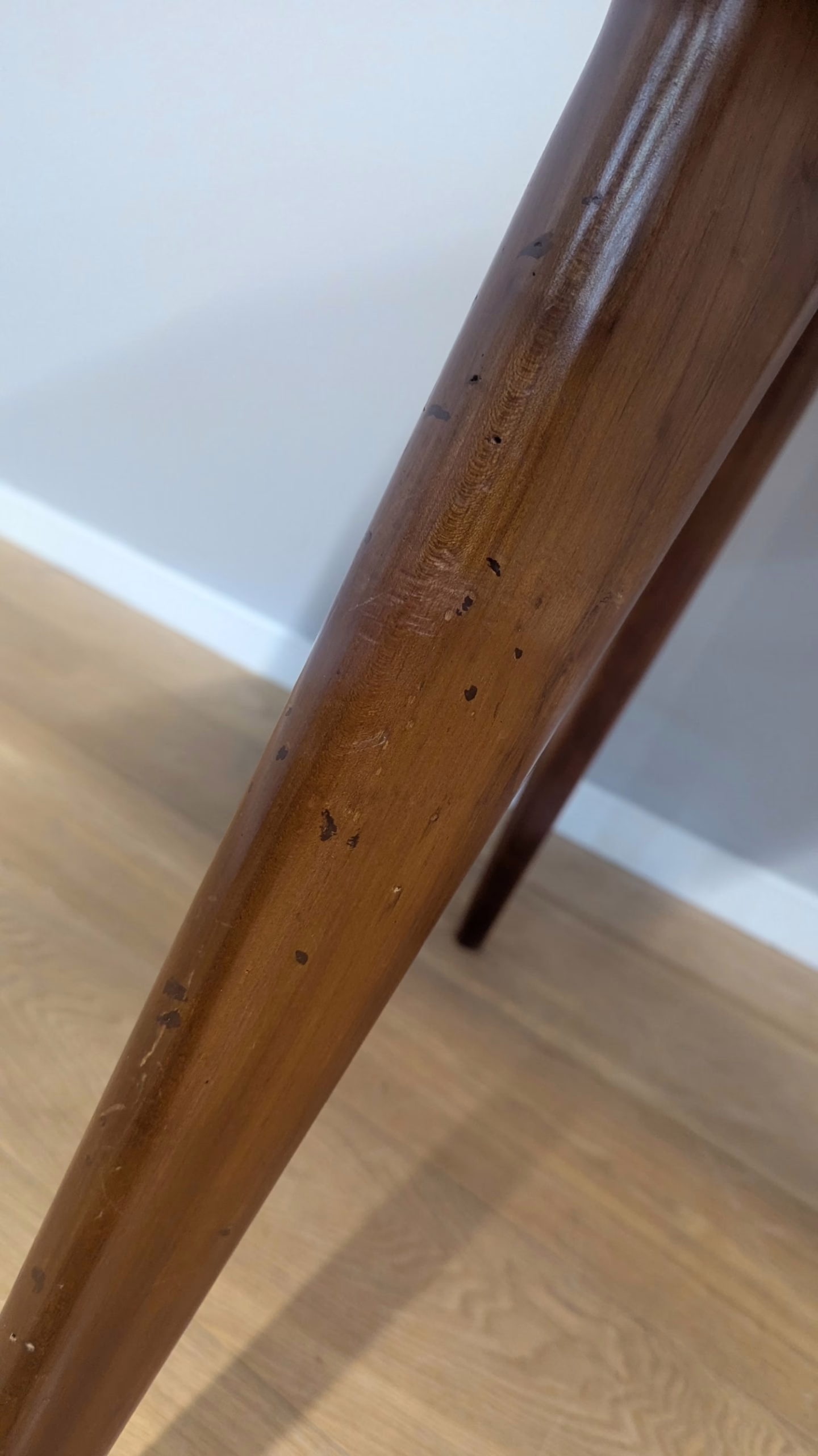 This original, vintage table is ‘sold as seen’. It is in good – very good, used condition. We have checked and cleaned the table, reviving its original finish with a natural beeswax polish. The yellow Formica table top is in very good order with just superficial scuffs and marks from use. The thick bevelled edge has a few knocks and dents here and there, as we’ve shown, as do the trio of legs but this is in line with what we would expect with a vintage piece of this age – do browse our photos for an accurate representation of tone and condition. It is solid and sturdy with no wobbles or signs of repair. There is no maker’s mark but research tells us it’s Italian in origin and it dates from the 1960s. If you’ve any questions or would like to take a look at this table, please get in touch.