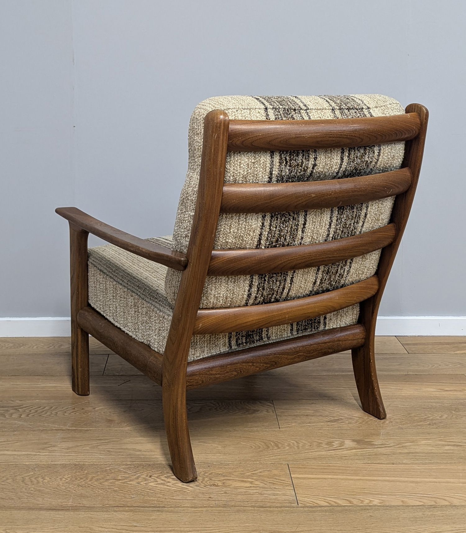 This original, vintage armchair is ‘sold as seen’. It is in good – very good, used condition. It has been checked, the wooden frame cleaned and a natural beeswax polish applied. The two separate cushions have been checked and vacuumed. The striped beige and brown upholstery is in remarkably good shape. The cushions have deep, plump foam inners and working zips and there are no marks or signs of wear to flag. The finishing underneath the seat cushions is in very good order too. The solid teak frame is in good – very good condition with some minor signs of wear and tear. Light scuffs, marks and scrapes here and there which can be seen across our photos but nothing specific to flag. It’s a really nicely designed and well built chair with no areas of concern. Sadly there is no maker’s mark but it’s a direct import from Denmark and dates from 1970s. Do browse our photos for an accurate representation of its great condition. If you have any questions or would like to view the chair, please get in touch.