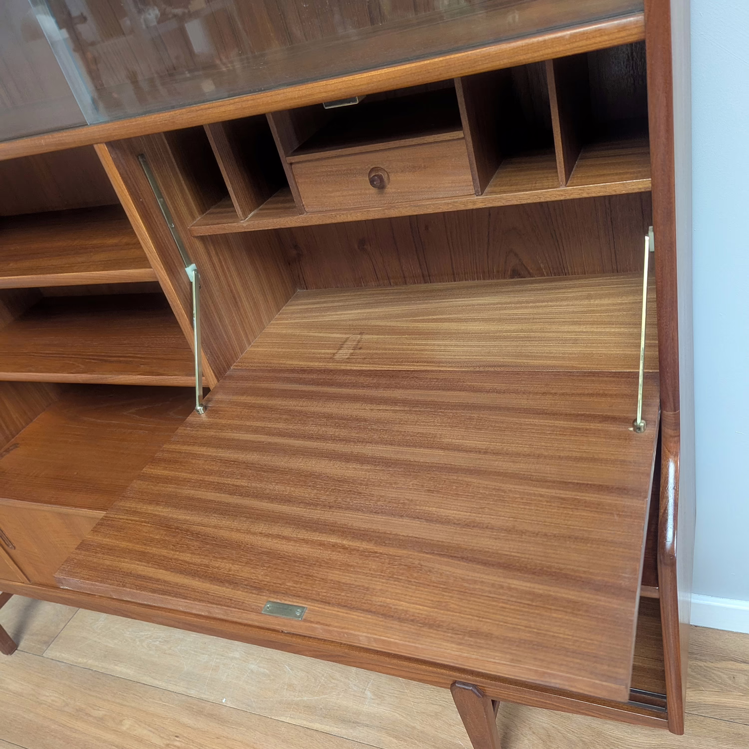 This is an original, vintage piece that is ‘sold as seen’. It is in good – very good, used condition. We have checked and thoroughly cleaned the piece inside and out, and applied a natural wax polish to the exterior wood for protection and to restore shine but otherwise the finish is original. All interiors are clean and tidy. All hinges, closures, sliding door runners are in very good, working order. All handles are securely attached, doors in good order and the drawers slide easily – they are well-made with dovetail joints. The two central shelves can be removed. The left hand shelf is adjustable. The drinks cabinet features a further cut-away glass shelf inside. The bureau features pigeon hole storage and a further small drawer. There is light wear inside this section as shown. The fall-door of the bureau has sustained some faded patches / discolouration to the finish at some point – it’s not overly noticeable especially in the overall context of the piece but do refer to our photos. There are some scuffs, marks and scratches on the external surfaces but nothing major, wear we would categorise as ‘light’ and in line with its considerable age. There are some small blemishes on the central shelves, there is a scratch on the left hand end and small knock on the back bottom corner. These are shown across our photos so do browse them to get an accurate sense of the overall great condition of this vintage piece. The Rosebury furniture label can be seen inside the drinks cabinet. It’s an extremely well-made, substantial piece that’s solid and stable.