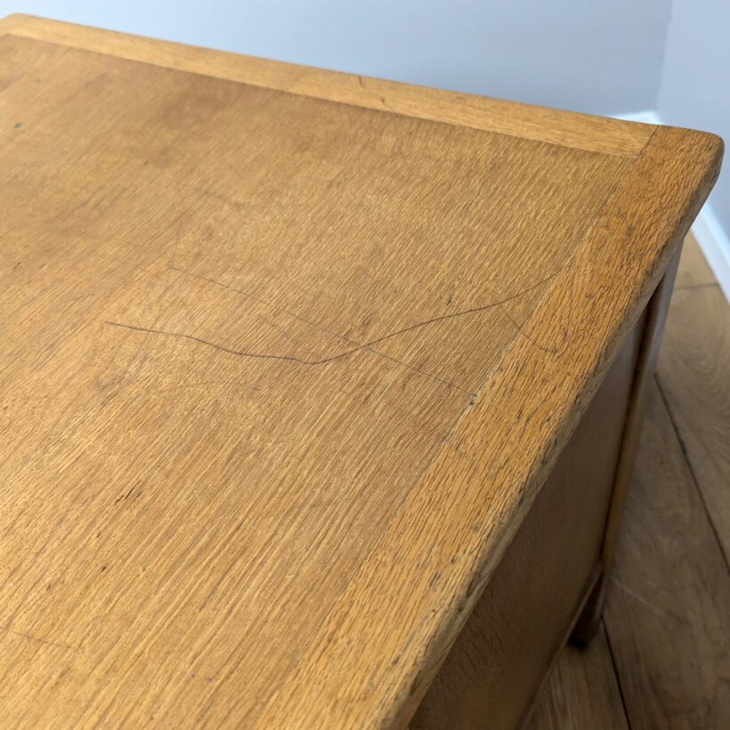 This is an original, vintage piece that is ‘sold as seen’. It is in good, used condition. We have given the desk a thorough check and clean, and applied a fresh coat of oil to the top and drawer fronts to restore its tired wood a little. There are six drawers in total, well-made in solid oak with dovetail joints, with tidy interiors and they all slide with ease. Some of the drawers are marked and stained inside and some of the drawers have removable dividers in place. There are also two pull-out platforms above each bank of drawers. Sadly we do not have the key for the locks. As you can see in our photos, there are numerous minor knocks, scuffs and marks inside and out, in line with the piece’s considerable age and ‘working’ nature. There is also a discreet repair to one of the drawer handles, as shown. It’s very well crafted, solid and stable – it’s heavy which should be noted. Unfortunately there is no maker’s mark but it is British and from a quality manufacturer.
