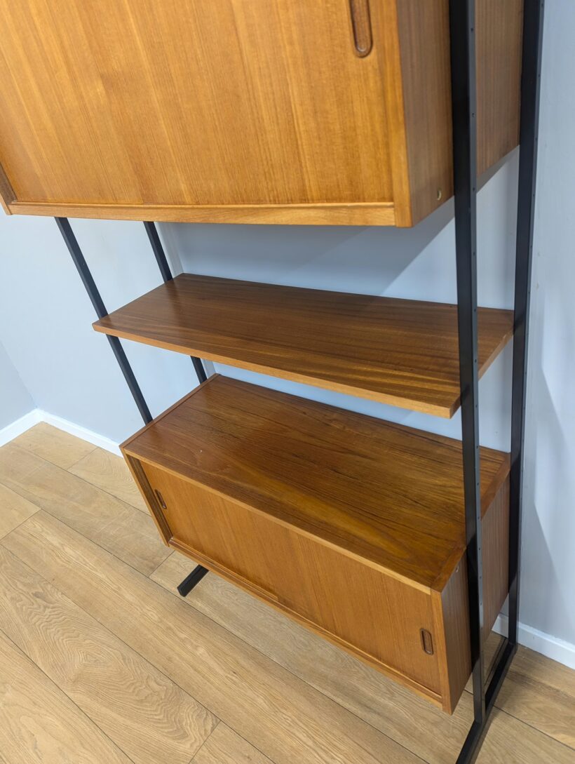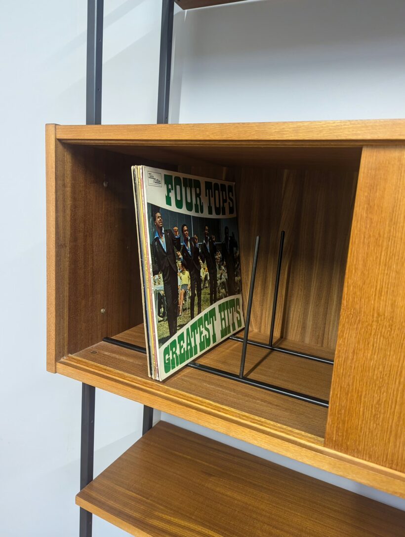 This is an original, vintage unit that is ‘sold as seen’. It is in very good, used condition. We have checked, cleaned and polished this piece, applying a natural beeswax polish to the exterior wood surfaces but otherwise the finish is original. There are four components that screw to the black metal uprights – two cupboards with sliding doors, one sectioned in the middle, one with record dividers in, and two shelves. All elements are in fantastic condition with just light signs of wear and aging. The cupboard doors slide easily in their runners and have clean, tidy interiors. It’s a freestanding piece and you can configure the three components parts differently with basic home tools. It’s well made with no signs of repair or areas of concern. There is no maker’s label but these Interflex units are well-documented and so we attribute with confidence. Do browse our numerous photos for an accurate sense of colour and c0ndition. And you’re welcome to ask questions and view the item. Just ask.