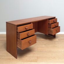 This is an original, vintage piece that is ‘sold as seen’. It is in overall good, used condition. We have checked and cleaned the desk and applied a natural beeswax polish to the exterior wood surfaces but otherwise the finish is all original. All six drawers slide with ease, feature dovetail joints and are in good, clean order inside. The right hand set of drawers is fractionally misaligned, only noticeable under close scrutiny – please refer to our photo. This doesn’t effect the function of the drawers, they slide readily but in the interests of transparency we wanted to detail this. There are some minor superficial marks and scuffs to the external wood surfaces, along with some small knocks to the veneer here and there, primarily on the edges. Please see our photos for a good sense of this. This is a really well made, midcentury piece that was formerly a dressing table, now without the mirror and repurposed as a desk. The Stag label can be seen inside the top left drawer and it dates from the 1960s.
