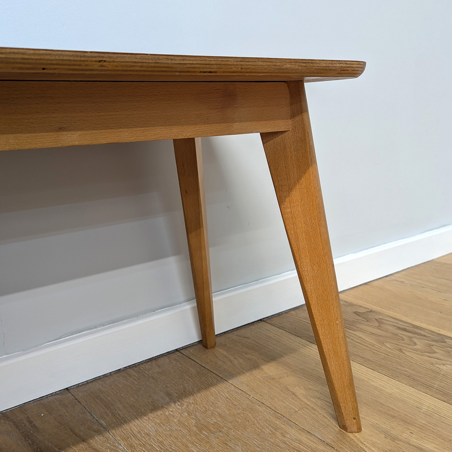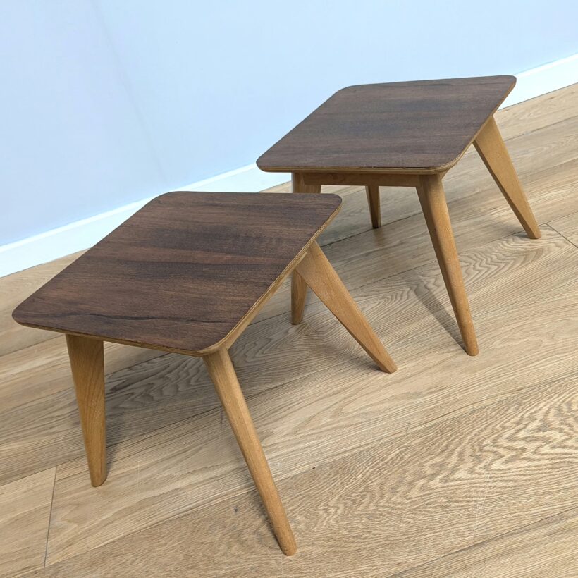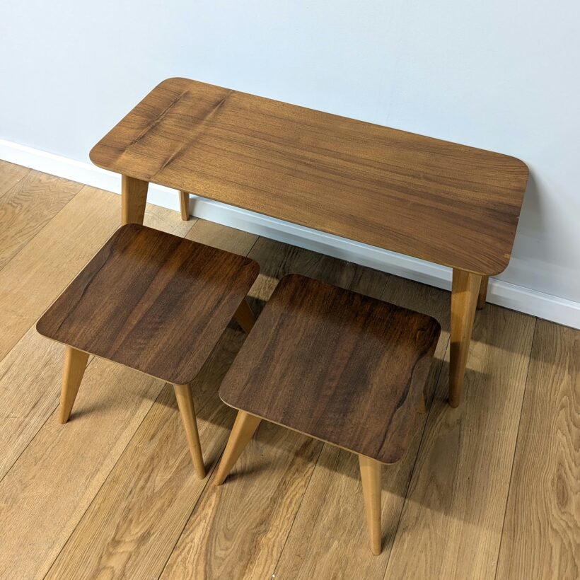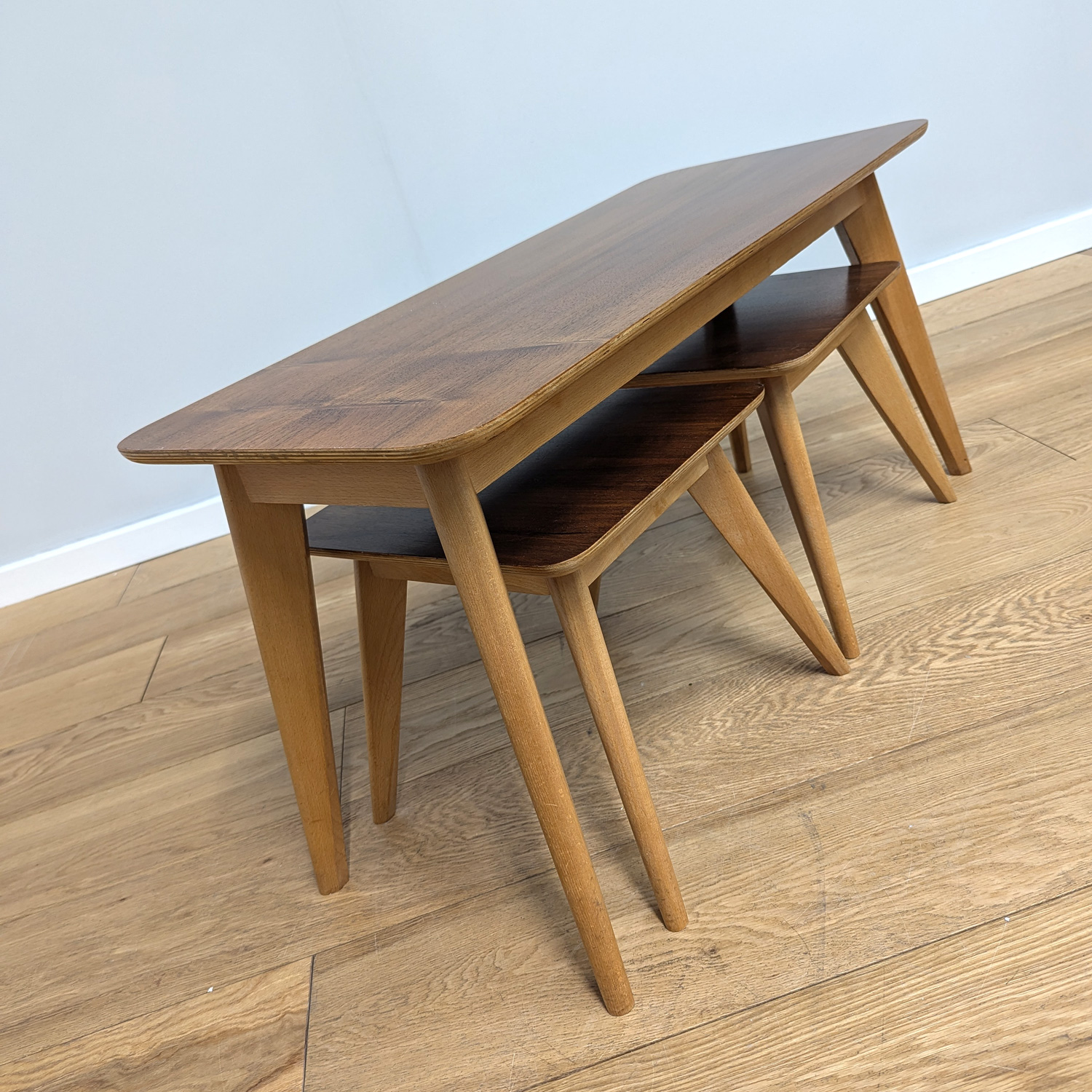 This is an original, vintage set of three tables that is ‘sold as seen’. They are in very good, used condition. The tables have been checked and cleaned and a natural beeswax polish applied but otherwise their finish is original. There have been two small veneer repairs to the large table top. This is at the edge, it’s discreet and it’s been expertly done (we didn’t do this repair ourselves). Other than this, there are minor signs of wear and tear, just superficial, light signs of use. Each table is beautifully crafted, each very well-made with no wobbles or joint concerns. Frustratingly there is no maker’s mark but our research has lead us to settle with confidence on Peter Hayward for Vanson. The superior quality of their construction, the materials and key design elements have all contributed to this conclusion. Please do browse our photos for an accurate sense of the set’s super colour and condition. If you have any question or would like to view the tables, just get in touch.