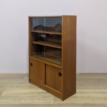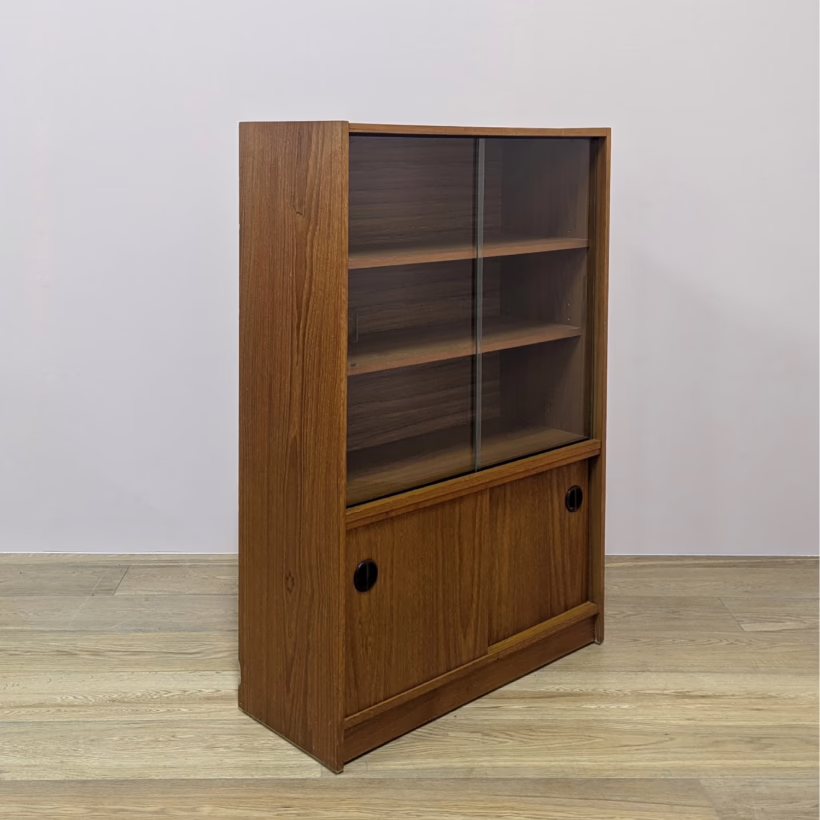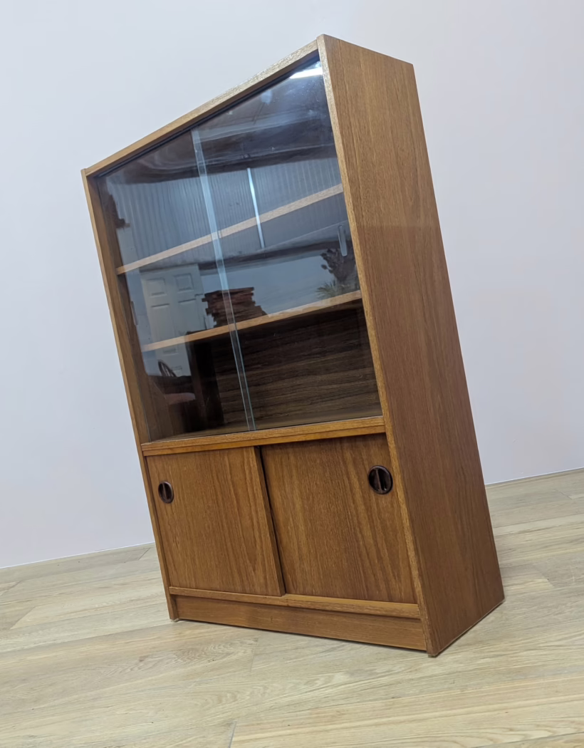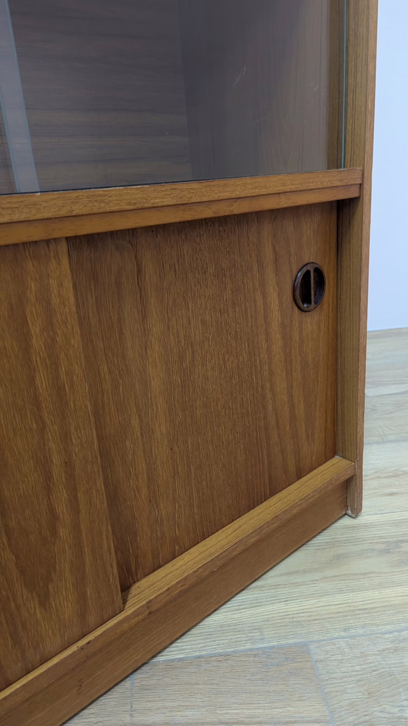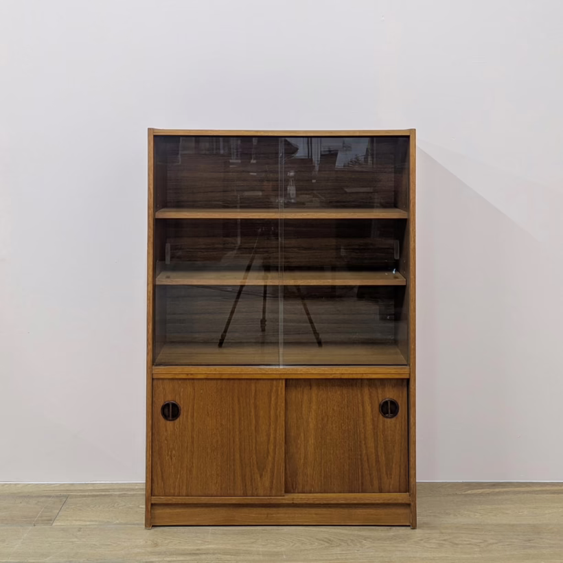 This original, vintage cabinet is ‘sold as seen’. Overall it is in good – very good, used condition. The piece has been cleaned, inside and out, and a natural beeswax polish applied and buffed on the external surfaces, but otherwise the finish is original. The lower cupboard has double sliding doors, both in good order with recessed handles and they slide well in their runners. The interior has a single open cupboard and is clean and tidy. The upper section features a glazed bookcase / display cabinet with two adjustable shelves in side. The interior is clean and today and the glass doors in very good order, sliding well. The external surfaces have some light knocks and scuffs which overall is minor but there is a small chip on the left hand side that has been filled. It’s not very noticeable as it’s on the back edge – please refer to your photos. There is also some sunlight fading on the right hand side – again, please see our image for reference. We would categorise the wear as light and in line with the cabinet’s age. Do look through our photos for an true sense of its condition. There’s no maker’s mark but this is a nicely made, stable piece, British in origin and with no areas of concern. Any queries, please get in touch.