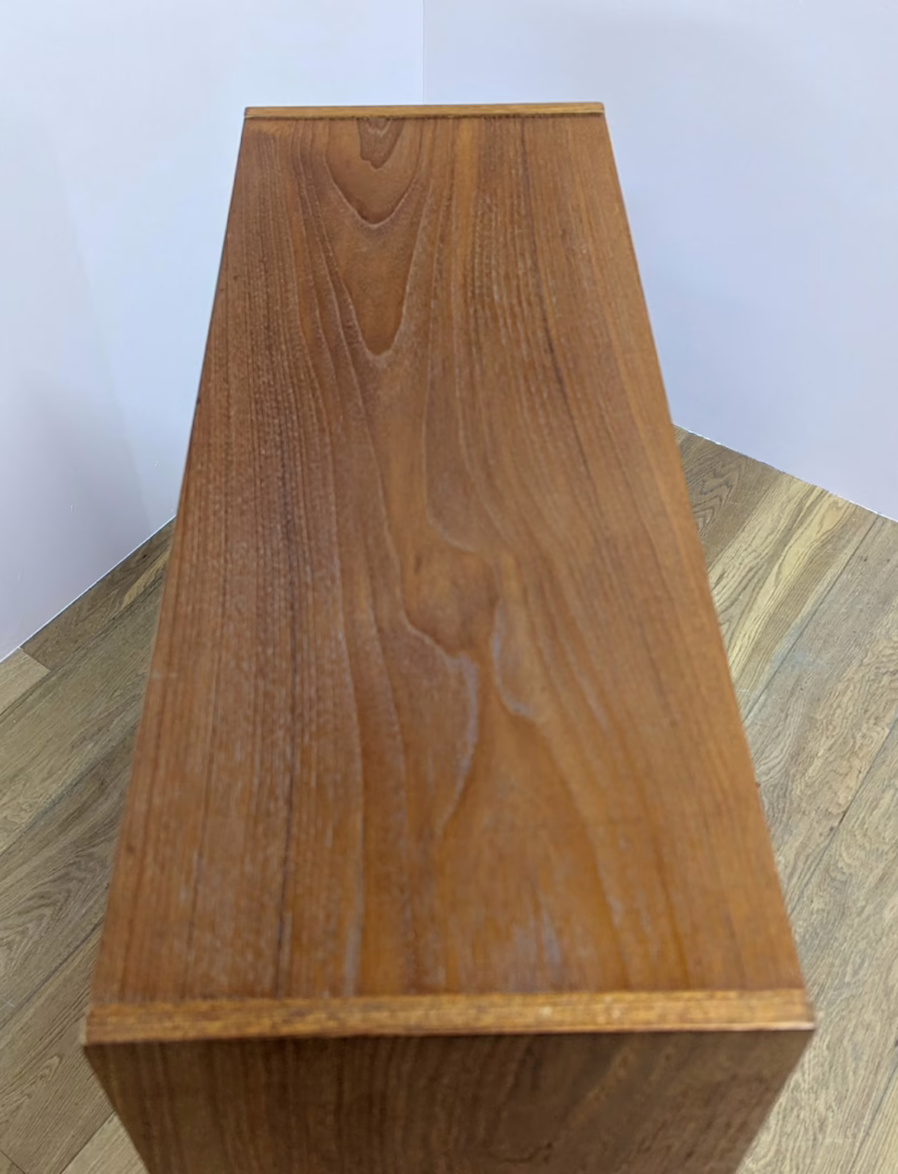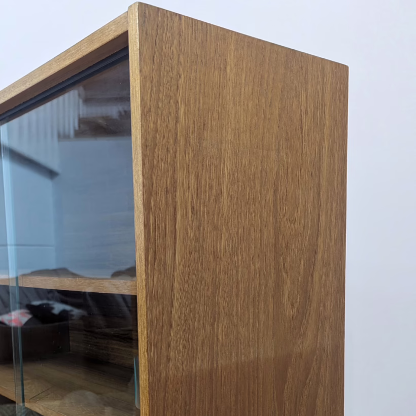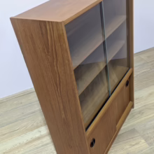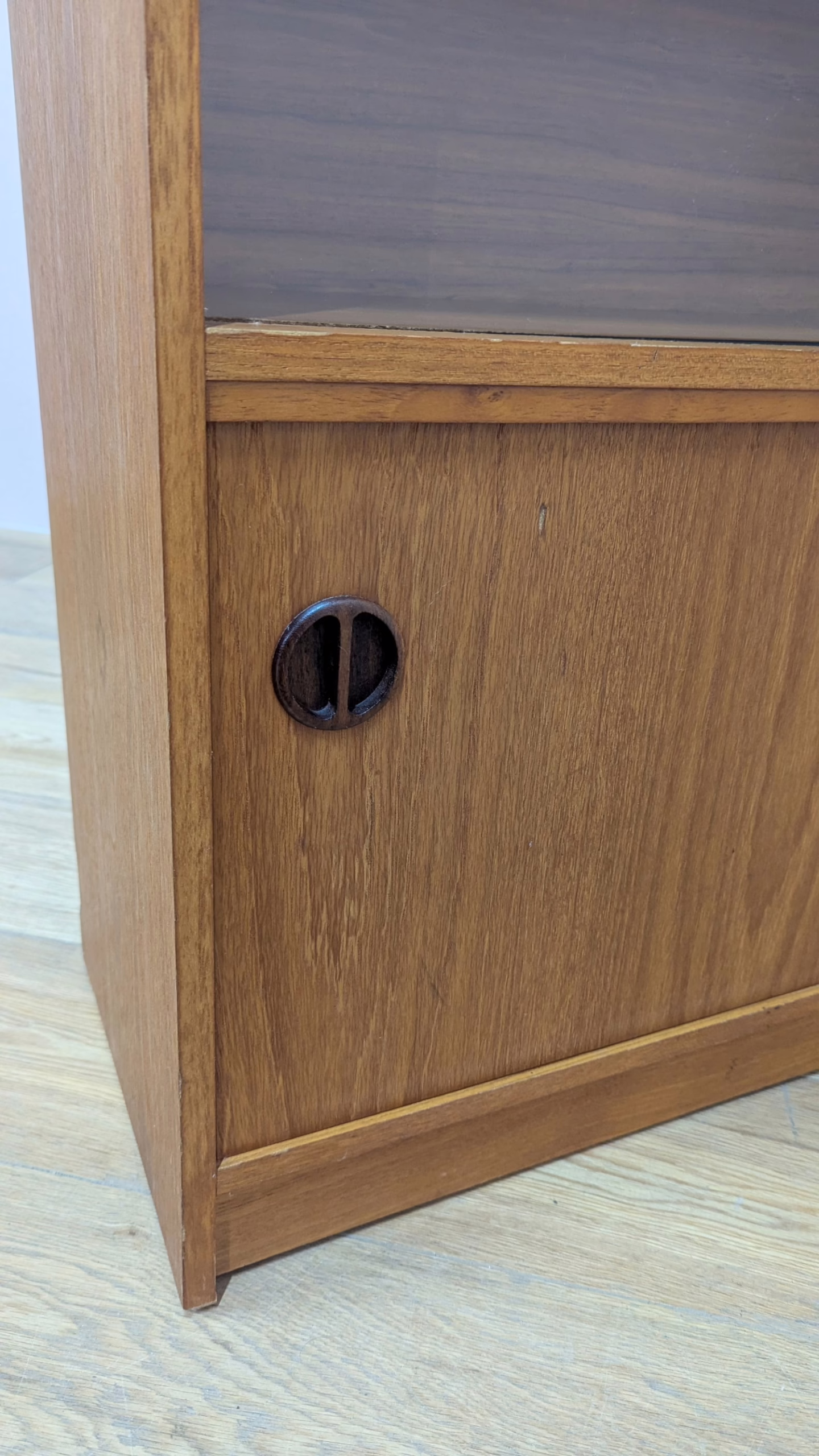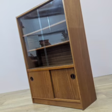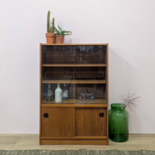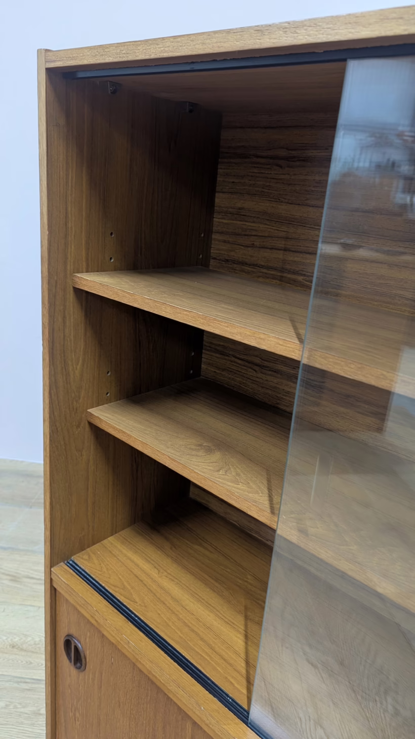 This original, vintage cabinet is ‘sold as seen’. Overall it is in good – very good, used condition. The piece has been cleaned, inside and out, and a natural beeswax polish applied and buffed on the external surfaces, but otherwise the finish is original. The lower cupboard has double sliding doors, both in good order with recessed handles and they slide well in their runners. The interior has a single open cupboard and is clean and tidy. The upper section features a glazed bookcase / display cabinet with two adjustable shelves in side. The interior is clean and today and the glass doors in very good order, sliding well. The external surfaces have some light knocks and scuffs which overall is minor but there is a small chip on the left hand side that has been filled. It’s not very noticeable as it’s on the back edge – please refer to your photos. There is also some sunlight fading on the right hand side – again, please see our image for reference. We would categorise the wear as light and in line with the cabinet’s age. Do look through our photos for an true sense of its condition. There’s no maker’s mark but this is a nicely made, stable piece, British in origin and with no areas of concern. Any queries, please get in touch.