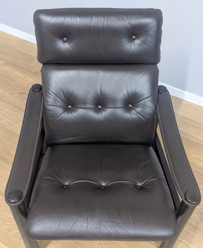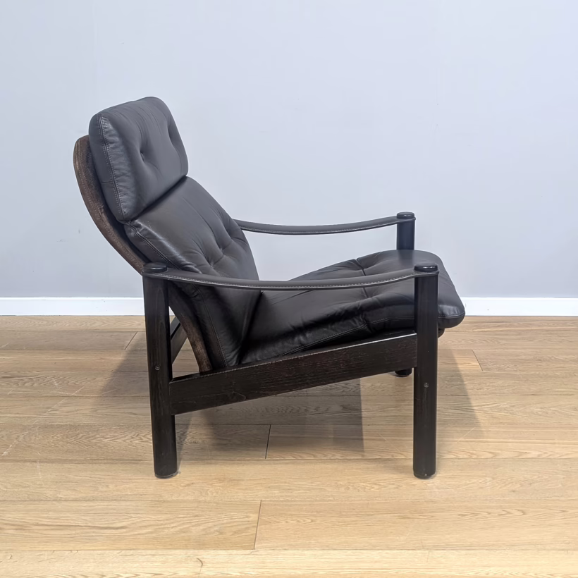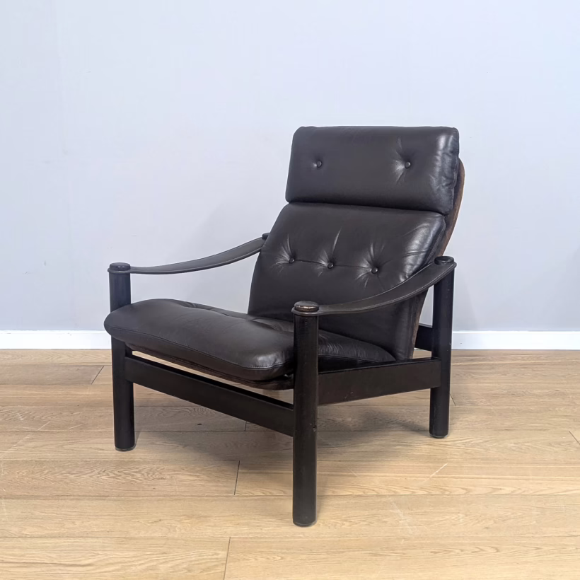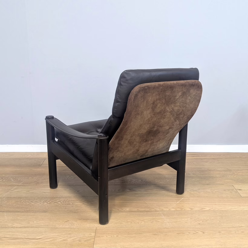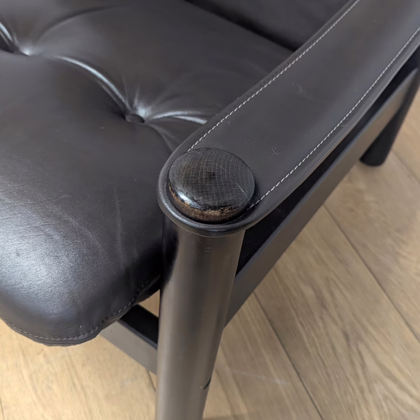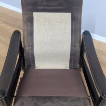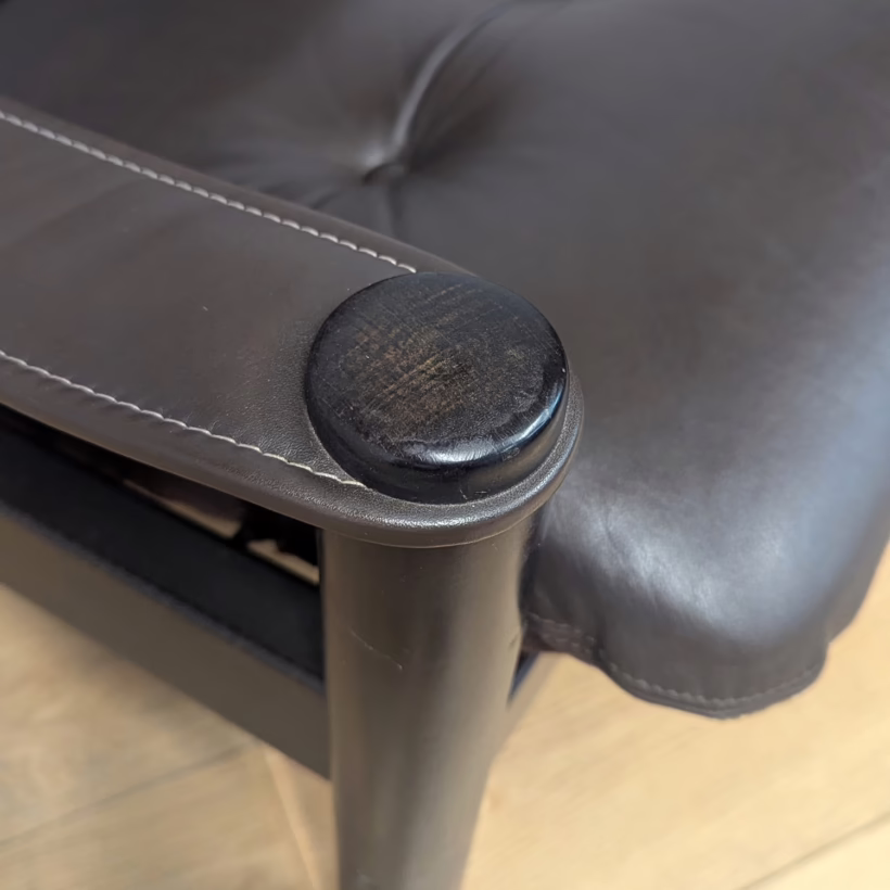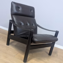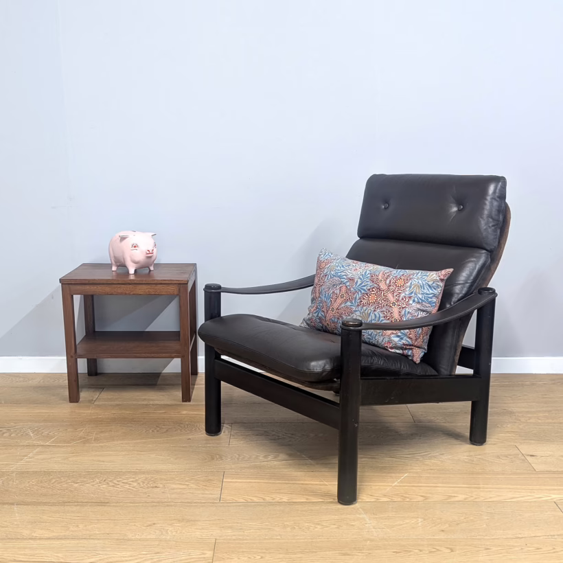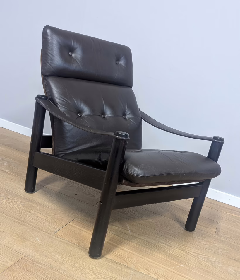 This original, vintage chair is ‘sold as seen’. It is in good – very good, used condition. We have given the chair a thorough clean, applying a natural beeswax polish to the wooden frame and nourishing leather cleaner and balm to the cushion. It is comprised of a single, three-part sectioned cushion, held in place with Velcro at the top, although it’s worth noting the cushion rests in place with no fixings. The cushion is in very good order. The leather is soft, supple with securely attached buttons, working zips and plump inners. The leather arm rest slings are in very good order too. There are minor wrinkles and surface marks here and there on the leather which you can see in our photos but this is very much part of aged leather’s appeal. The suede back panel is in very good order. There is some wear to the finishing fabric underneath the seat cushion where the side seams have opened up a little, as we’ve shown. This doesn’t show of course as it’s concealed by both the cushion and the stretchers on the sides of the chair. You could opt to glue or sewn. There is also a faint, small tide mark as shown and some age spots on the canvas underneath the chair. Nothing unsavoury but age-related marks we nevertheless want to be transparent about. There is a working mechanism that raises the tilt of the chair. There are two positions. The dark stained wooden frame is solid and stable with just minor scuffs and marks to the finish – again, please refer to our photos. There is no maker’s label but this is very fine quality, well-documented chair that we attribute with confidence to Jeki Mobler, designed by Ebbe Gehl and Soren Nissen, and made in the seventies. Do browse our photos for a good sense of its super condition. If you have any queries or would like to view, get in touch.
