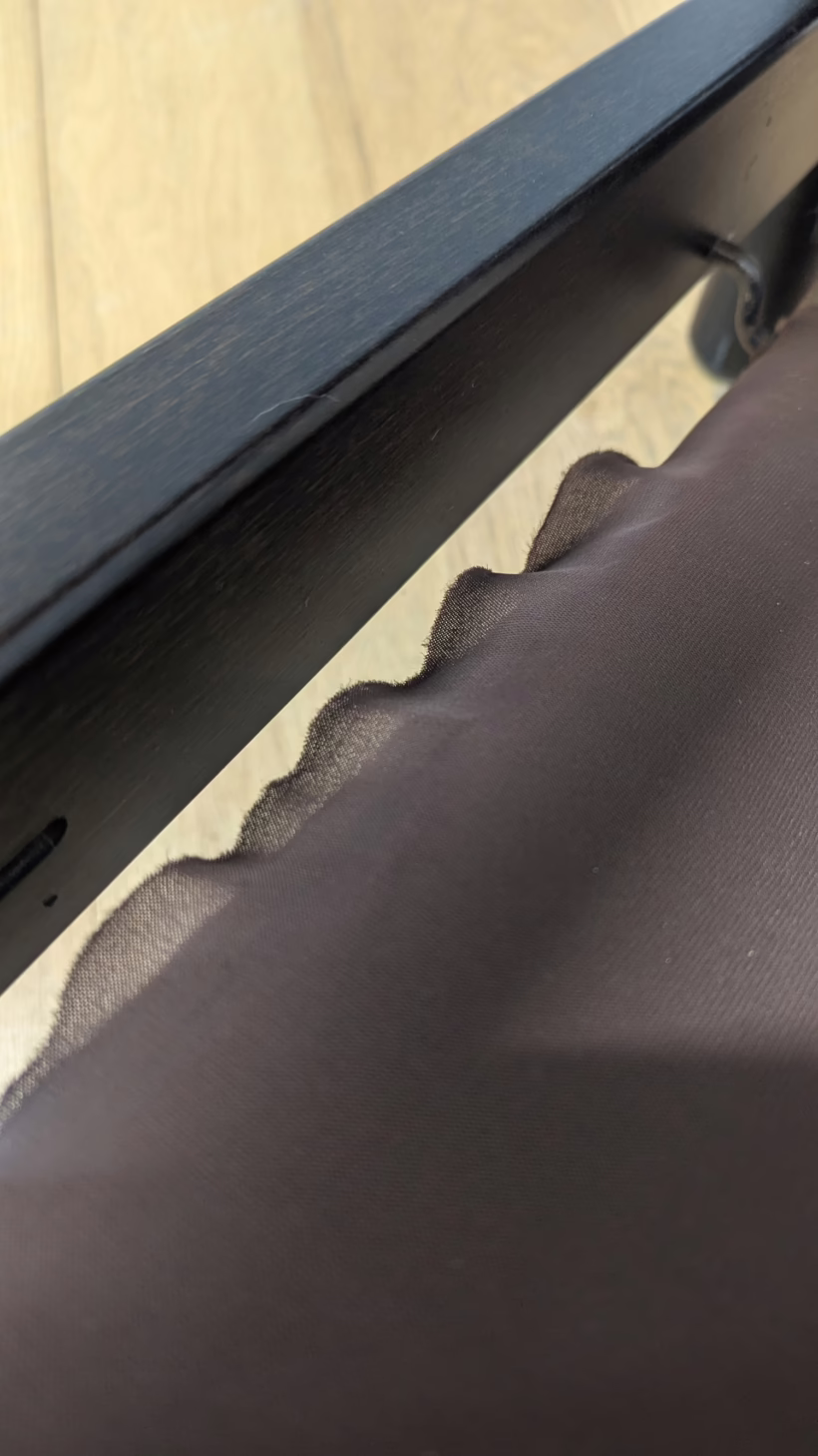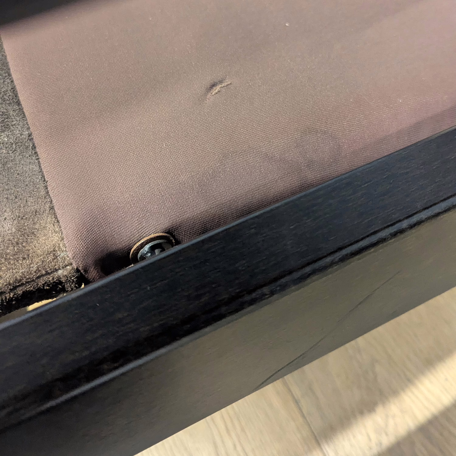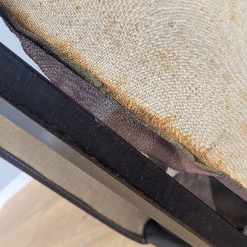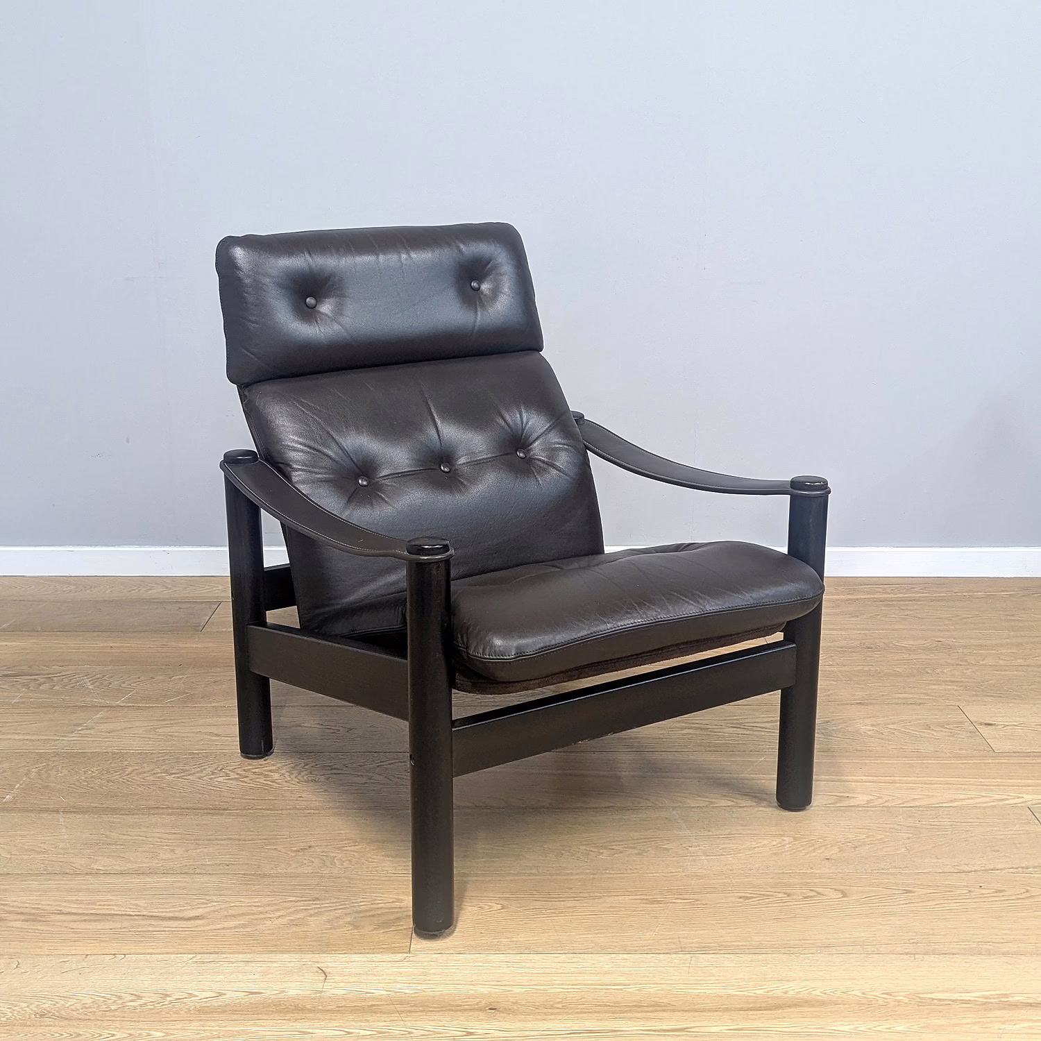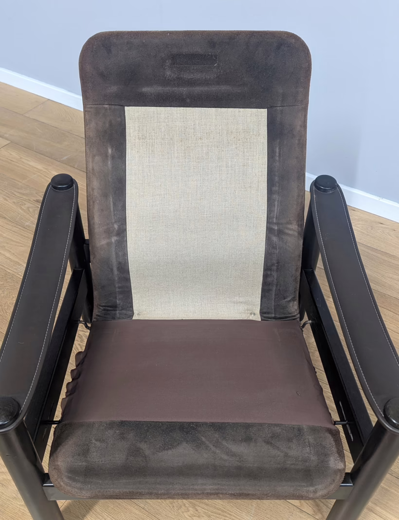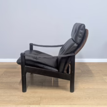 This original, vintage chair is ‘sold as seen’. It is in good – very good, used condition. We have given the chair a thorough clean, applying a natural beeswax polish to the wooden frame and nourishing leather cleaner and balm to the cushion. It is comprised of a single, three-part sectioned cushion, held in place with Velcro at the top, although it’s worth noting the cushion rests in place with no fixings. The cushion is in very good order. The leather is soft, supple with securely attached buttons, working zips and plump inners. The leather arm rest slings are in very good order too. There are minor wrinkles and surface marks here and there on the leather which you can see in our photos but this is very much part of aged leather’s appeal. The suede back panel is in very good order. There is some wear to the finishing fabric underneath the seat cushion where the side seams have opened up a little, as we’ve shown. This doesn’t show of course as it’s concealed by both the cushion and the stretchers on the sides of the chair. You could opt to glue or sewn. There is also a faint, small tide mark as shown and some age spots on the canvas underneath the chair. Nothing unsavoury but age-related marks we nevertheless want to be transparent about. There is a working mechanism that raises the tilt of the chair. There are two positions. The dark stained wooden frame is solid and stable with just minor scuffs and marks to the finish – again, please refer to our photos. There is no maker’s label but this is very fine quality, well-documented chair that we attribute with confidence to Jeki Mobler, designed by Ebbe Gehl and Soren Nissen, and made in the seventies. Do browse our photos for a good sense of its super condition. If you have any queries or would like to view, get in touch.