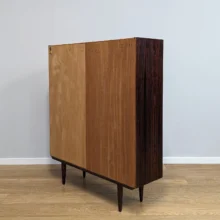 This is an original, vintage piece that is ‘sold as seen’. It is in very good, used condition. We have cleaned the unit and applied a light natural beeswax polish but otherwise left the original finish alone as it’s in such good order. There are six height-adjustable shelves, three on each side. They slot onto hidden metal rods and easily slide out. All the shelves and interior surfaces are in good order with only very light marks from use. As shown, one of the shelves has small holes along its sides, leftover from when there originally would have been dividers in place for vinyl storage. This is discreet though and once there are books and items on display, it’s unlikely to be noticeable. Similarly the exterior wood on the top and sides, and the tapered legs are in very good order too with just minor signs of wear here and there. The solid wood legs have been added at a later date. It’s very well-made, a solid and stable piece. Note: it’s a heavy, large item. The original Hundevad maker’s label can be seen on the back of the piece. Please browse our photos for a good sense of its excellent condition. If you would like to view the piece or have any questions, do get in touch.