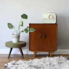 This is an original, vintage piece that is ‘sold as seen’. It is in overall very good, used condition. It has been thoroughly cleaned and wax polished. The two doors move with ease on their hinges and have working closures. The interior has fixed sections, designed for vinyl storage – the top for 7 inches, the bottom for albums. The internal wood is clean and tidy. The exterior wood has light signs of wear and tear but overall this is minimal and not particularly noticeable. It’s well made, solid and stable with no signs of repair. Sadly there is no maker’s make in place.