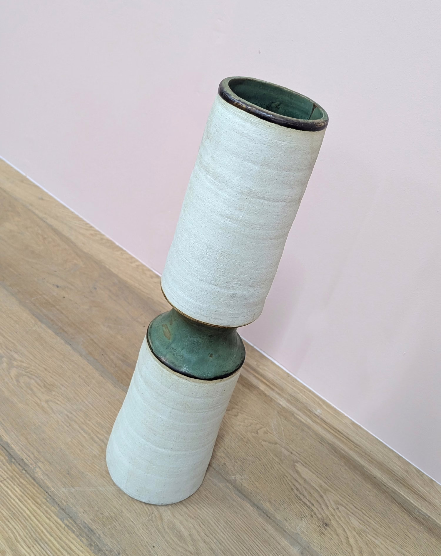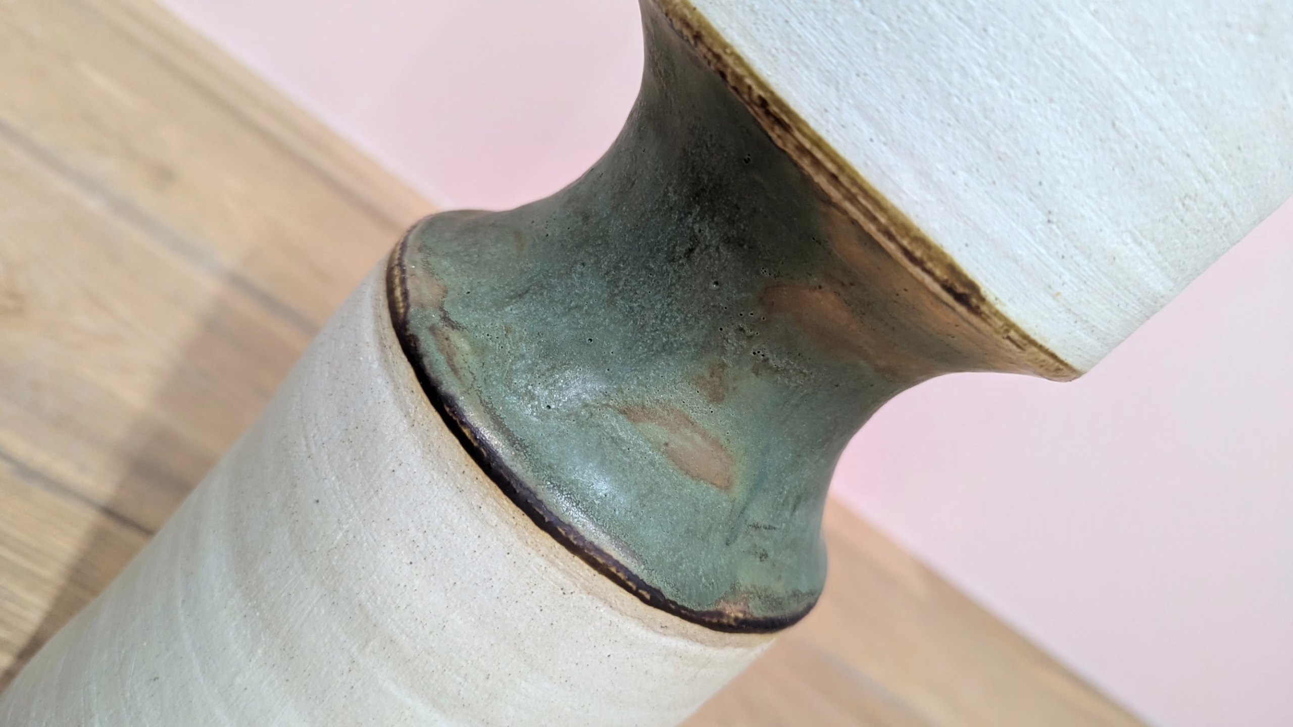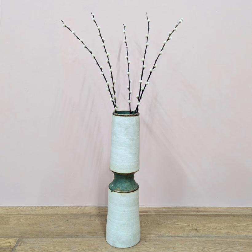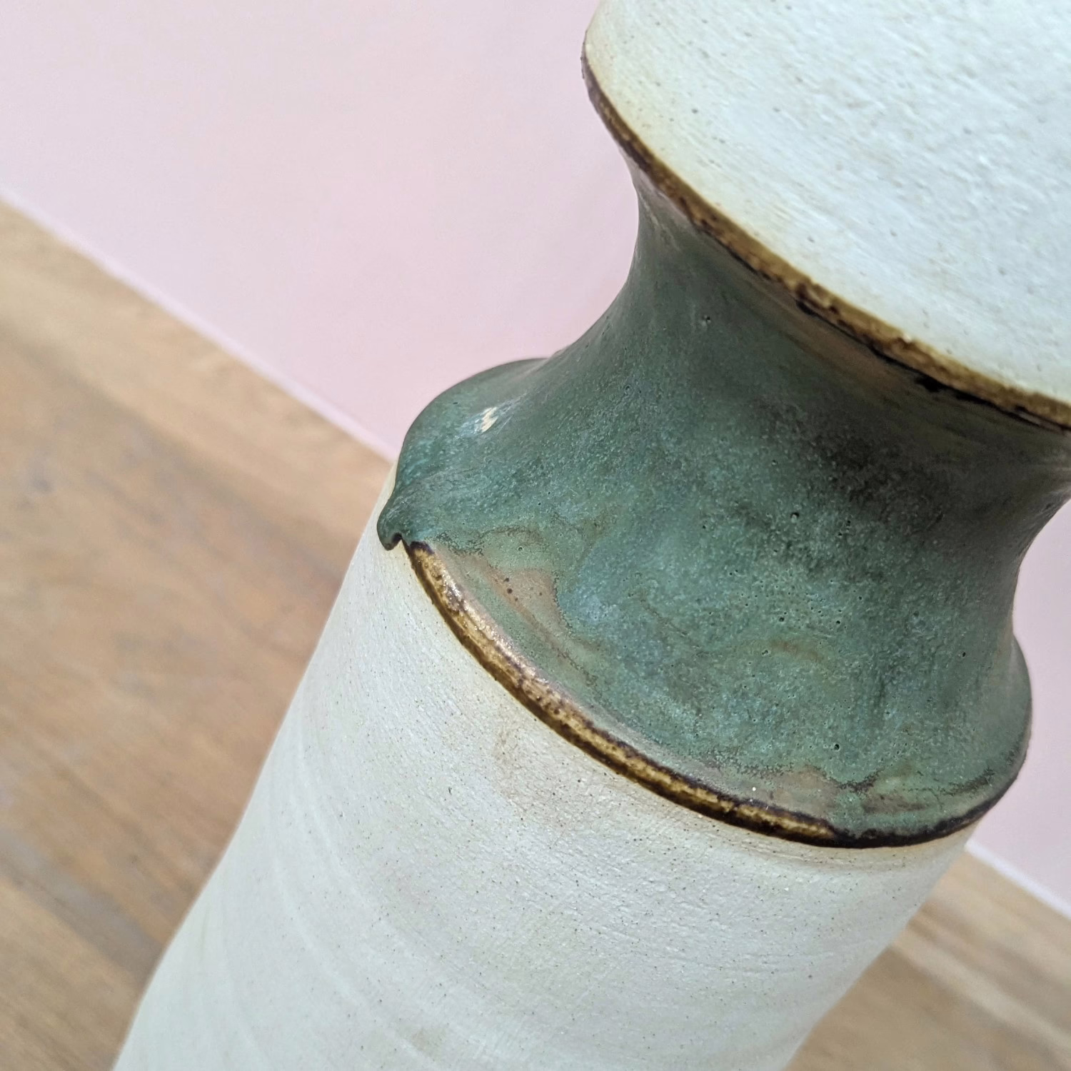 This is such a striking piece, not least because of its scale and weight – it’s tall and substantial enough to be displayed on the ground. Made by Berthe Wallis, a British potter (1936 – 2019), we believe it dates from the 1970s. A gently tapering, cylindrical form with a pinched, concave band in a teal blue glaze, which is echoed at the rim. Our favourite bit? The small drip! Her painted monogram is on the base.