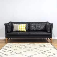 Simple and elegant, this classic Scandi black leather sofa comes with excellent credentials, designed by Takashi Okamura & Erik Marquardsen for renowned Danish maker, Skipper Mobler. It dates from the 1970s and is a prestige piece from the finest quality leather to the clean-but-comfortable design. It features two large seat cushions and feather-filled, back and side cushions for soft, inviting comfort. We like the solid wood side bars and the groove in the front legs which help attribute it. Vintage leather comes with wrinkles and light fading, getting better and more characterful with age and use. And that’s very much part of its appeal especially in spaces where it will get a lot of use. It’s a fine, quality sofa made with superior construction and top quality leather.