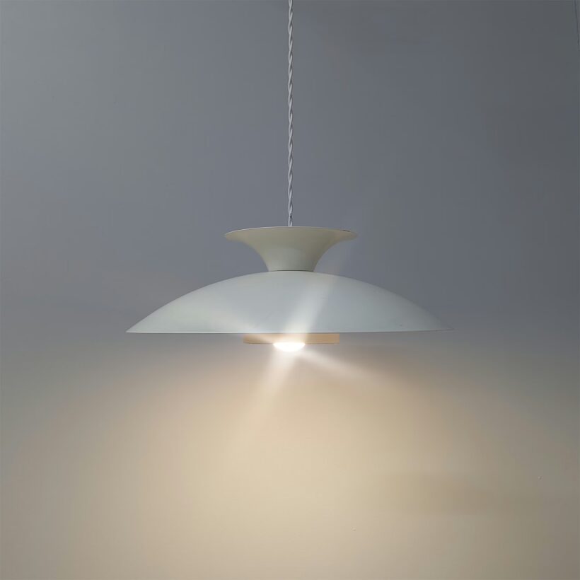 This original, vintage piece is ‘sold as seen’. It is in very good, used condition. We have carefully cleaned and fully restored it with new, compliant fittings and an energy efficient bulb, and with a generous length of white, fabric-coated, braided flex, ready for it to be wired into place. There are some minor surface marks and scuffs here and there, primarily to its rim, but wouldn’t be noticeable when in situ. This wear and tear is what we might expect with a piece of this age and material. The Horn maker’s label is still in place inside the shade, it’s been imported directly from Denmark and dates from the 1970s. I