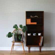 This original, vintage piece is ‘sold as seen’. This is an original, vintage piece that is ‘sold as seen’. It is in very good – excellent, used condition. The four shelves are height adjustable on their original metal pegs. The interior wood is in good clean order with just light signs of use. And the same goes for the exterior wood – very light signs of prior use. It’s well made, solid and stable. The Omann Jun maker’s label can be seen on the back of the piece.