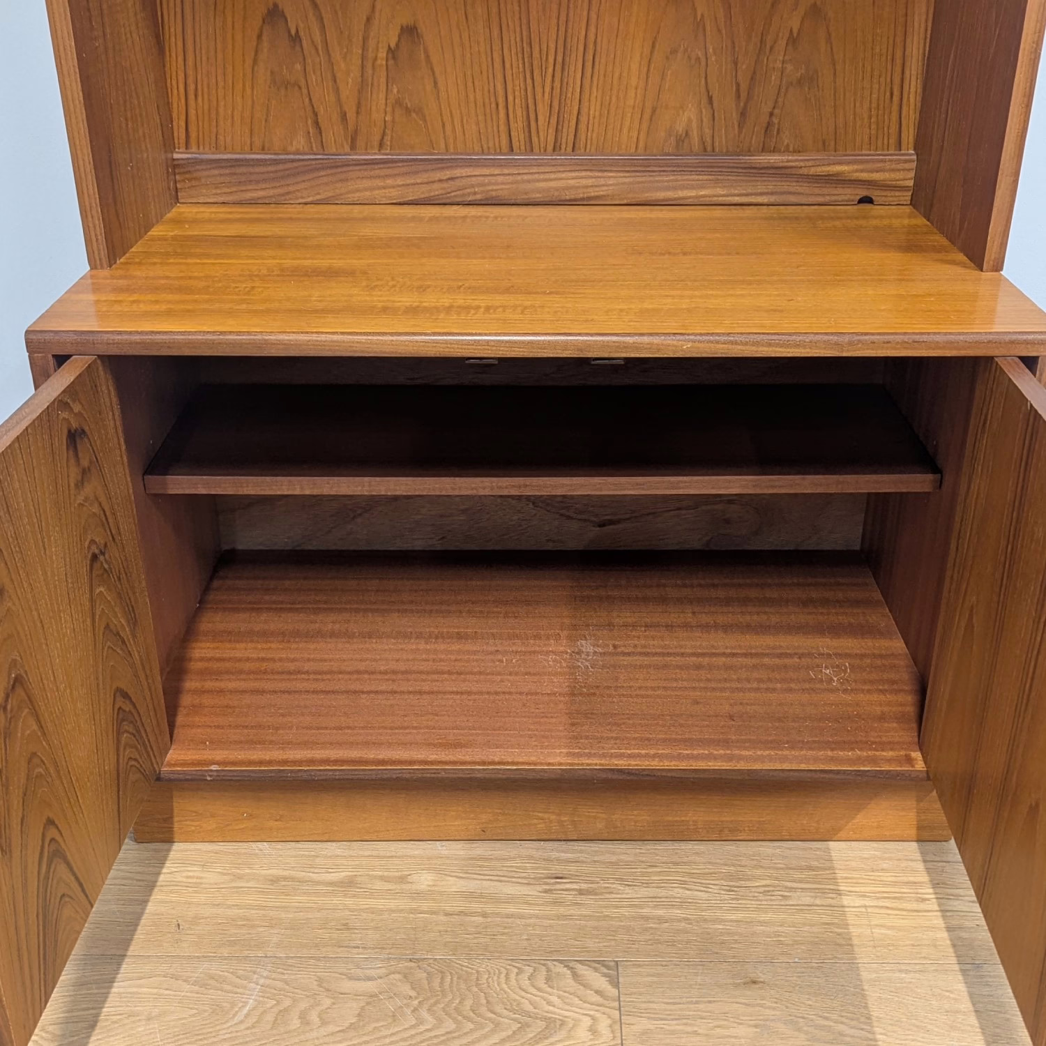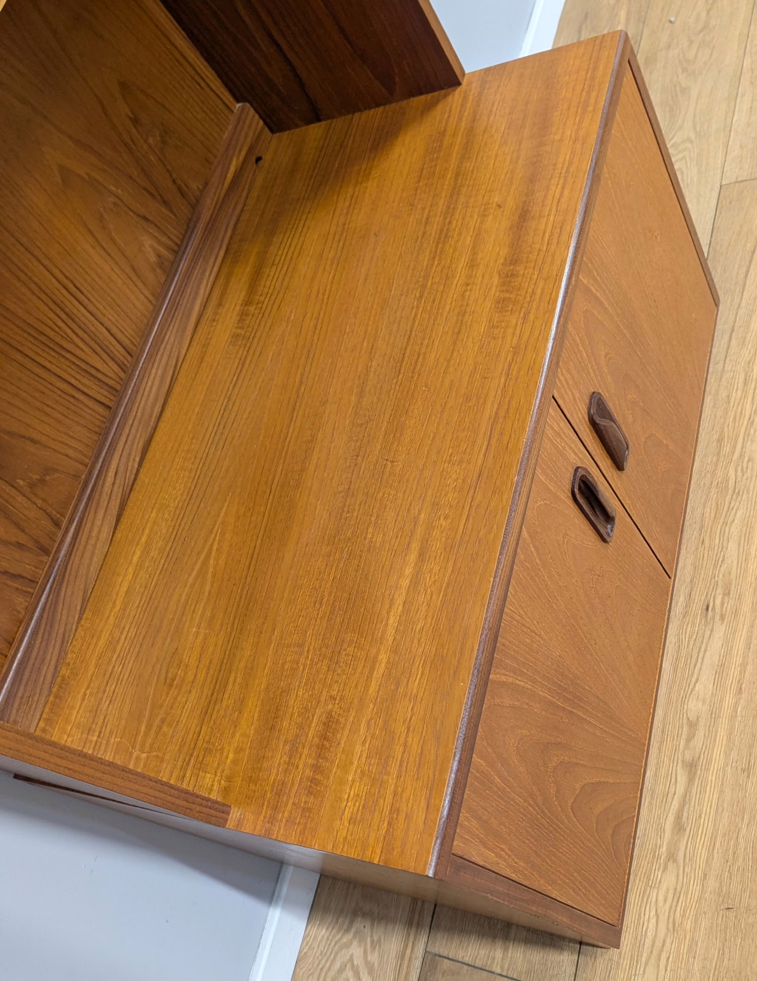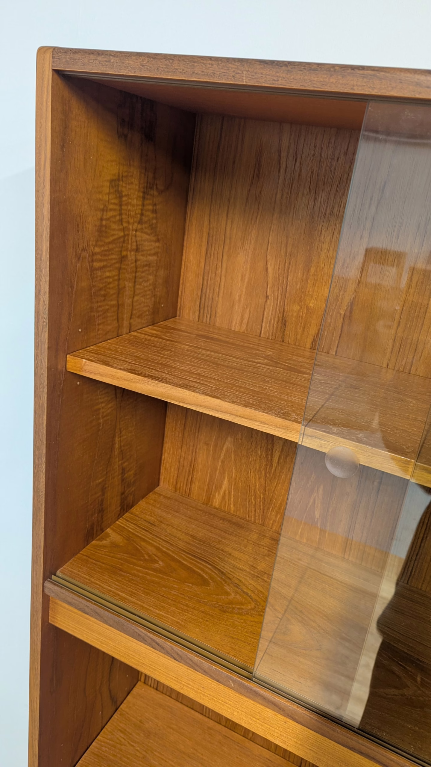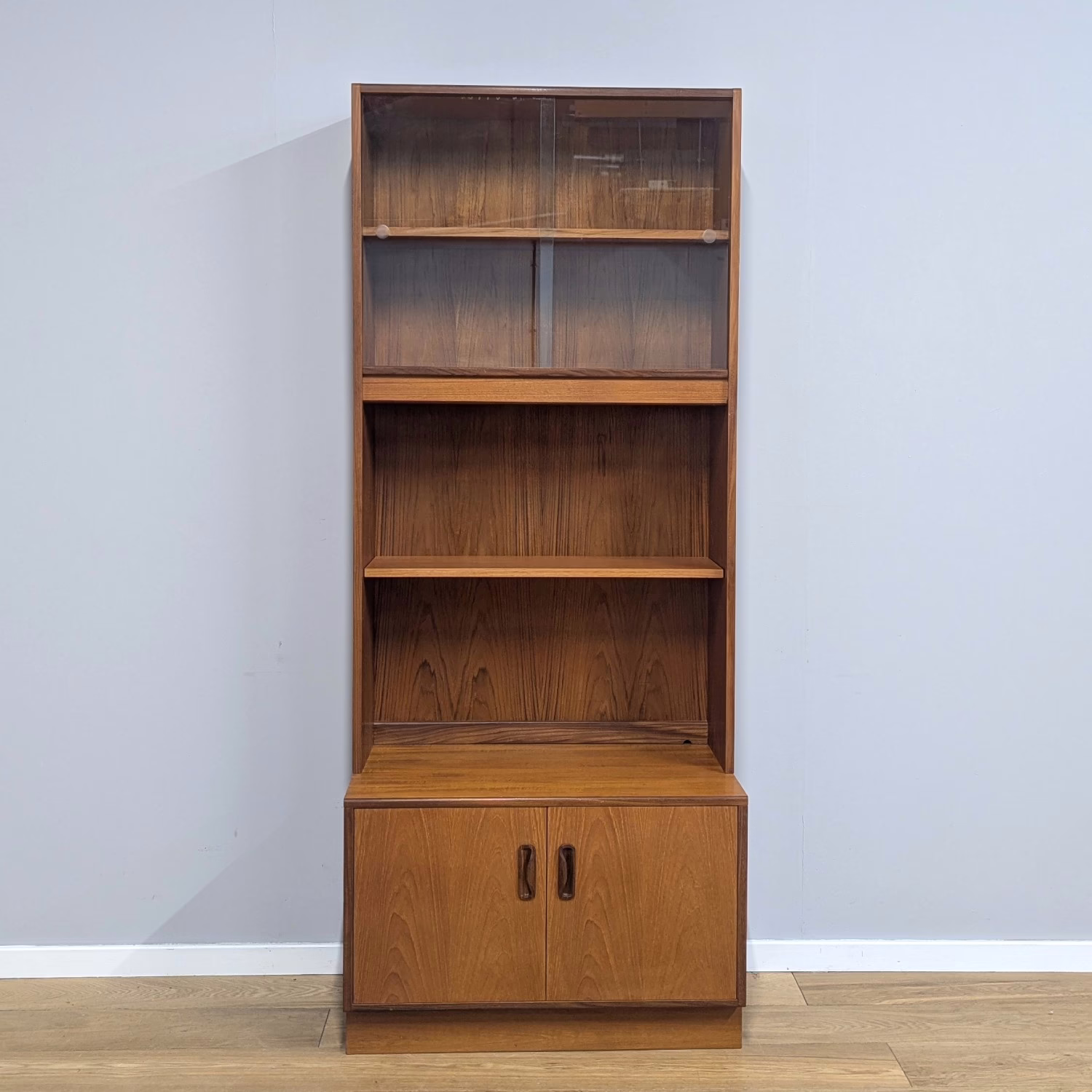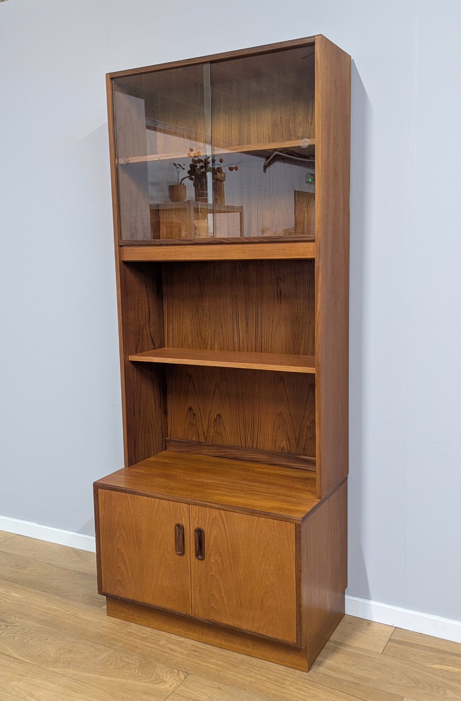 This is an original, vintage piece that is ‘sold as seen’. It is in very good, used condition. We have checked, cleaned and polished this piece, applying a natural beeswax polish to the exterior wood surfaces but otherwise the finish is original. It’s a two part, freestanding piece where the upper section simply sits on the base. Brackets are supplied to attached the top the the base for stability and peace of mind. The upper section features a double door, glazed bookcase with an adjustable shelf inside. The doors are in very good order, slide well and the interior is in a great order. Below this is a further open, adjustable shelf. The base section features a cupboard again in very good order. There is a further adjustable shelf inside. There are very minor knocks and scuffs here and there on the exterior wood but nothing to flag. Please do browse through our photos. The G Plan red logo can be found on the top of the upper section and inside the cupboard. It’s solid, stable and well-made. If you’ve any questions or would like to view the pieces, do get in touch.