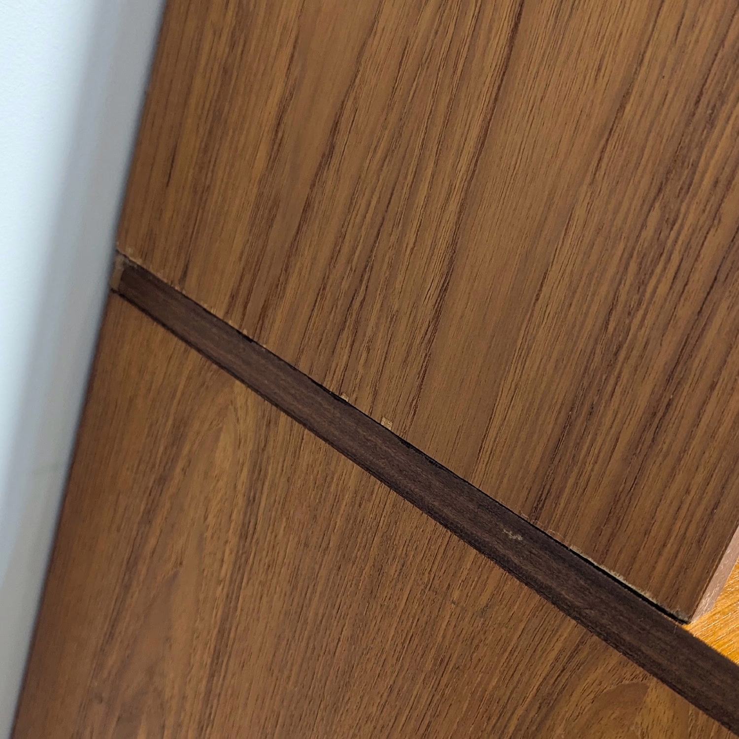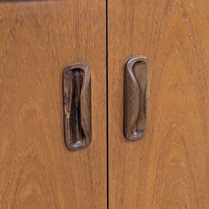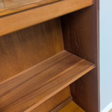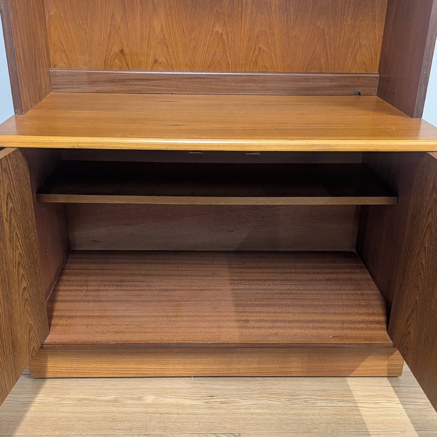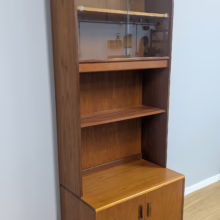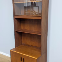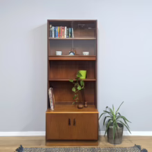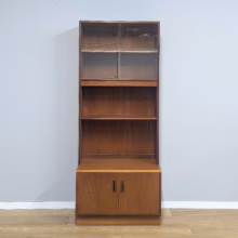 Designed by VB Wilkins for G Plan, as part of his late 1960s / early 1970s Fresco range, this freestanding, multi-functional unit serves as storage and display space in one handsome piece. Tall but shallow in depth and tidy in width, it would work well in a small room where going up is better than going wide. This particular set up features an upper glazed bookcase, an open shelf and a lower cupboard with the signature Fresco handles.  It’s a two-part piece with the upper section sitting on the deeper base. These versatile units offer more flexibility than built-in shelves and are great in alcoves or those recesses next to a chimney breast.