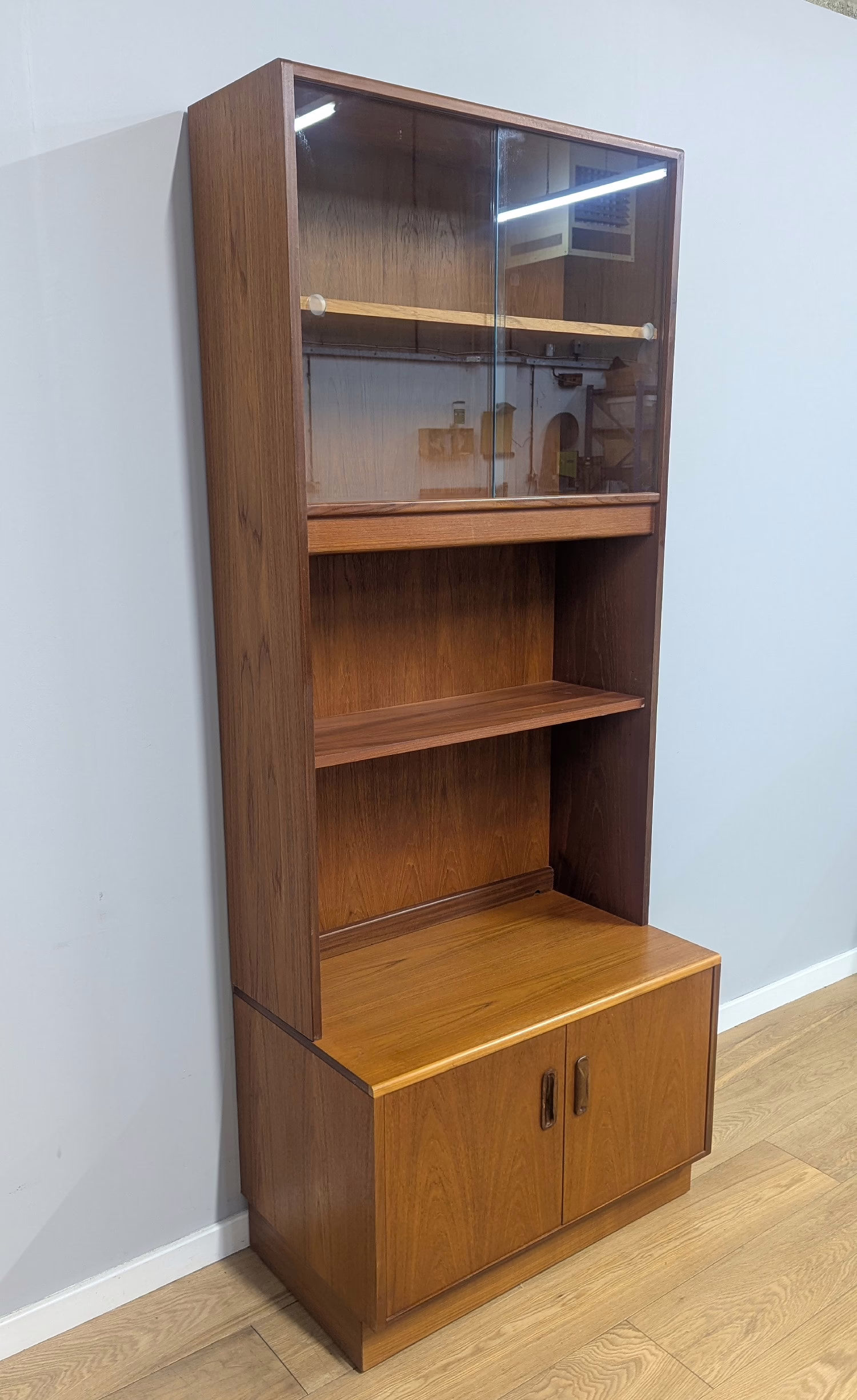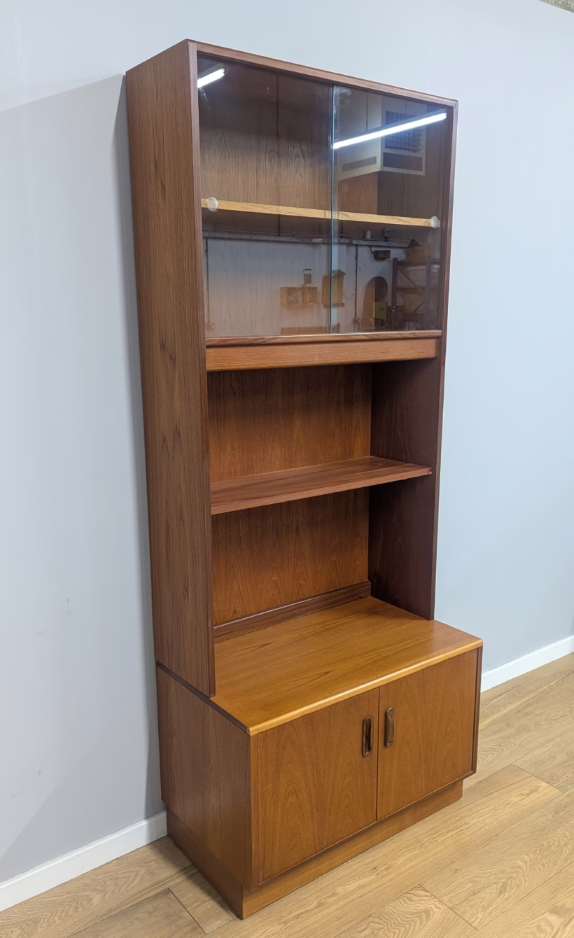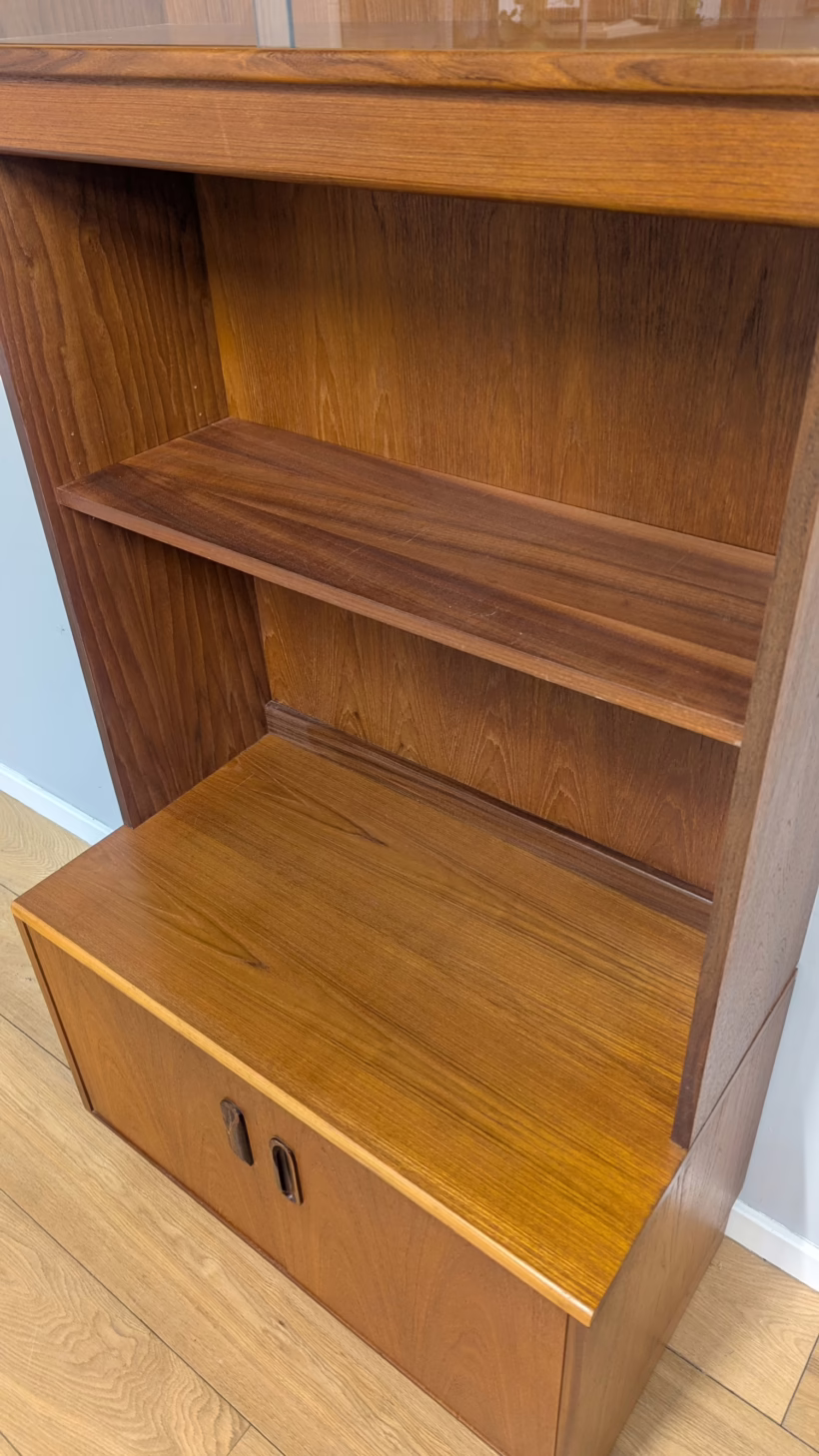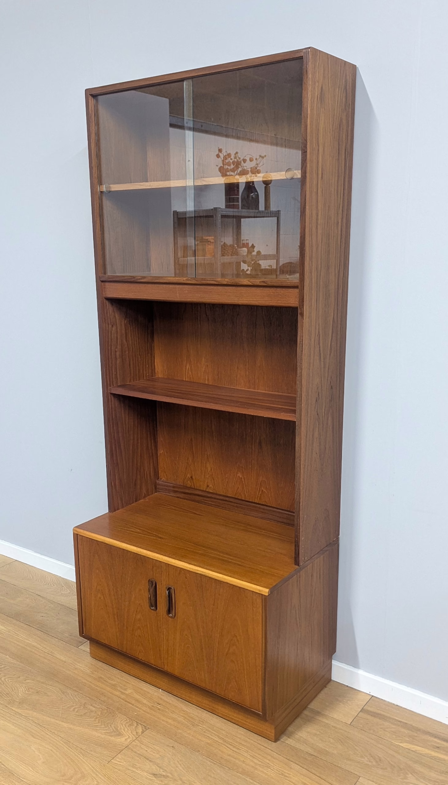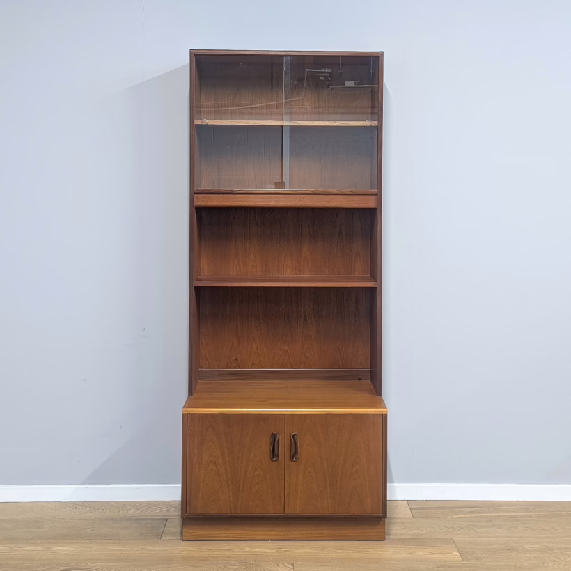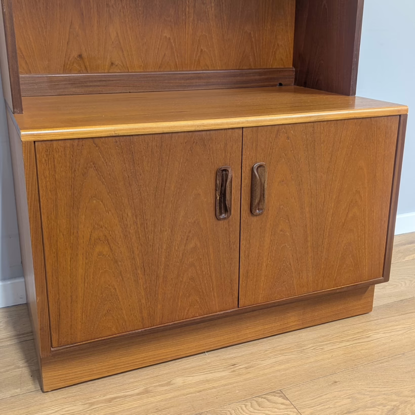This is an original, vintage piece that is ‘sold as seen’. It is in very good, used condition. We have checked, cleaned and polished this piece, applying a natural beeswax polish to the exterior wood surfaces but otherwise the finish is original. It’s a two part, freestanding piece where the upper section simply sits on the base. Brackets are supplied to attached the top the the base for stability and peace of mind. The upper section features a double door, glazed bookcase with an adjustable shelf inside. The doors are in very good order, slide easily and the interior is in a great order. Below this is a further open, adjustable shelf. The base section features a cupboard again in very good order. There is a further adjustable shelf inside. There are very minor knocks and scuffs here and there on the exterior wood including some small chips and nips on the sides as shown. Please do browse through our photos. The G Plan red logo can be found on the top of the upper section and inside the cupboard. There’s a further E Gomme label on the back date stamped 1977.  It’s solid, stable and well-made. If you’ve any questions or would like to view the pieces, do get in touch.