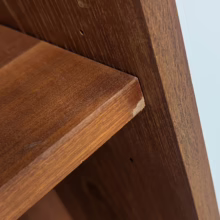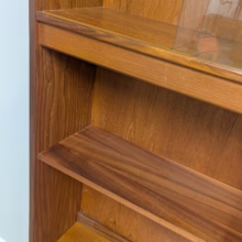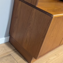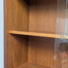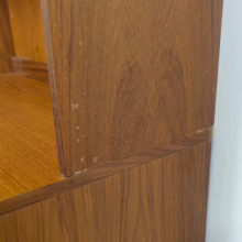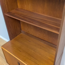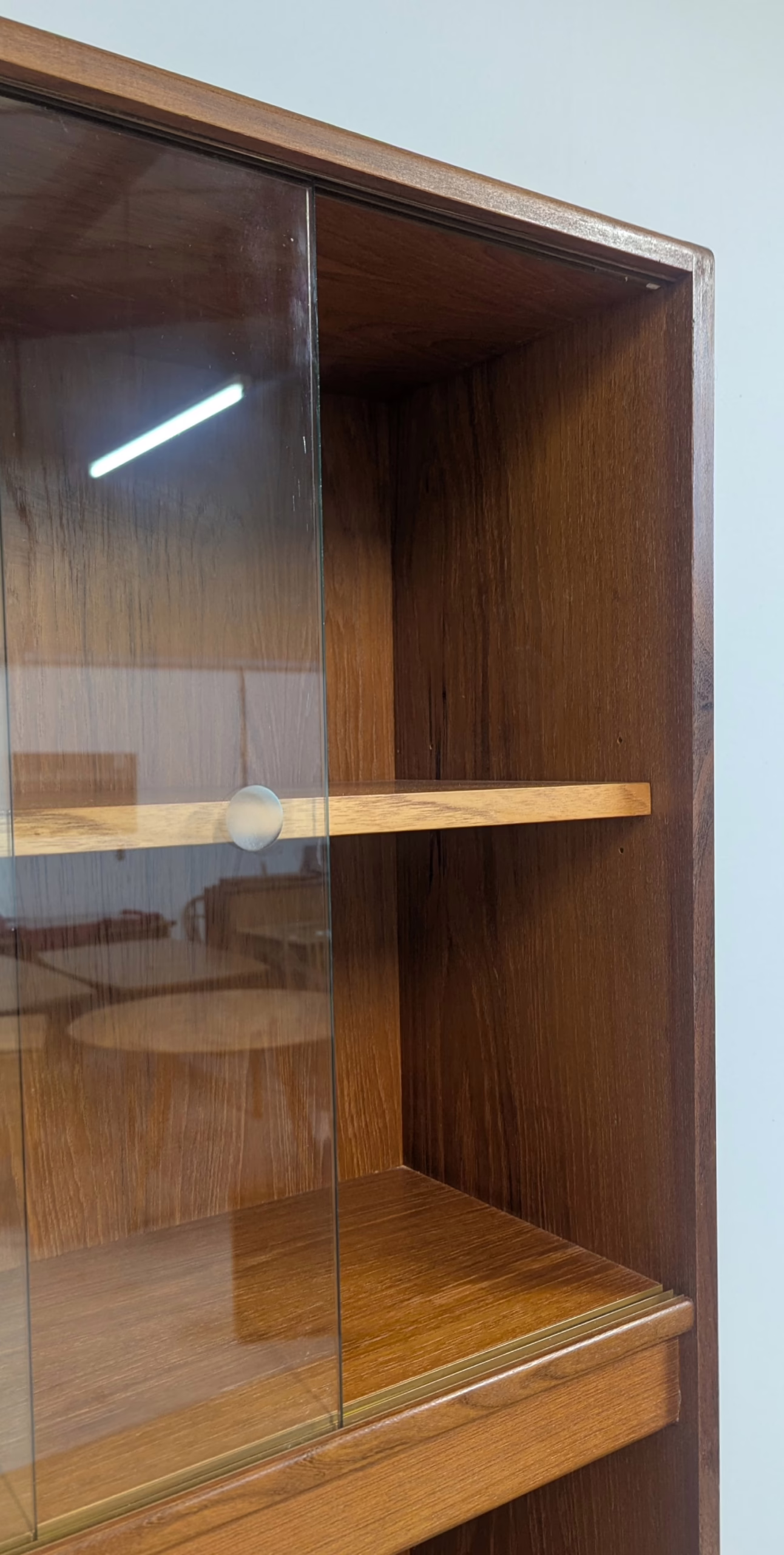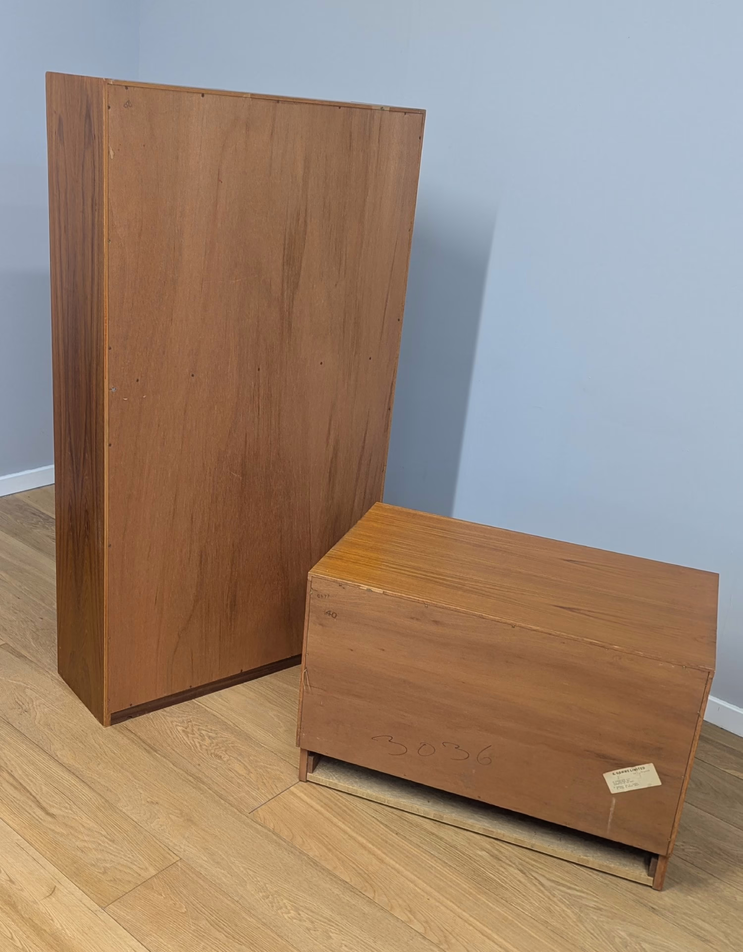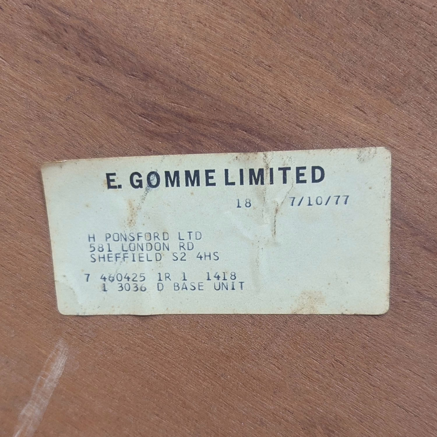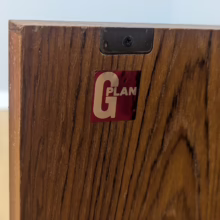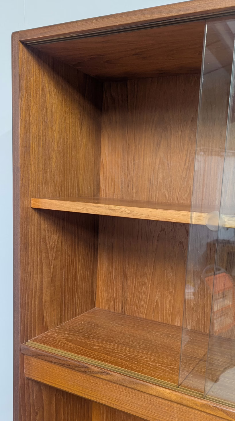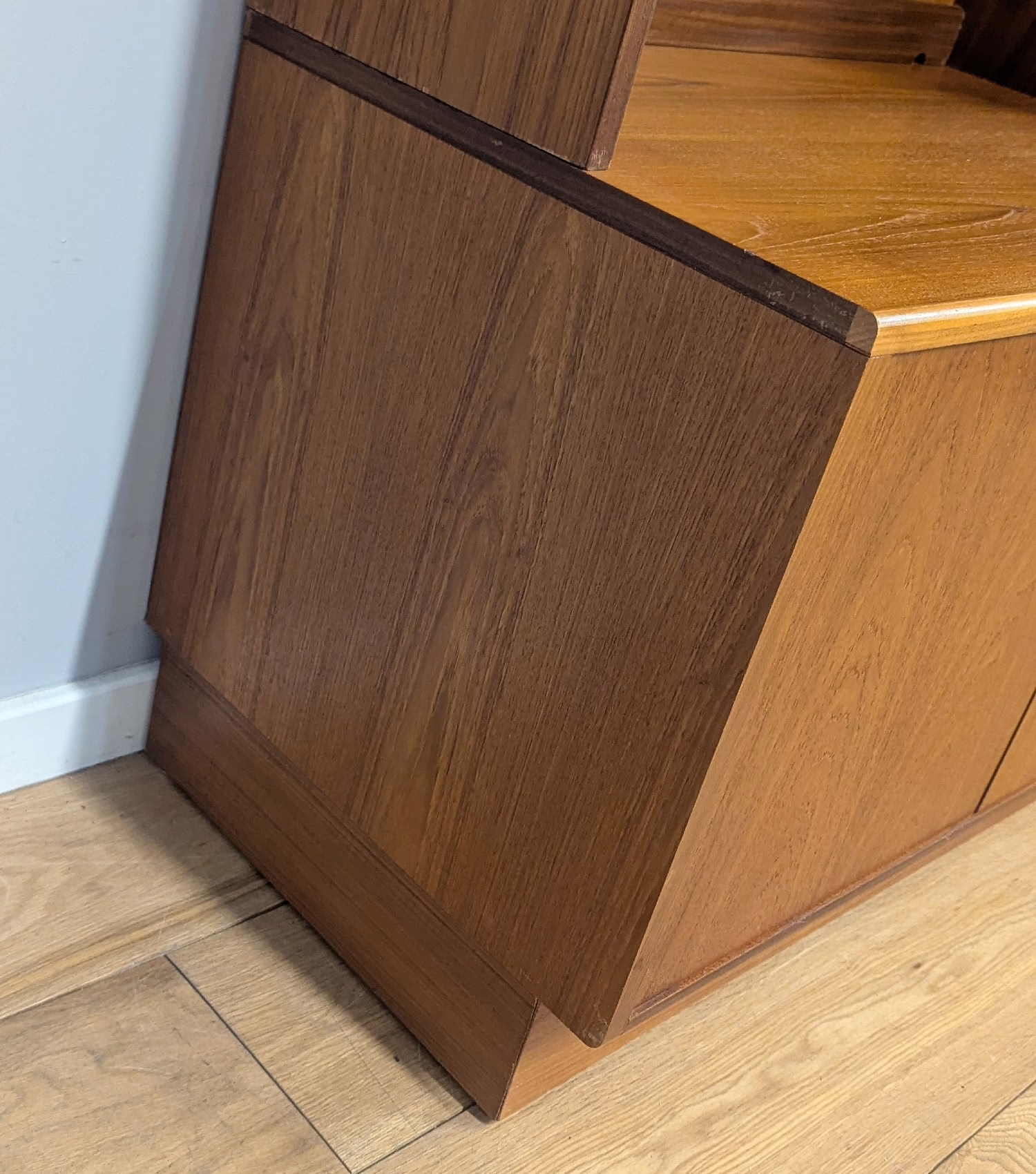 This is an original, vintage piece that is ‘sold as seen’. It is in very good, used condition. We have checked, cleaned and polished this piece, applying a natural beeswax polish to the exterior wood surfaces but otherwise the finish is original. It’s a two part, freestanding piece where the upper section simply sits on the base. Brackets are supplied to attached the top the the base for stability and peace of mind. The upper section features a double door, glazed bookcase with an adjustable shelf inside. The doors are in very good order, slide easily and the interior is in a great order. Below this is a further open, adjustable shelf. The base section features a cupboard again in very good order. There is a further adjustable shelf inside. There are very minor knocks and scuffs here and there on the exterior wood including some small chips and nips on the sides as shown. Please do browse through our photos. The G Plan red logo can be found on the top of the upper section and inside the cupboard. There’s a further E Gomme label on the back date stamped 1977.  It’s solid, stable and well-made. If you’ve any questions or would like to view the pieces, do get in touch.