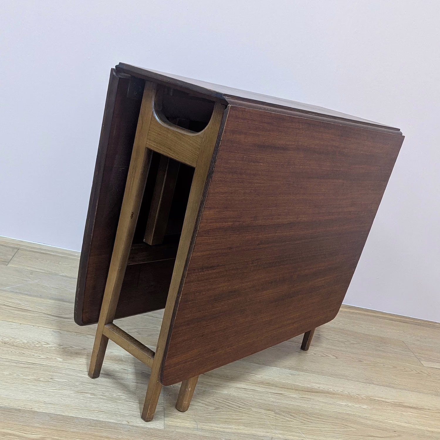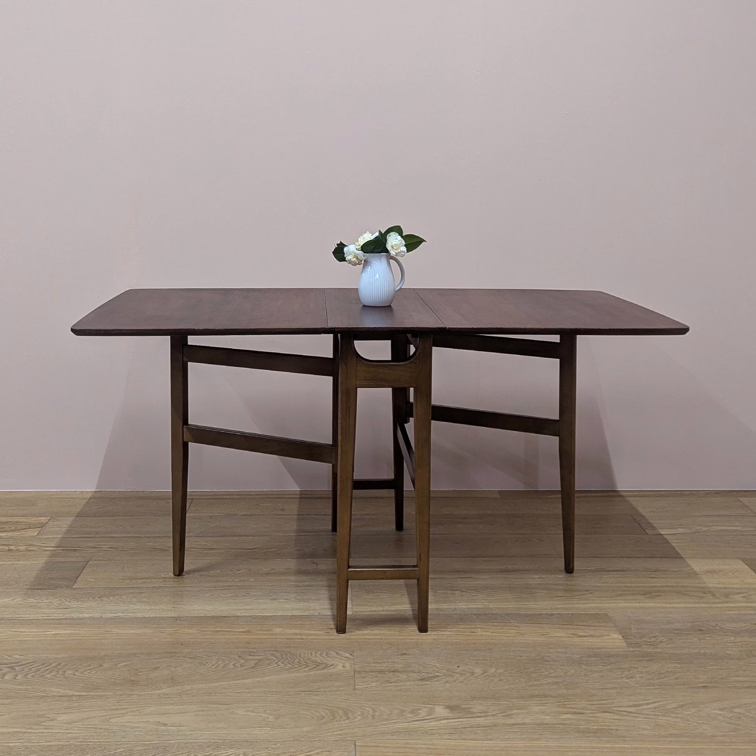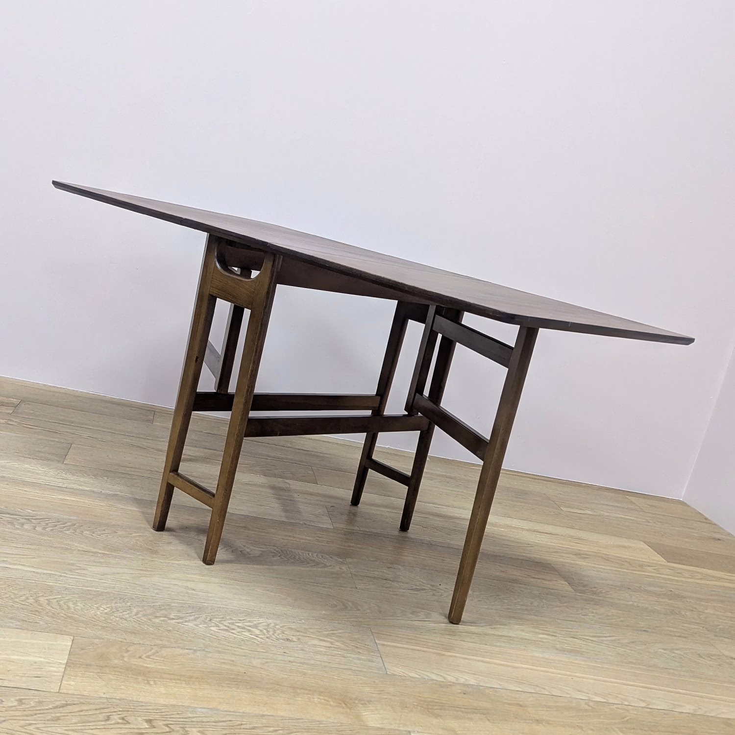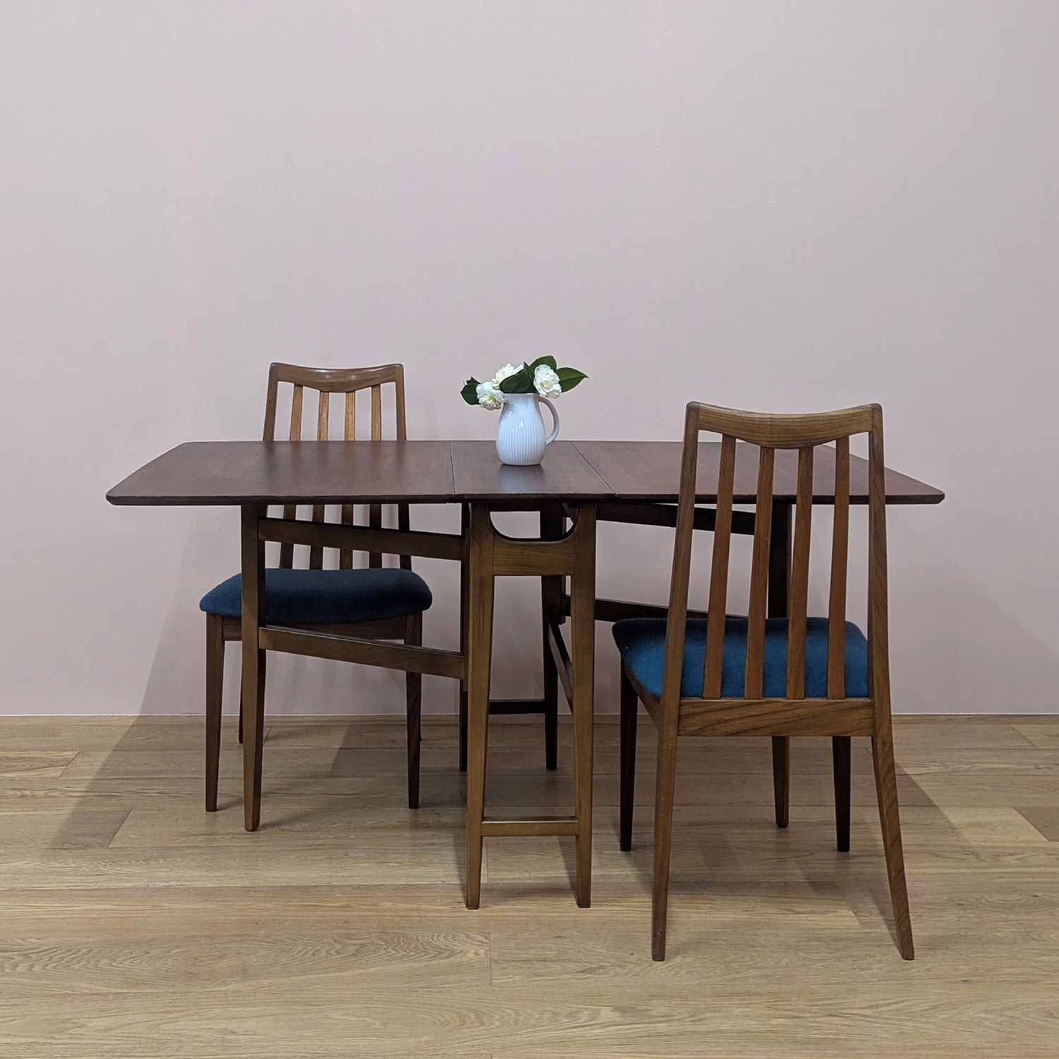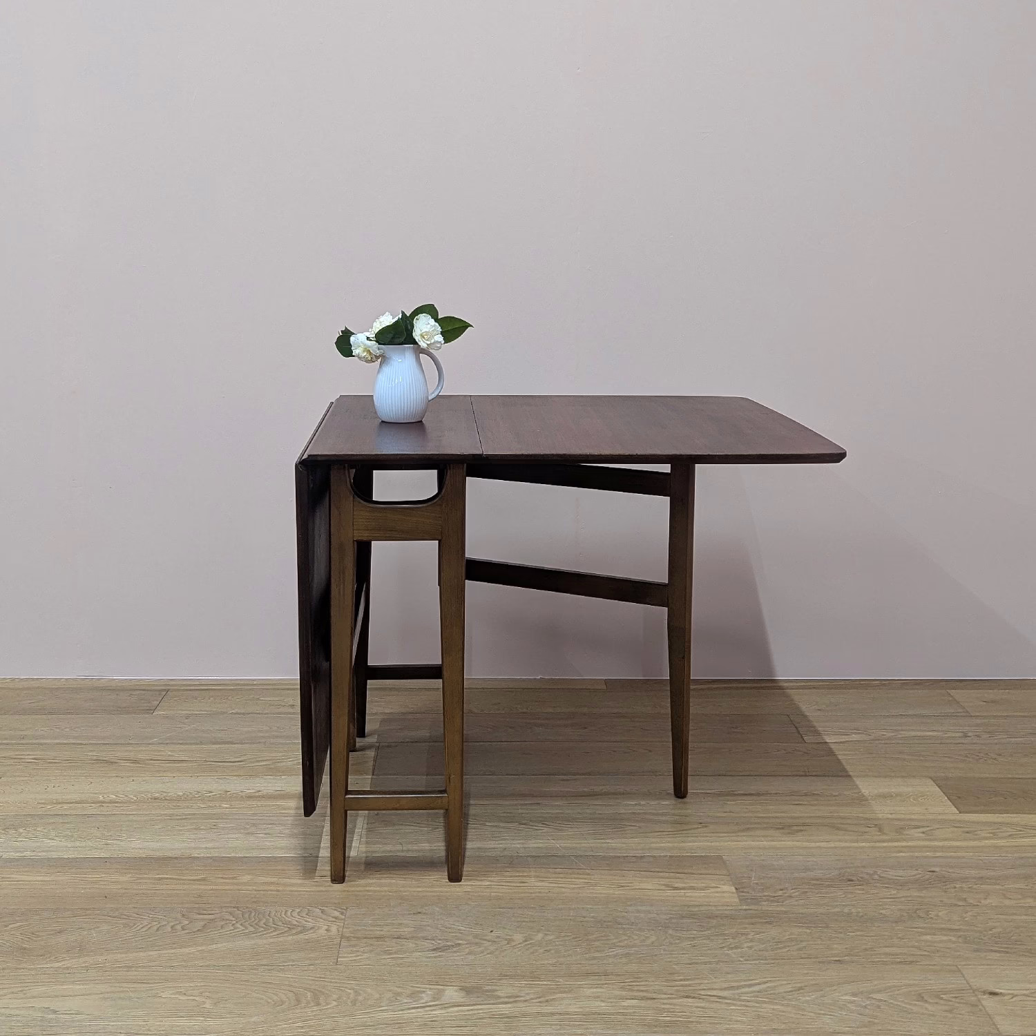 This space-saving table is perfect for small rooms. Fully extended, you have a generous, rectangular, teak dining table with classic, midcentury good looks for up to six diners and when not in use, the two leaves fold down to very compact proportions to tuck away neatly against the wall. Made by British furniture maker, Jentique, its construction is quality, the gate legs swinging out with ease to extend one side or both. And the table is in fantastic order. It’s clearly been taken great care of. These folding, gate leg tables are also good supplementary pieces for those times when lots of people are around – parties, Christmas, Easter. It can be easily set up for the occasion but then stowed away until the next big gathering.