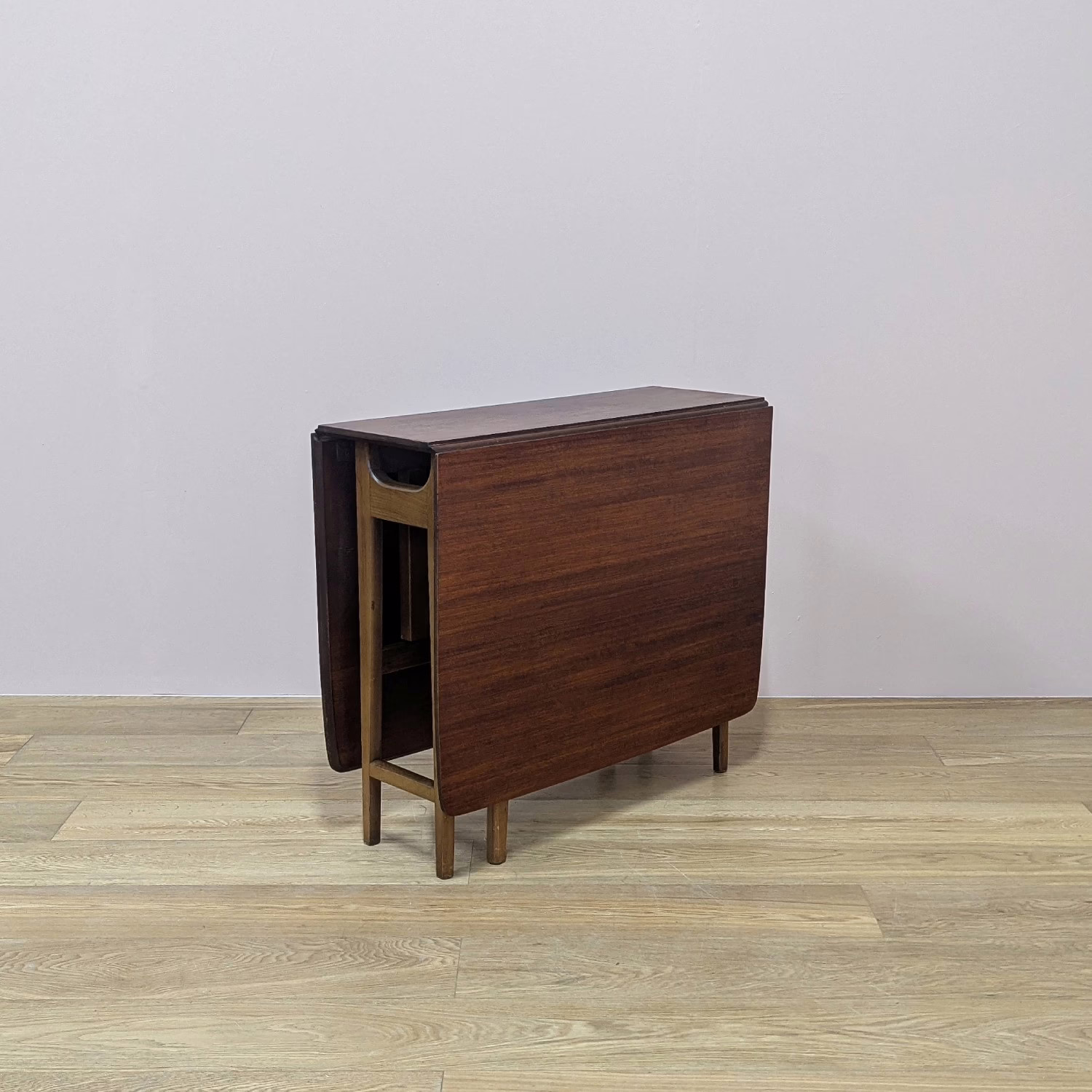This vintage table is ‘sold as seen’. It is in good – very good, used condition. We have checked and cleaned the table, applying a natural beeswax polish to the wood but otherwise the finish is original. The two drop leaves are extended by swinging out the gate legs underneath which slot into grooves underneath to prevent further movement. All hinges and mechanisms are in very good working order. The table top is in remarkable condition. A professional repair has been done at some point in the central section which we have shown but it’s very discreet and well done. There are a couple of very minor nips to the veneer but again, these are barely noticeable. Otherwise, there are just very light scuffs and marks here and there to the edges, base and legs, as you would expect with a vintage piece of this age – do browse our photos for an accurate representation of tone and condition. It is solid and sturdy with no wobbles or signs of repair. There isn’t a Jentique marker’s mark but this is a well-documented, popular design of theirs.  If you’ve any questions or would like to take a look at this table, please get in touch.