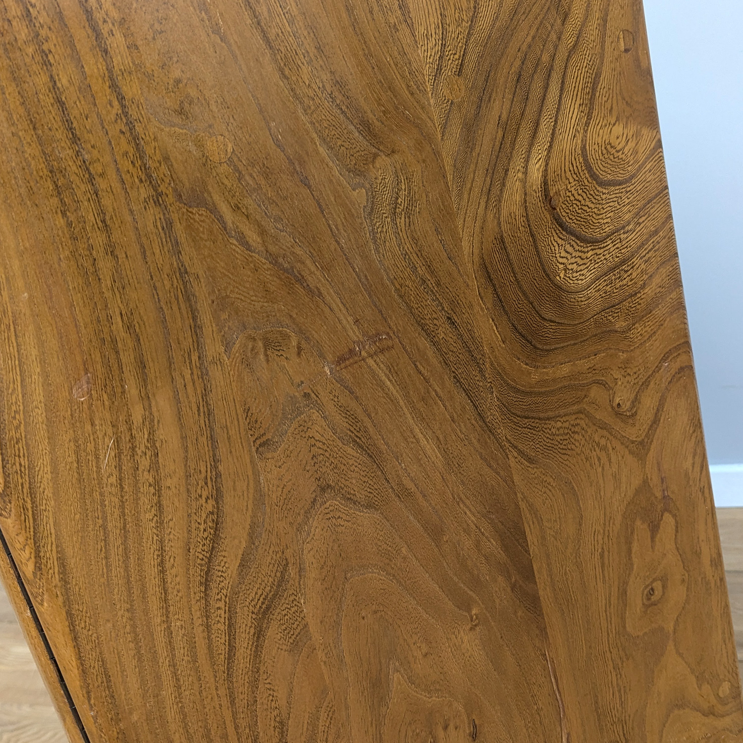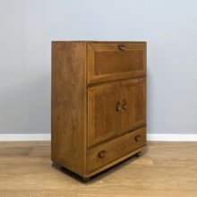 This original, used piece is ‘sold as seen’. It’s in good – very good, vintage condition. We have cleaned the cabinet, applying a natural beeswax polish to the exterior surfaces but otherwise left the original finish alone as it’s in such great order. It features Ercol’s signature visible dovetail joints on its corners and the doors and fall are fitted with full length hinges. All handles are in good order and securely attached. The top cupboard interior is sectioned with an adjustable left hand shelf but sadly the right hand shelf is missing. The lower two-door cupboard has a single adjustable shelf. There is a full width drawer at the bottom which slides with ease and it sits on the original shepherd castors to give good mobility. All interiors are in very good, clean order, with just minor signs of use. Likewise, the exterior wood is in good order too, with just light marks here and there in line with its age and purpose. It has sustained some superficial scuffs on the right hand side which we’ve shown in our photos. The blue Ercol label is in place and it dates from the 1960s. Please do browse our photos for an accurate sense of its colour, grain and condition. If you have questions or would like to see this piece, just get in touch.