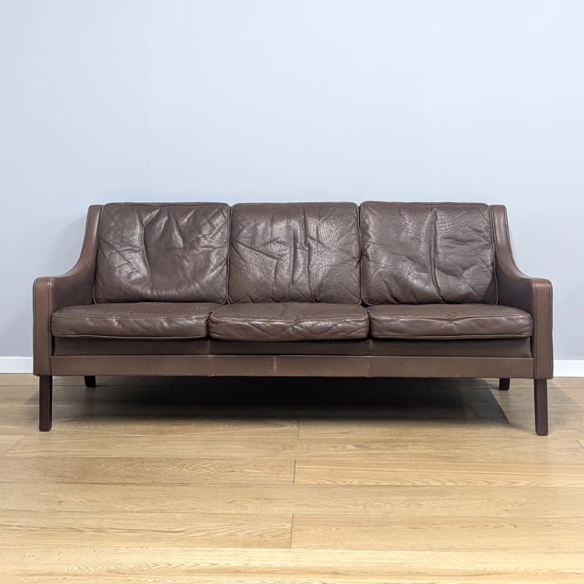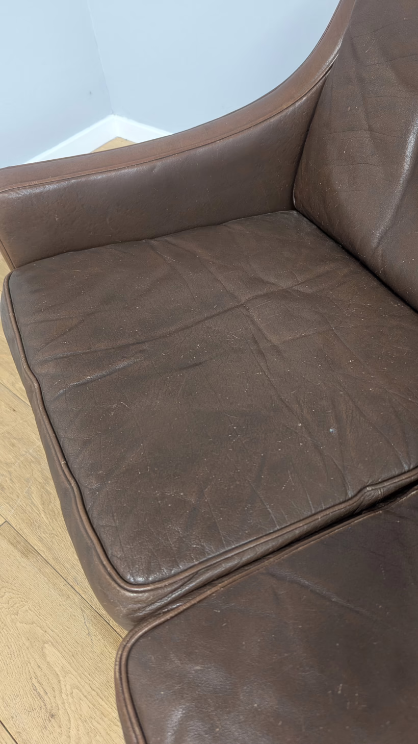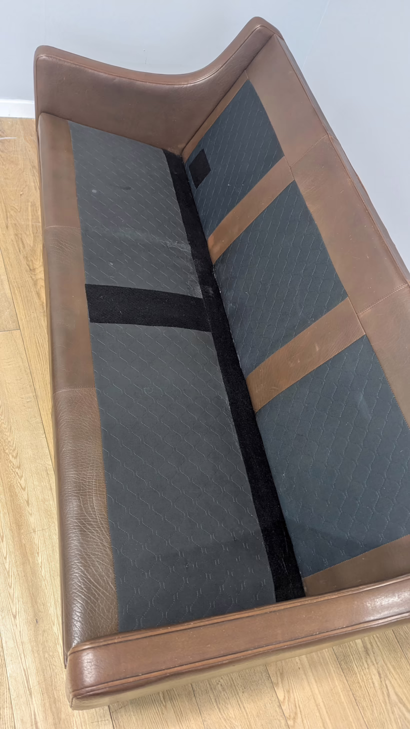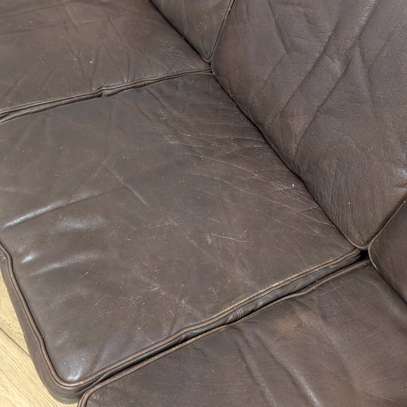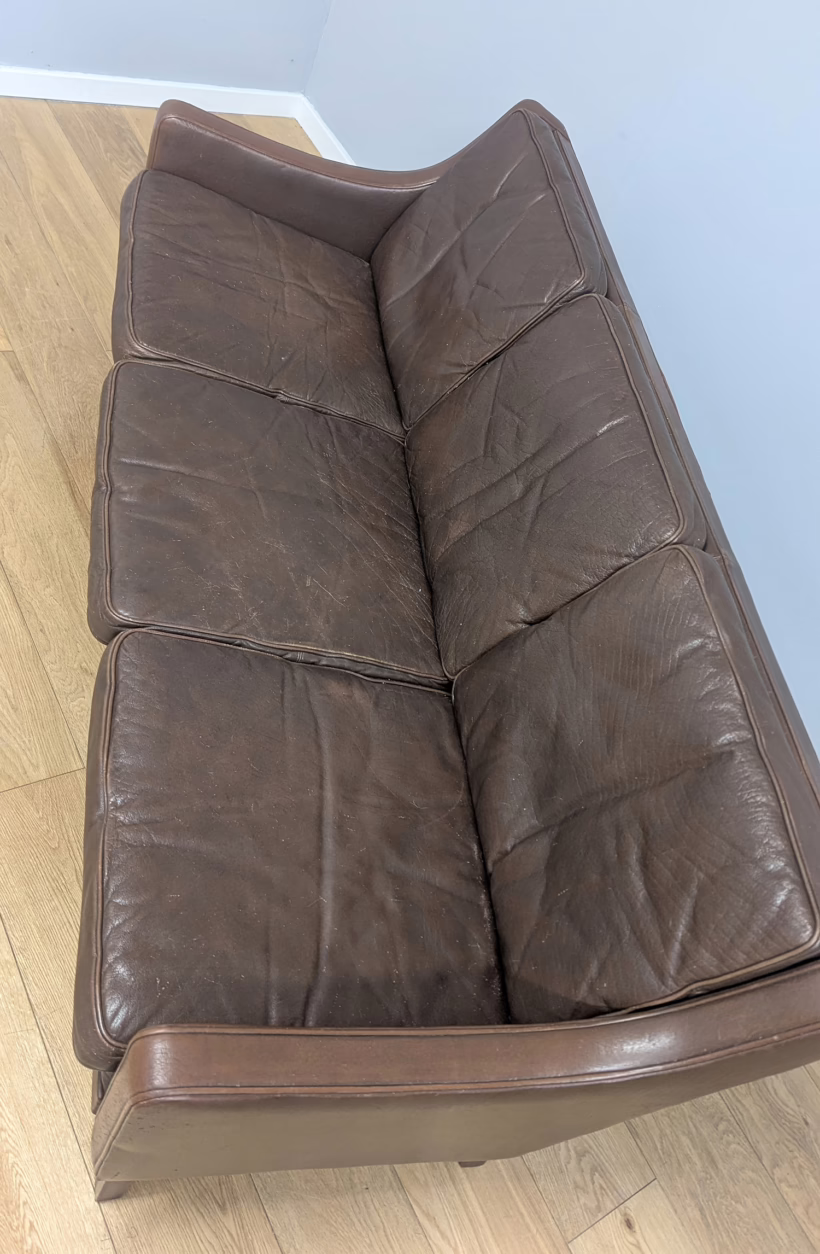 This original, vintage sofa is ‘sold as seen’. It is in good, used condition. The sofa has been checked and the leather upholstery cleaned with a specialist nourishing balm. The original mid-brown leather upholstery is in good order on the cushions. There are six cushions in total with working zips and plump cushion inners, all in good order. There are signs of wear and tear, some wrinkling and superficial scuffs, primarily on the seat cushions as they bear the brunt of use, but this is entirely as you would expect with used leather and is part of its nature. The fixed leather upholstery on the frame is in good order too, again with wrinkles, knocks and marks as shown, but we would classify this as minor in the overall context of the piece. Do browse our photos which show this. The finishing cloth underneath the seat cushions is lightly marked. Nothing unsavoury but as you can see in our photos, additional strips have been added to cover these marks and stabilise the finishing cloth. We haven’t done this ourselves but it’s been well done and obviously it doesn’t show as it’s underneath the cushions. The sofa is well constructed, solid and sturdy with no wobbles or creaks. It dates from the 1970s and was imported directly from Denmark. Please do browse our photos for a good sense of its condition and order. Any questions or if you would like to view this sofa, just get in touch.
