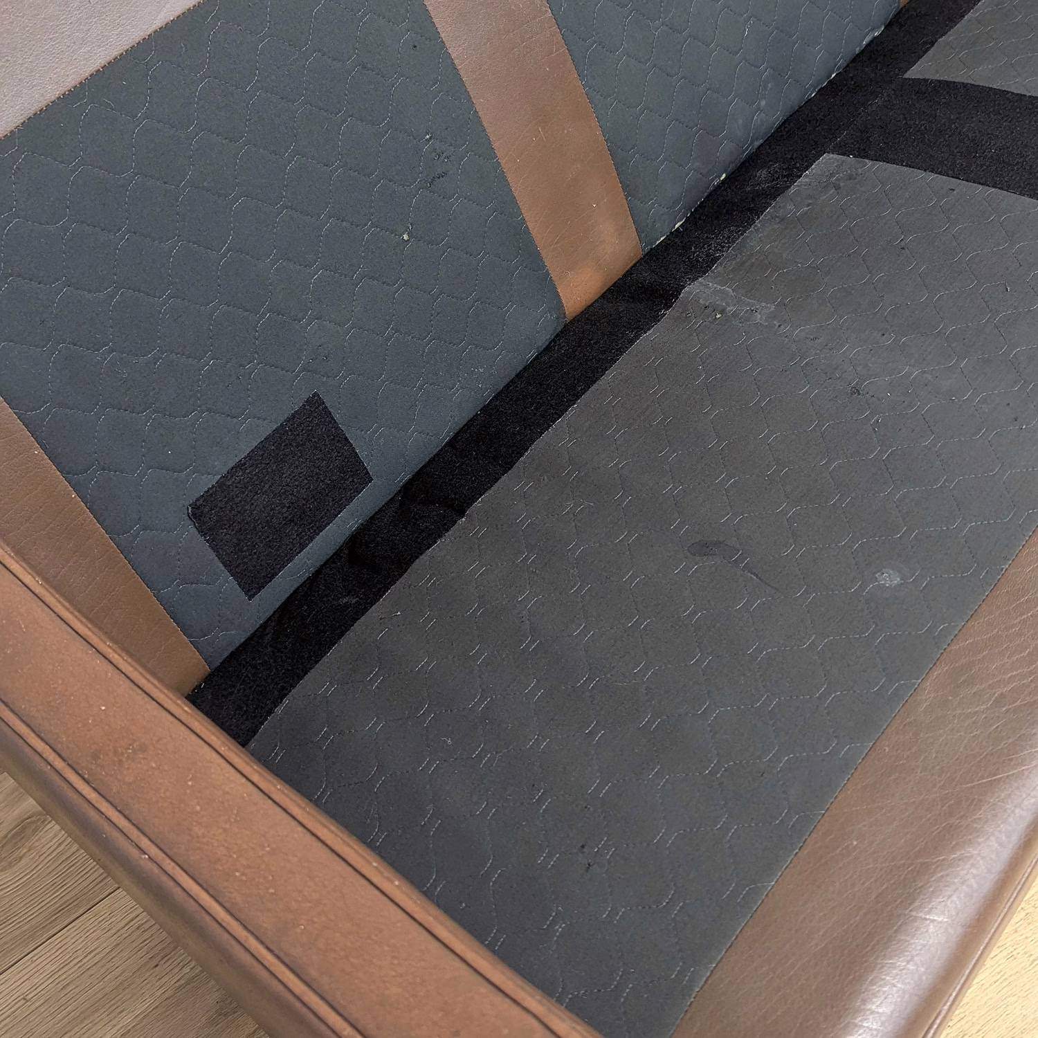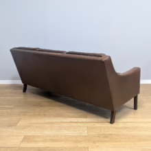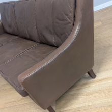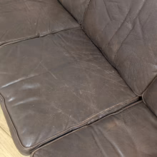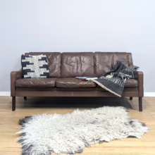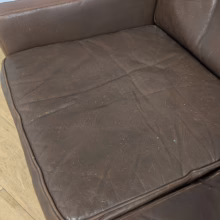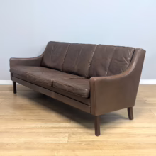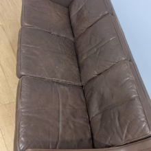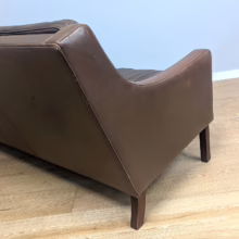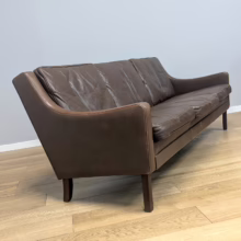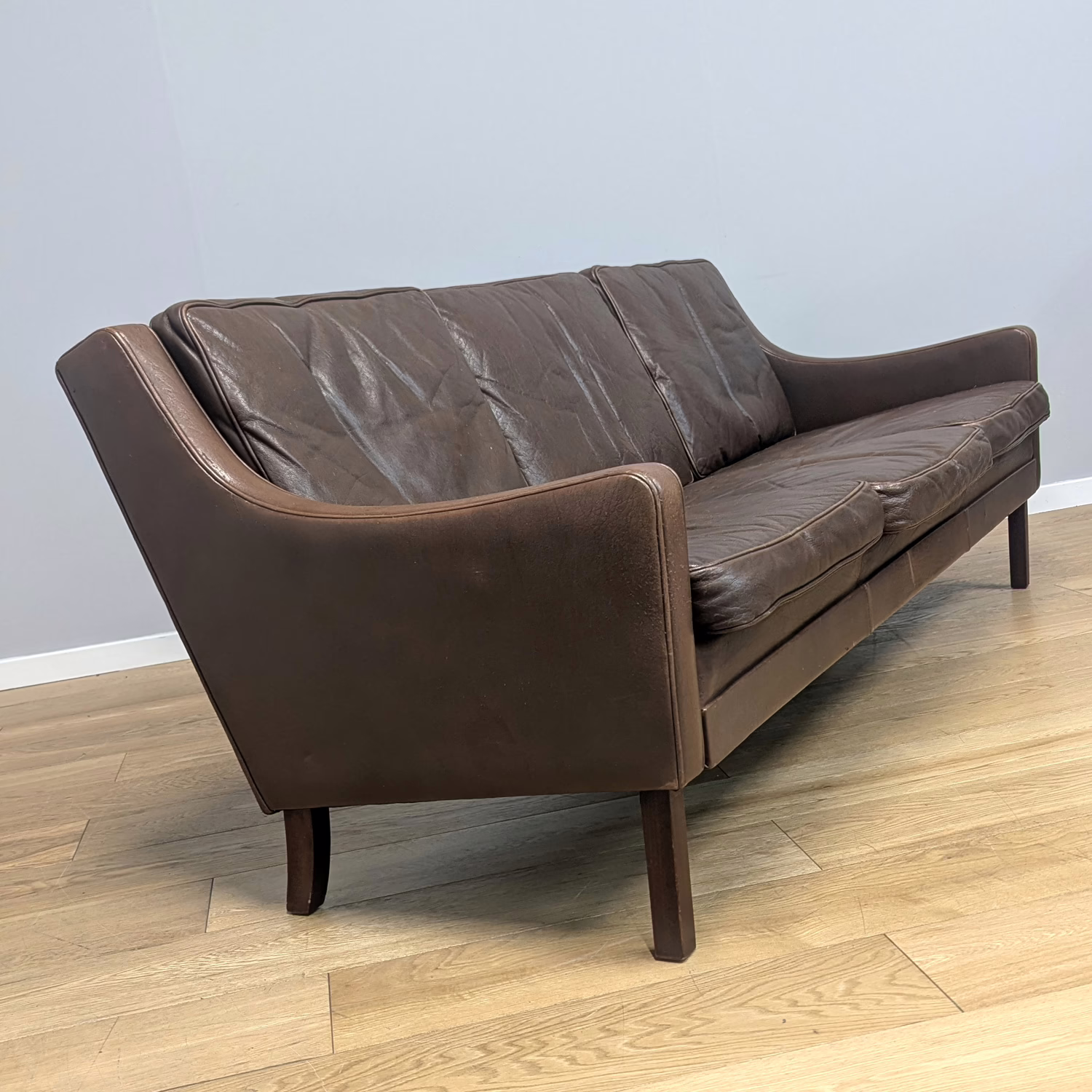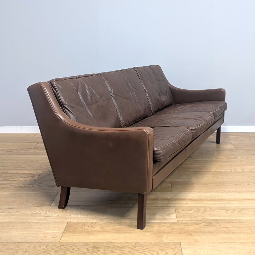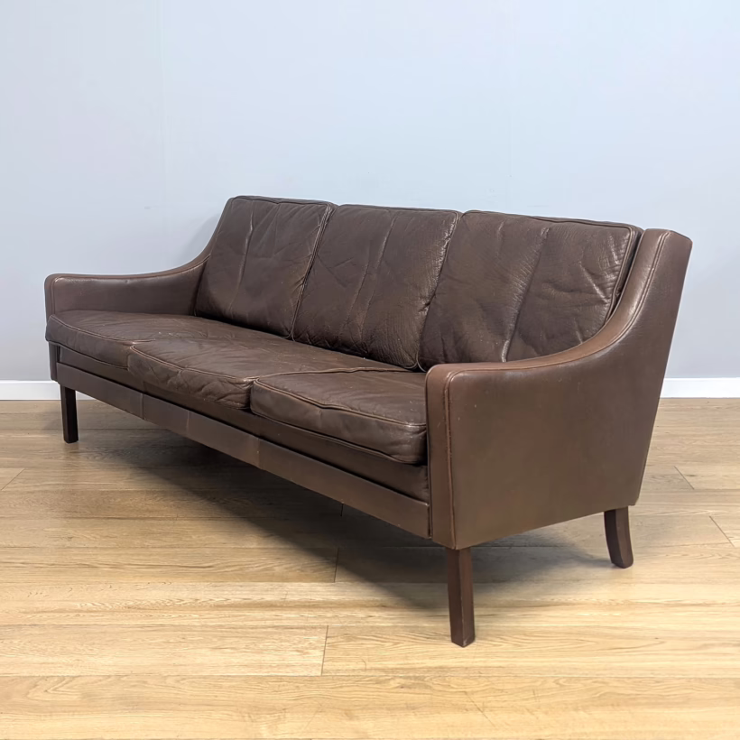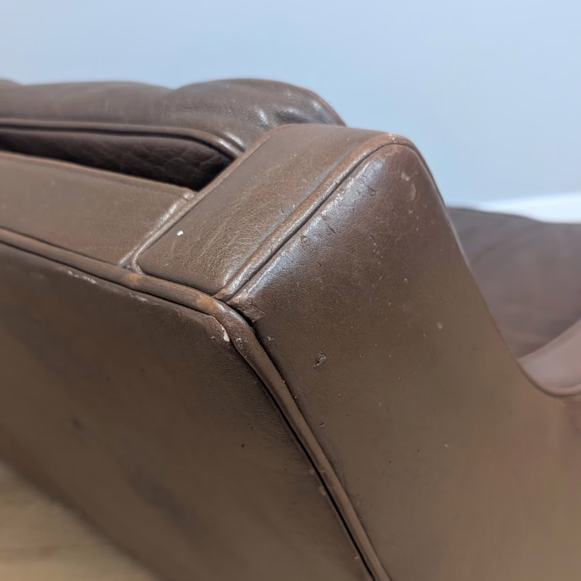 This original, vintage sofa is ‘sold as seen’. It is in good, used condition. The sofa has been checked and the leather upholstery cleaned with a specialist nourishing balm. The original mid-brown leather upholstery is in good order on the cushions. There are six cushions in total with working zips and plump cushion inners, all in good order. There are signs of wear and tear, some wrinkling and superficial scuffs, primarily on the seat cushions as they bear the brunt of use, but this is entirely as you would expect with used leather and is part of its nature. The fixed leather upholstery on the frame is in good order too, again with wrinkles, knocks and marks as shown, but we would classify this as minor in the overall context of the piece. Do browse our photos which show this. The finishing cloth underneath the seat cushions is lightly marked. Nothing unsavoury but as you can see in our photos, additional strips have been added to cover these marks and stabilise the finishing cloth. We haven’t done this ourselves but it’s been well done and obviously it doesn’t show as it’s underneath the cushions. The sofa is well constructed, solid and sturdy with no wobbles or creaks. It dates from the 1970s and was imported directly from Denmark. Please do browse our photos for a good sense of its condition and order. Any questions or if you would like to view this sofa, just get in touch.
