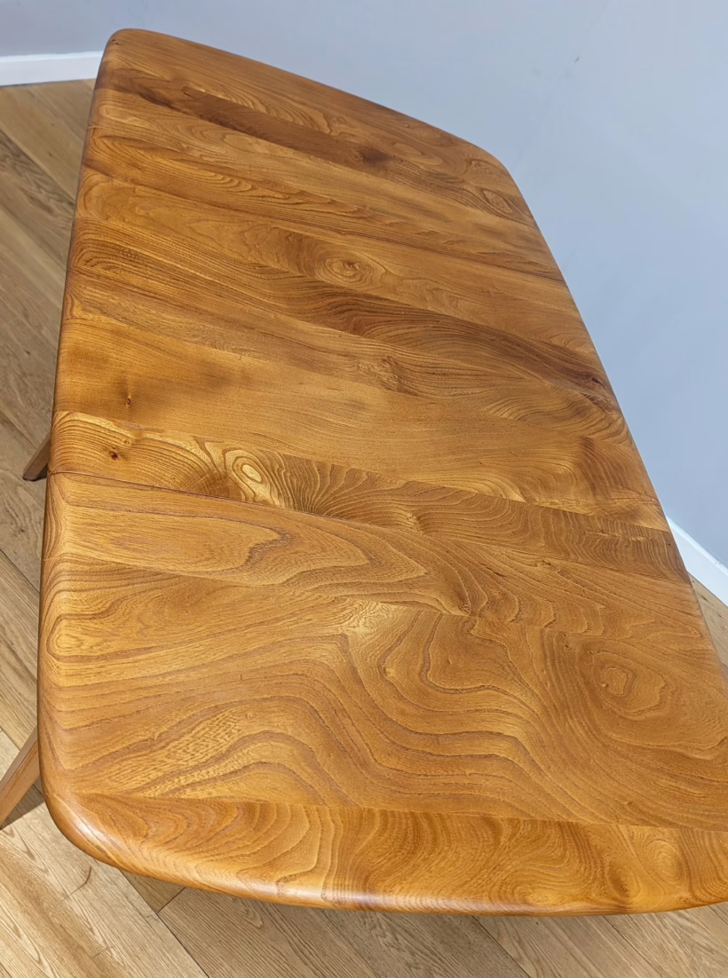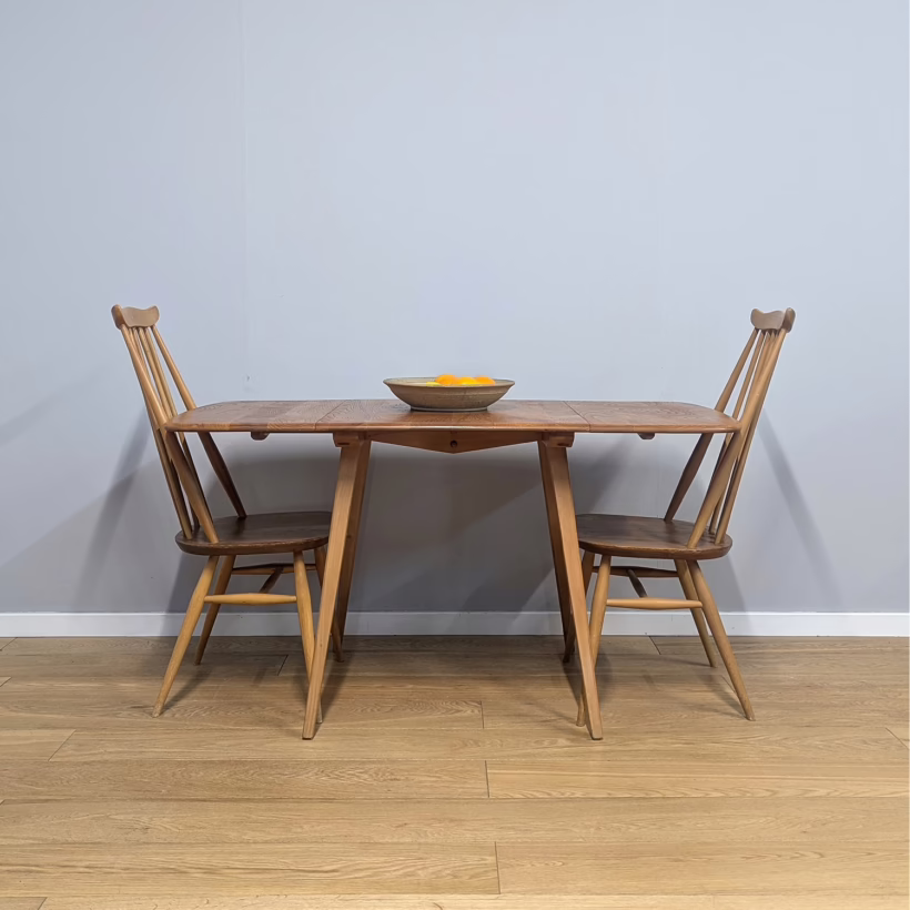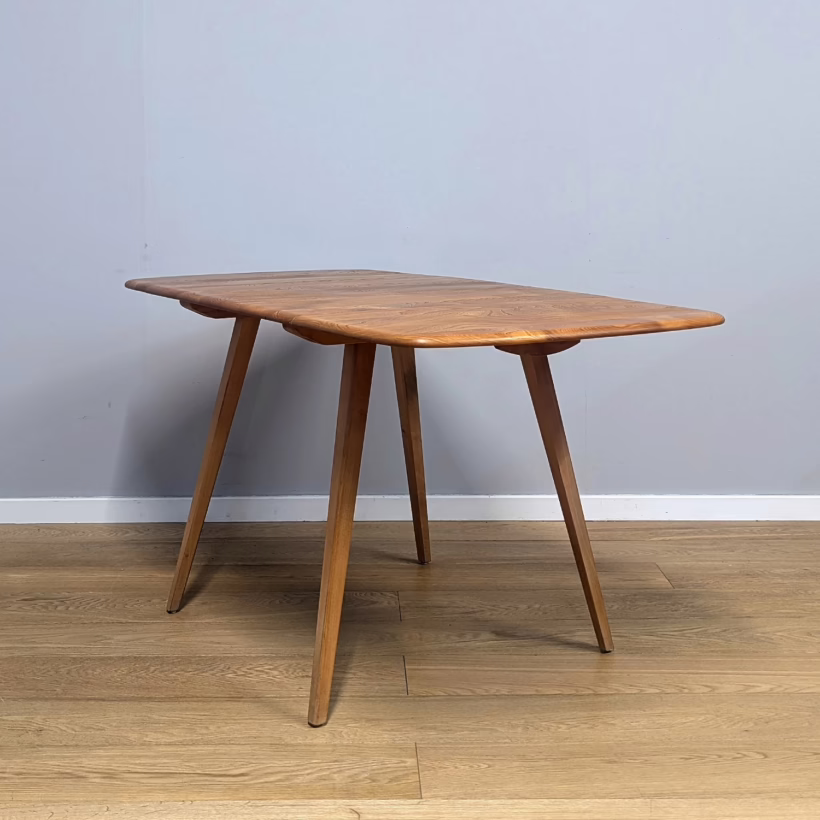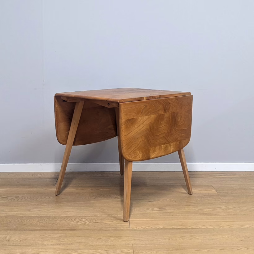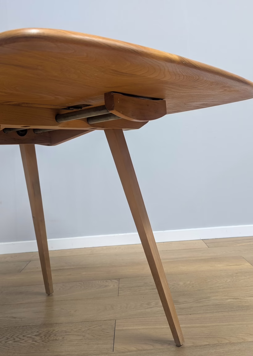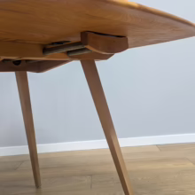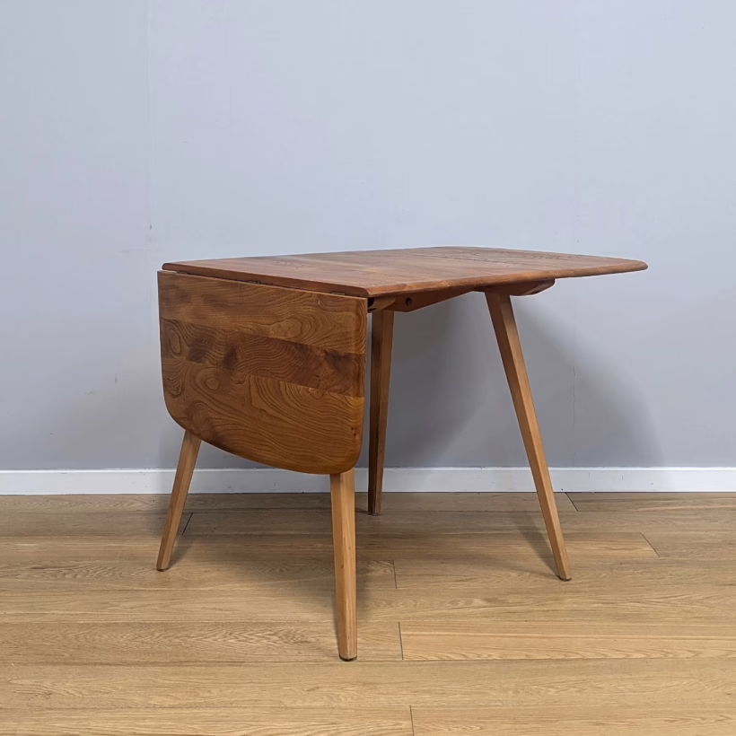 This original, vintage table is ‘sold as seen’. It is in very good, used condition. We have checked and cleaned the table, and the table top has been fully restored, a process that involved chemically stripping away the original finish (gentler than sanding ensuring the vintage character of the piece isn’t removed entirely), followed by layers of oil and then wax polish for a durable, consistent finish. The table underside and legs have been cleaned and buffed with a natural beeswax polish but otherwise the finish is original here. It carries some very light scuffs and marks here and there, as you would expect with a vintage piece of this age – do browse our photos for an accurate representation of tone and condition. It is solid and sturdy with no wobbles or signs of repair. The drop leaves extend by lifting and pulling out the arms underneath. All mechanisms and hinges are in very good, working order. Sadly the blue Ercol sticker is no longer in place but it’s undoubtedly Ercol and the table dates from sixties. If you’ve any questions or would like to take a look at this table, please get in touch.
