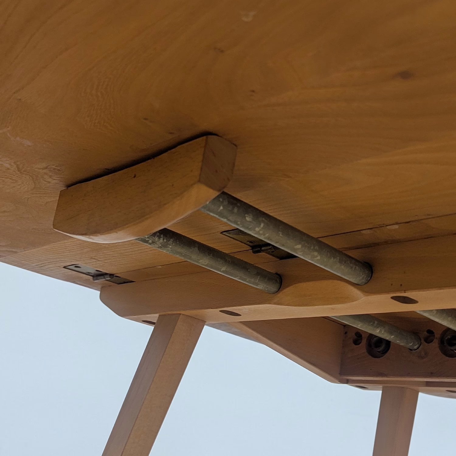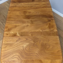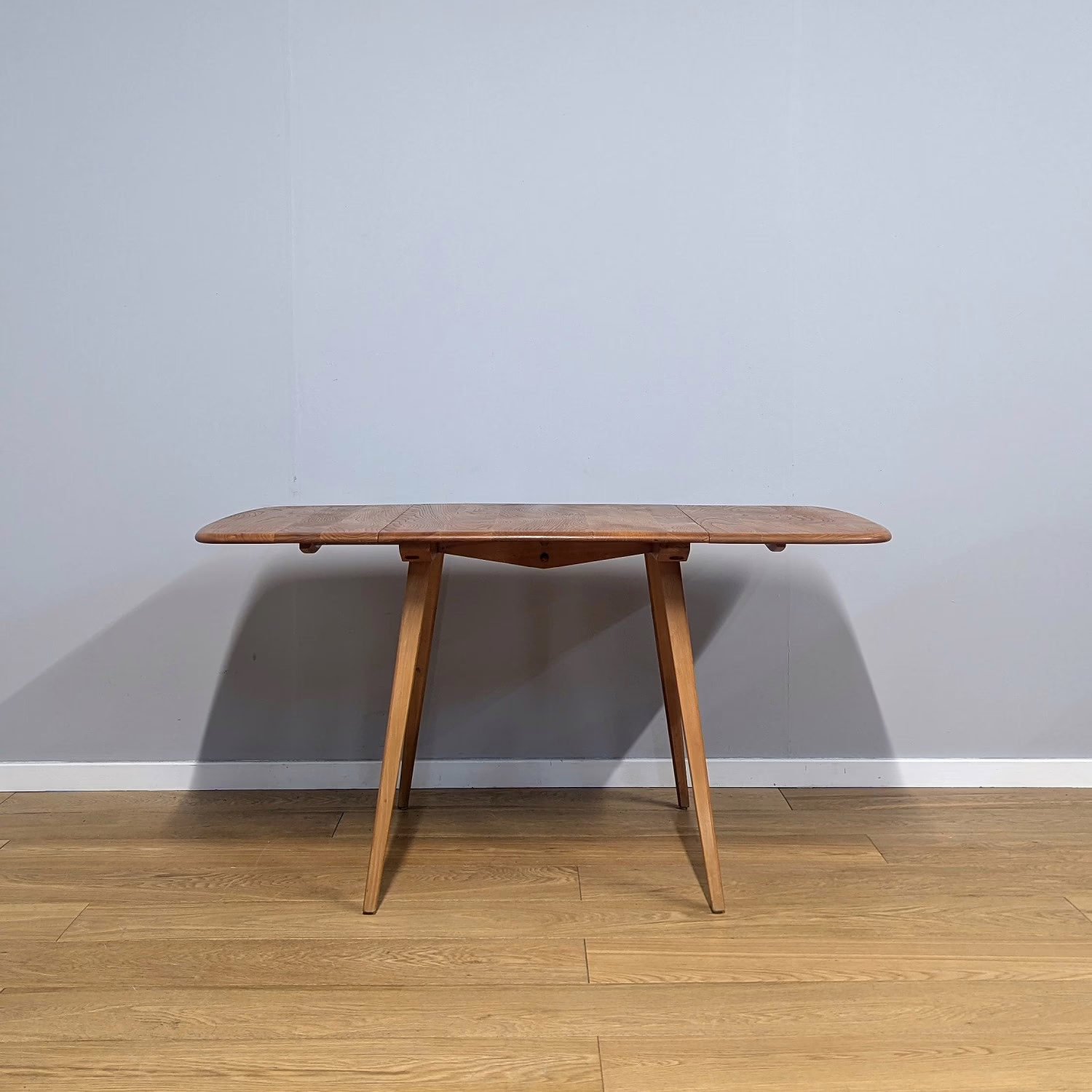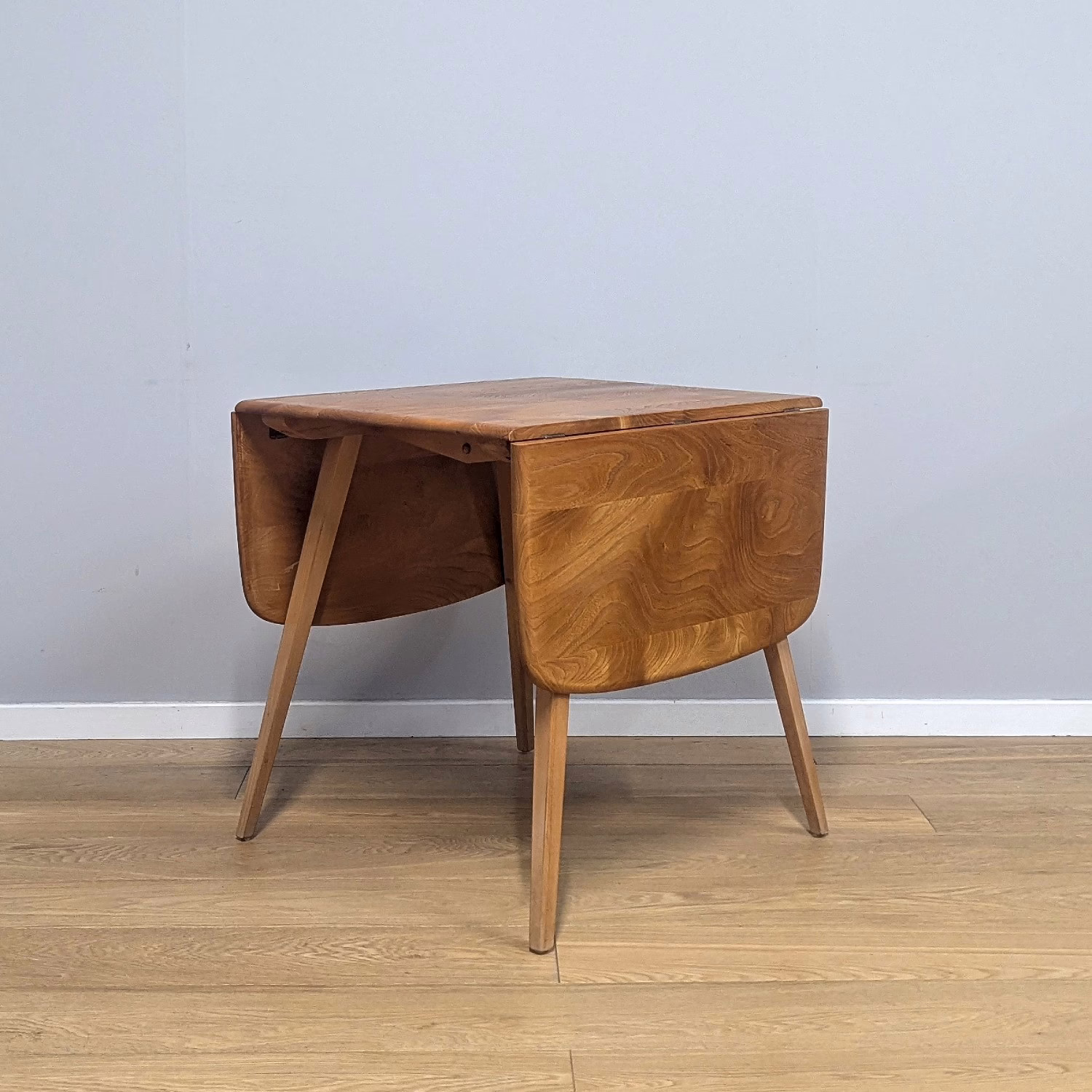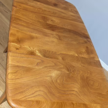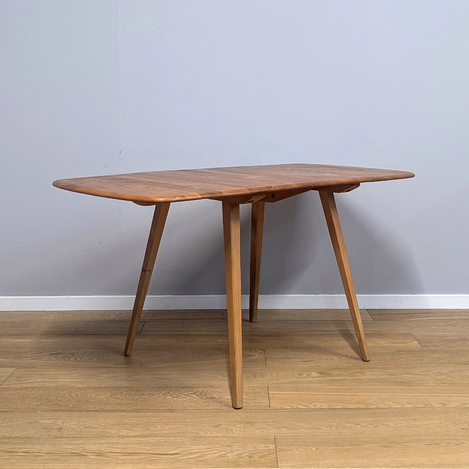 This original, vintage table is ‘sold as seen’. It is in very good, used condition. We have checked and cleaned the table, and the table top has been fully restored, a process that involved chemically stripping away the original finish (gentler than sanding ensuring the vintage character of the piece isn’t removed entirely), followed by layers of oil and then wax polish for a durable, consistent finish. The table underside and legs have been cleaned and buffed with a natural beeswax polish but otherwise the finish is original here. It carries some very light scuffs and marks here and there, as you would expect with a vintage piece of this age – do browse our photos for an accurate representation of tone and condition. It is solid and sturdy with no wobbles or signs of repair. The drop leaves extend by lifting and pulling out the arms underneath. All mechanisms and hinges are in very good, working order. Sadly the blue Ercol sticker is no longer in place but it’s undoubtedly Ercol and the table dates from sixties. If you’ve any questions or would like to take a look at this table, please get in touch.