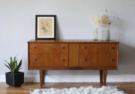 Matching pairs of bedside stands are some of our most requested items but also some of the hardest to source because they are frequently separated over the years. This midcentury duo are a delight, neat and tidy in stature but giving you just the right amount of shelf / table top and hidden storage that you might need beside your bed. Simple and elegant in design, this long-legged, modernist pair have accents of different wood tones with a high gloss, lacquer finish on the external surfaces. We love the cutaway sides, the silver pull handles and the pinstripes of grain.