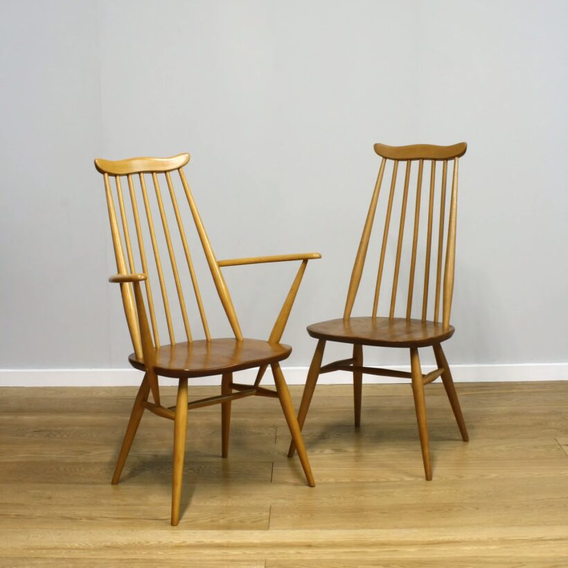 This original, vintage pair of chairs is ‘sold as seen’. Overall, both chairs are in good, used condition. We have given the chairs a thorough clean and polish with a natural beeswax but otherwise we have left their original finish alone, such is its great order. There are minor, superficial scuffs and marks here and there, as you might expect with furniture of this age and purpose (high use!), including a scratch on the top back of the carver which we’ve clearly shown in our photos. Overall, we would class the wear and tear on the chairs as light. They are superbly crafted, stable and sturdy with no repairs. The blue label is affixed to the back of the carver chair and they are stamped underneath.