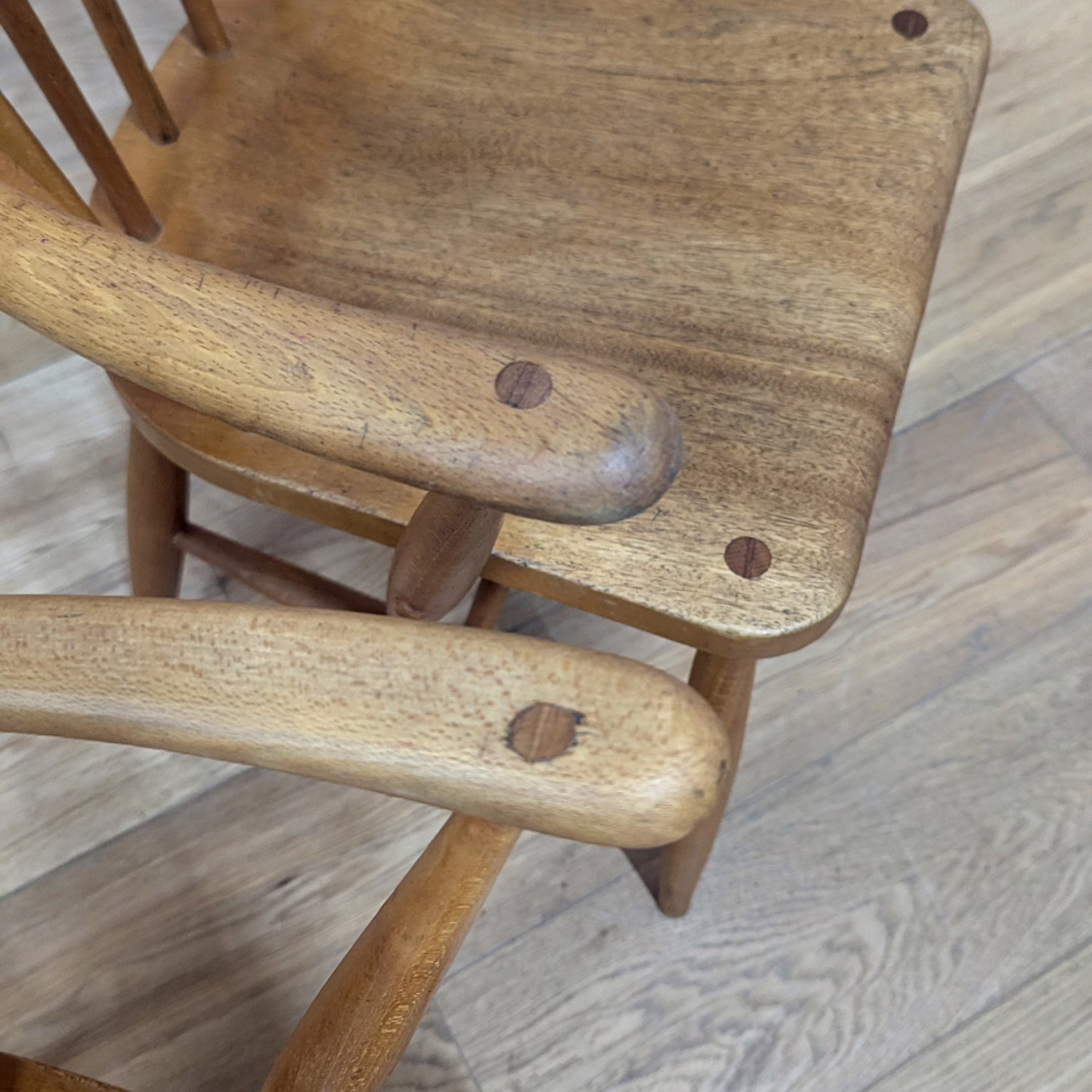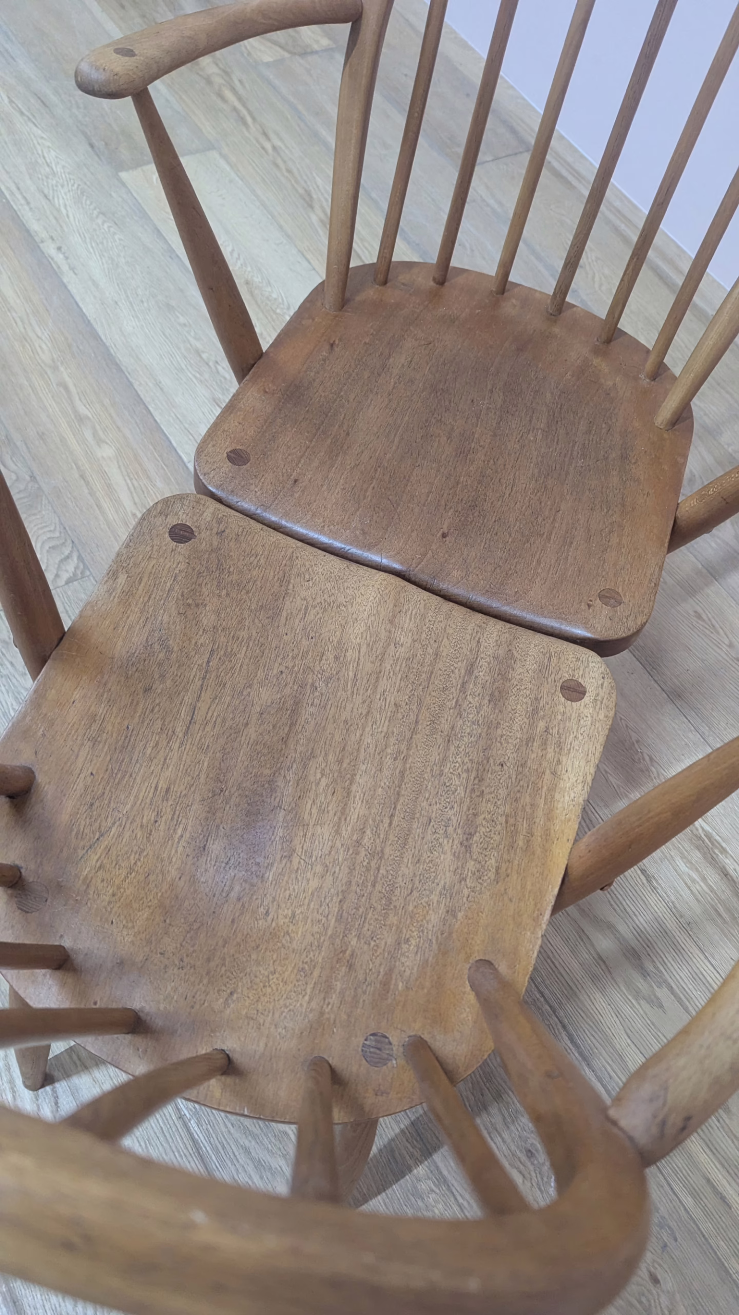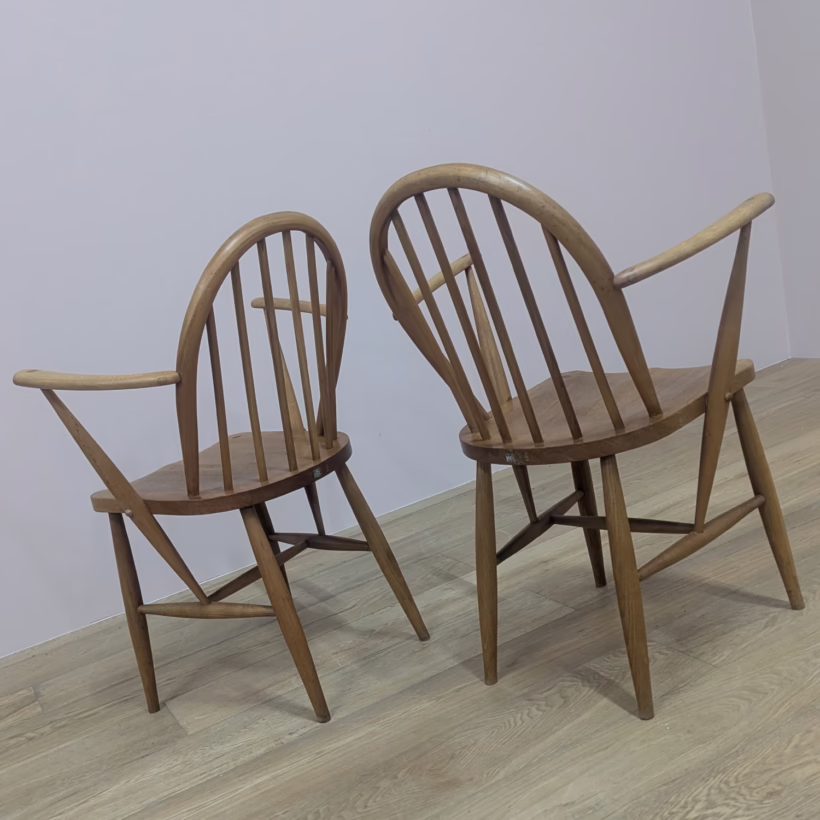 This pair of original, vintage dining chairs is ‘sold as seen’. They are both in good – very good, used condition, factoring in their considerable age. They have been cleaned and checked for sturdiness and stability, and they have been partially restored, a process that involved hand-sanding the spindles, legs and hoop backs, followed by oil then beeswax polish. across the whole chair. We have done this to preserve some of the marks and history that are across their surfaces so some minor scuffs and marks here and there remain but nothing to flag. They are extremely well-made as you would expect and both carry the maker’s mark and CC41 stamps on them. Do browse our photos for an accurate representation of their condition and colour. Any queries, just get in touch.