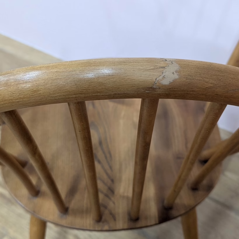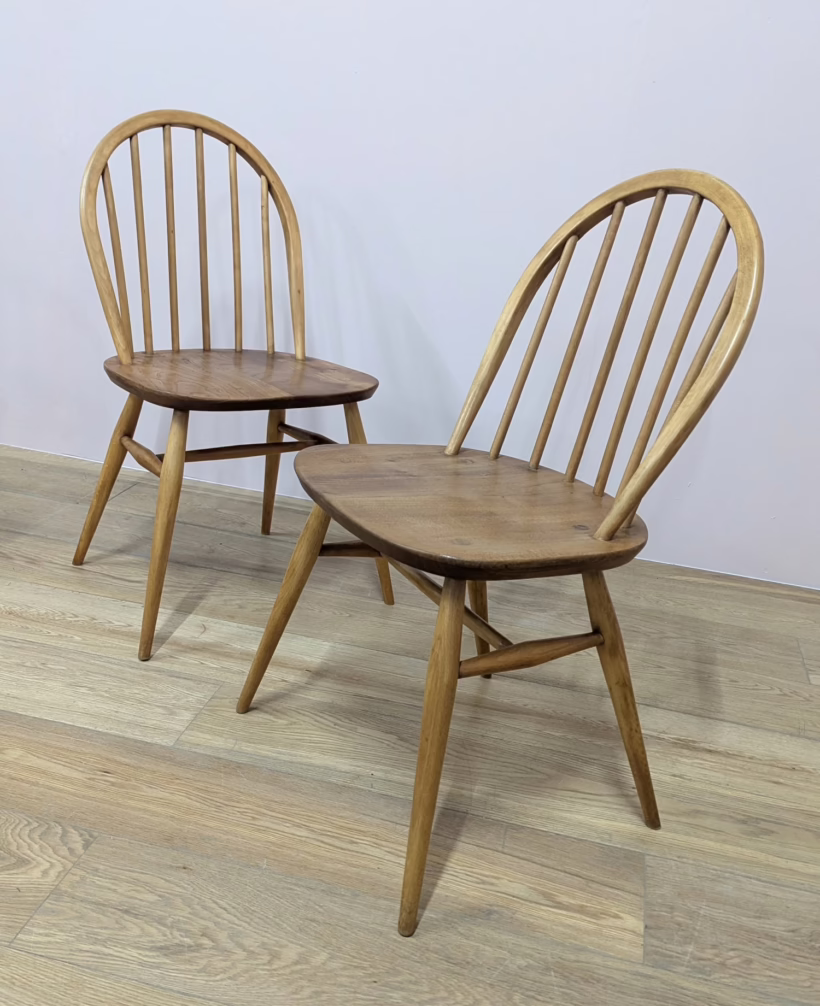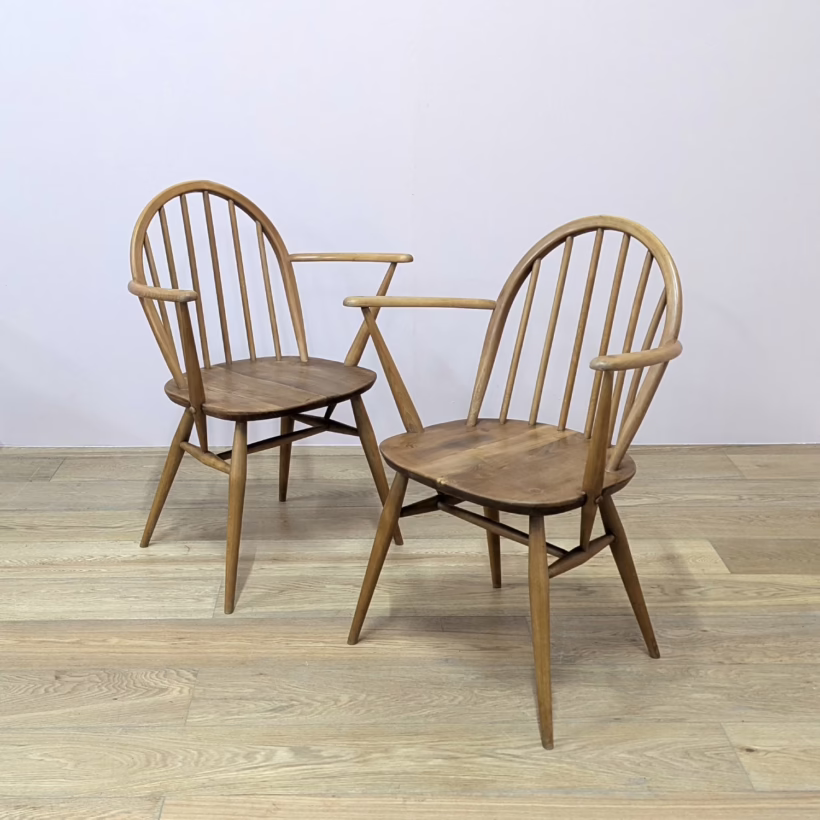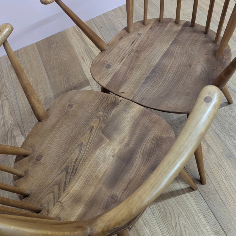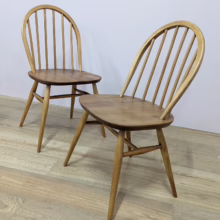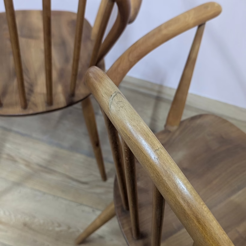 This pair of original, vintage dining chairs is ‘sold as seen’. They are in good, used condition. They have been checked, cleaned and restored, a long process that involved removing the original finish by hand-sanding so as not to be too harsh, then coats of oil, finishing with a natural wax polish and buffed to a shine. Both had minor splits on the crests of their hoop backs which we have stabilised, filled and repaired. They should present no further issue and the repairs are very discreet – please refer to our photos. There are light blemishes and scuffs here and there which can be seen across our photos but overall the wear and tear is minimal – these chairs are in remarkably good order, following their careful refurbishment. Both carvers have the blue Ercol label in place and all chairs are stamped underneath. They are very well-made as you would expect from Ercol, solid and stable with no wobbles or areas of concern. Do browse our photos for an accurate representation of their condition and colour. Any queries, just get in touch.