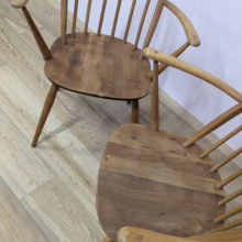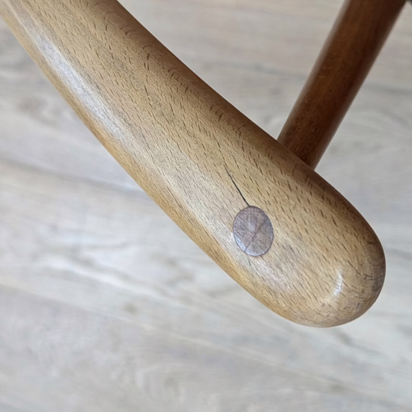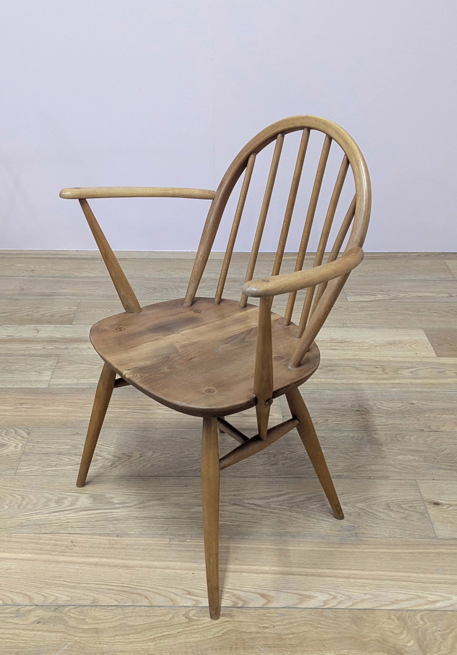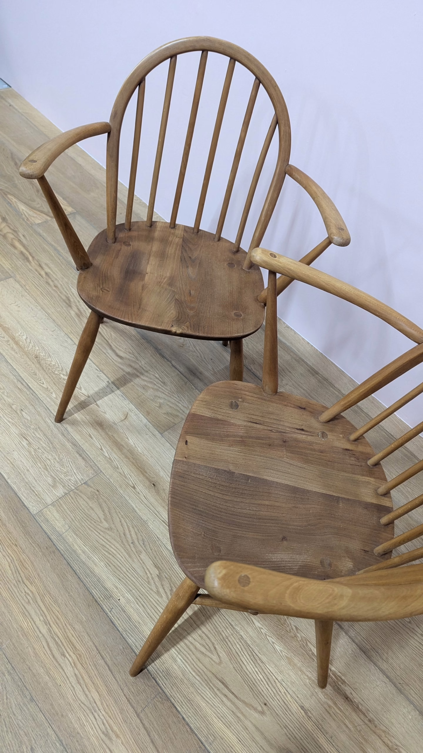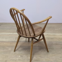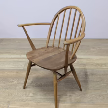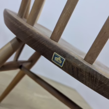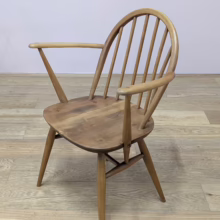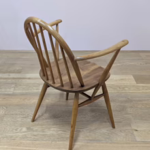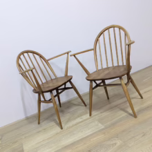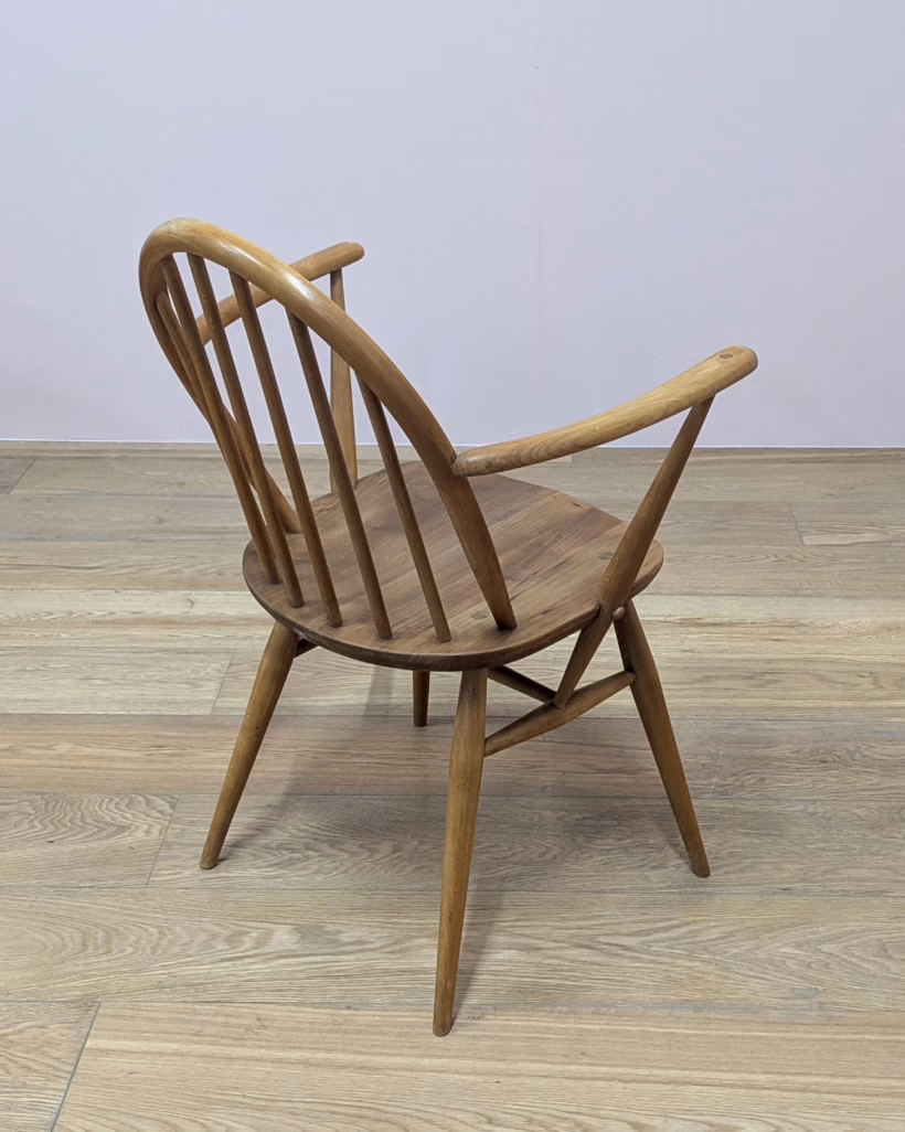 This pair of original, vintage dining chairs is ‘sold as seen’. They are in good, used condition. They have been checked, cleaned and restored, a long process that involved removing the original finish by hand-sanding so as not to be too harsh, then coats of oil, finishing with a natural wax polish and buffed to a shine. Both had minor splits on the crests of their hoop backs which we have stabilised, filled and repaired. They should present no further issue and the repairs are very discreet – please refer to our photos. There are light blemishes and scuffs here and there which can be seen across our photos but overall the wear and tear is minimal – these chairs are in remarkably good order, following their careful refurbishment. Both carvers have the blue Ercol label in place and all chairs are stamped underneath. They are very well-made as you would expect from Ercol, solid and stable with no wobbles or areas of concern. Do browse our photos for an accurate representation of their condition and colour. Any queries, just get in touch.