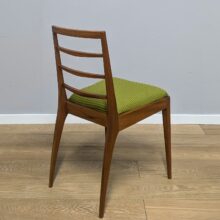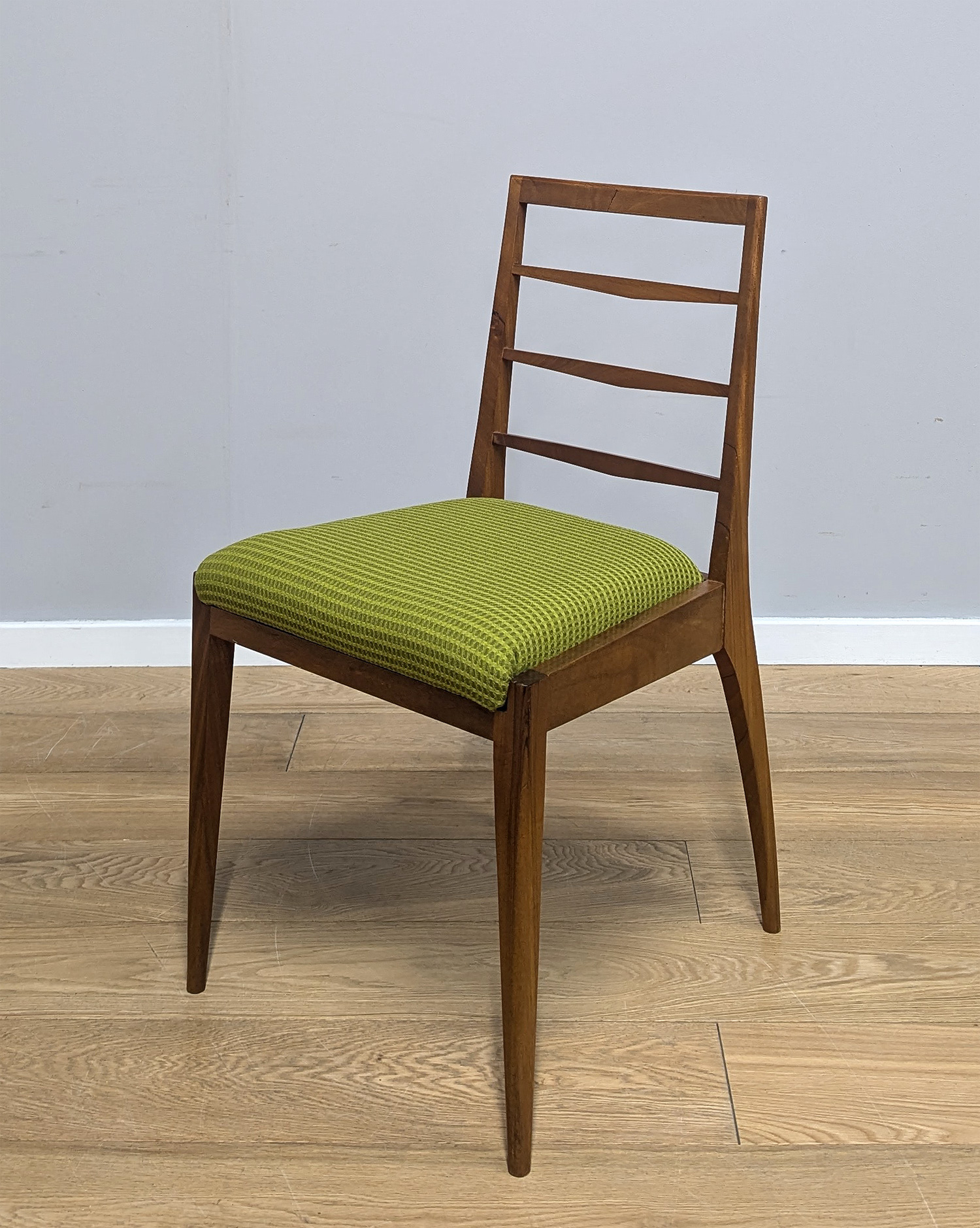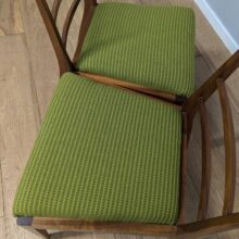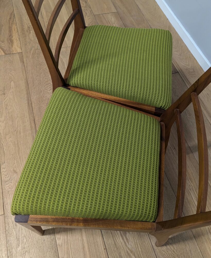 This pair of authentic, vintage dining chairs is ‘sold as seen’. Overall all the chairs are in very good, used condition. Each chair frame has been thoroughly checked, cleaned, waxed and polished to restore their glow and bring them back to life. We have reupholstered the seat pads and covered them in a lime green, textured wool by Bute Fabric. The great thing about drop-in seat pads like this is that they can be easily and cost-effectively recovered, should this fabric choice not be to your taste. Both chairs are solid and stable with no wobbles. There are very minor, superficial marks and scuffs on the chair frames but nothing to flag. Do browse our photos for an accurate sense of their super order. Any queries, please do ask.