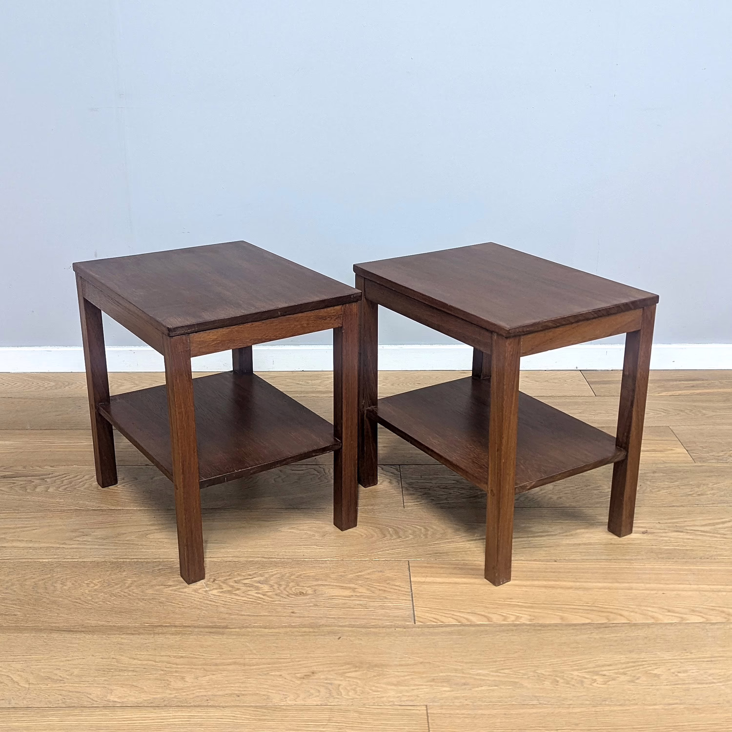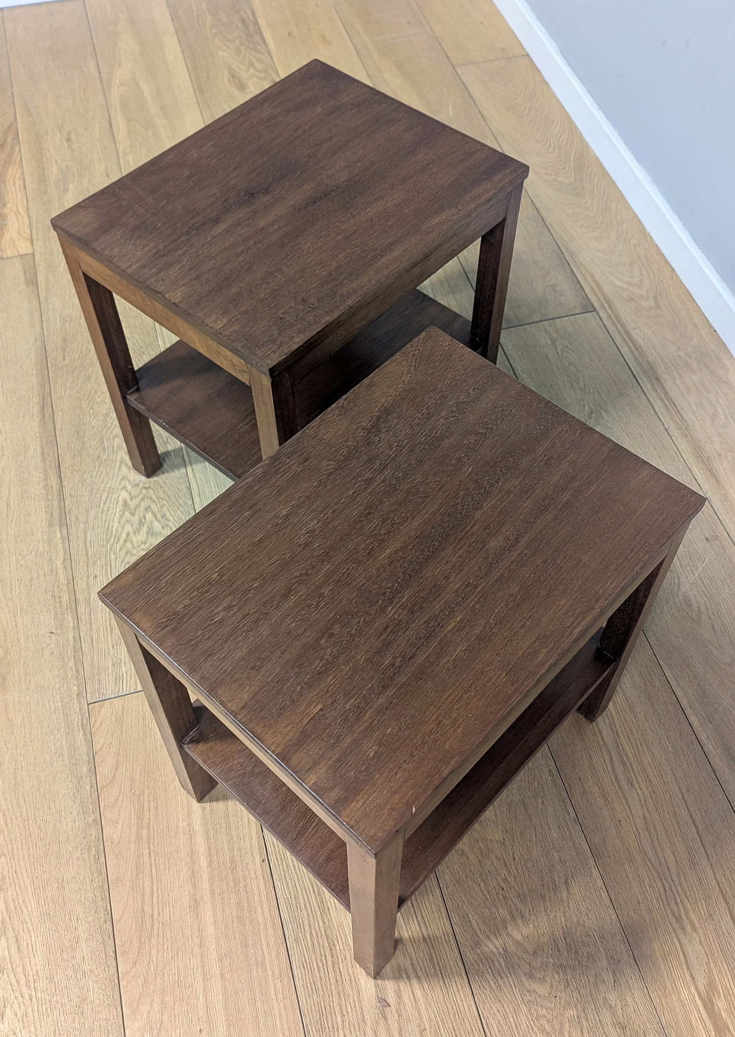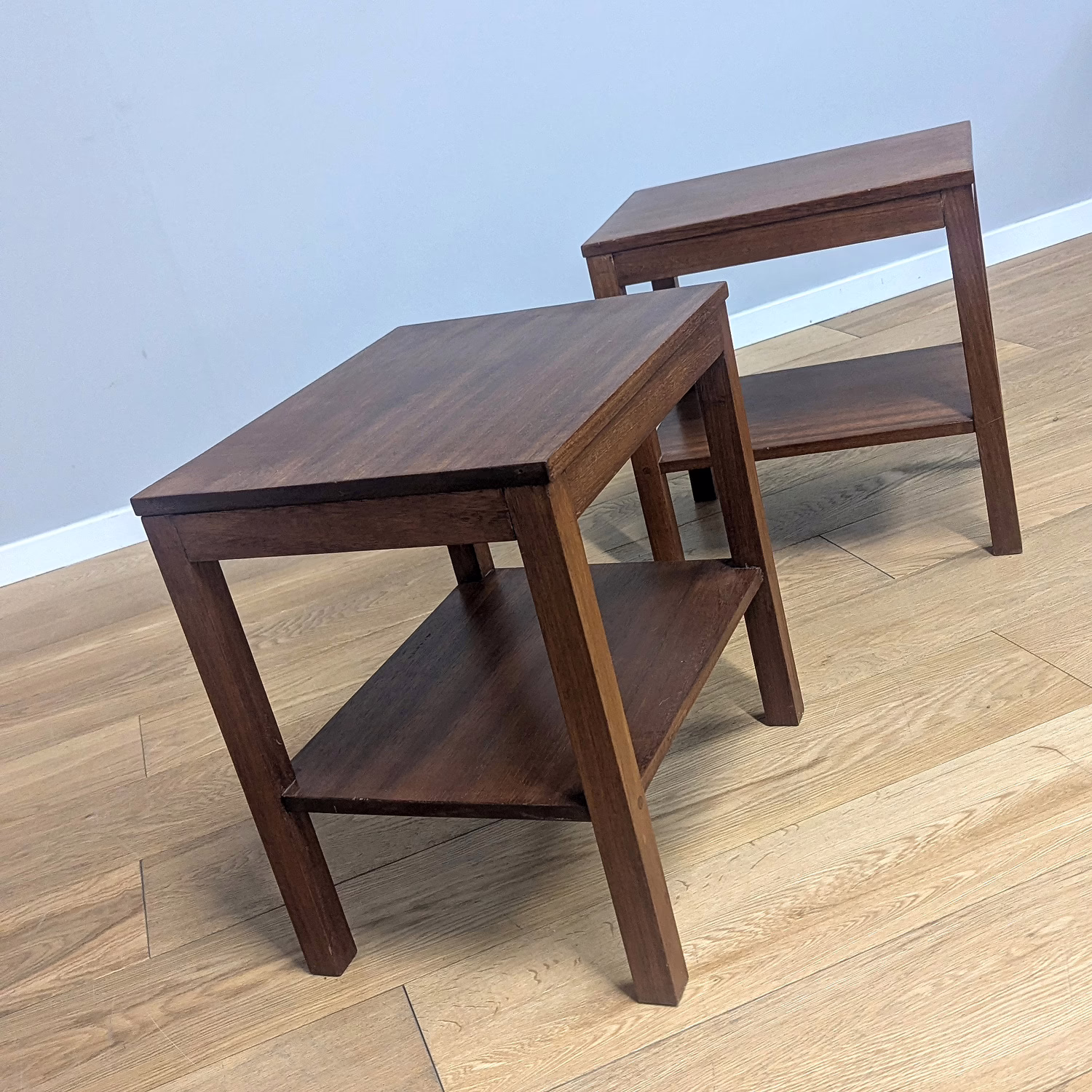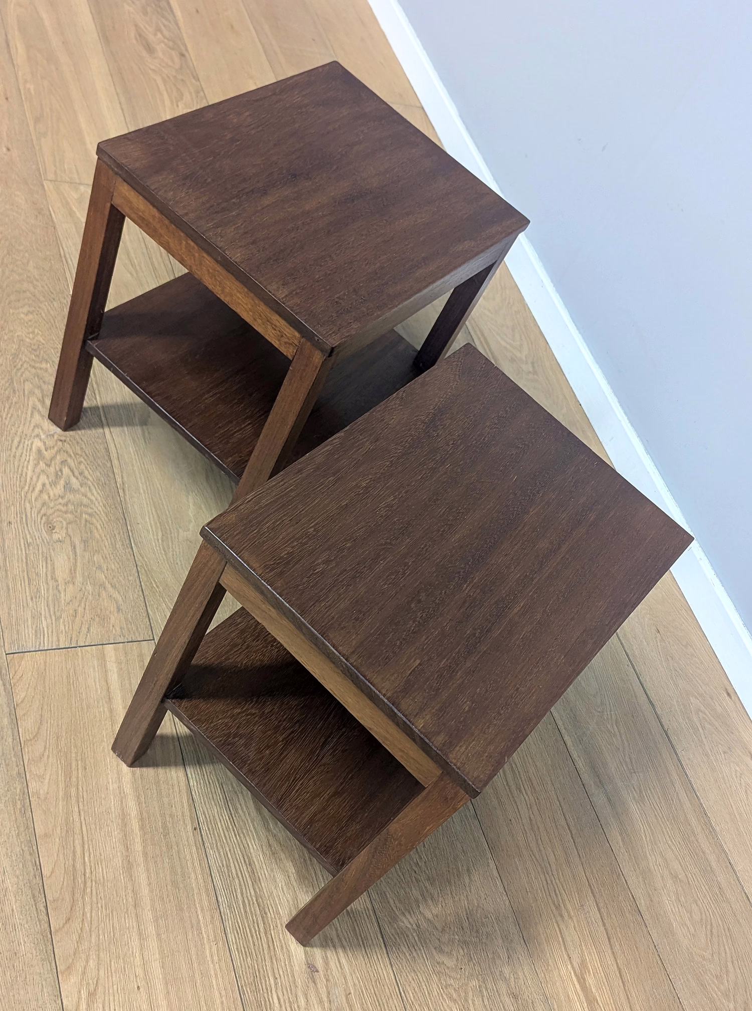 This pair of original, vintage tables is ‘sold as seen’. They are in good – very good, used condition. They have been checked, cleaned and a natural beeswax polish applied to restore shine and nourish the wood but otherwise the finish is original. They are a nicely crafted set that someone has laboured over with care and skill. Overall, there is just minor wear and tear here and there, a little sunlight fading and some knocks but nothing to flag. Do browse our images to get an accurate sense of their overall condition. They are well-made, solid and stable with no areas of concern. If you have any queries, do ask.