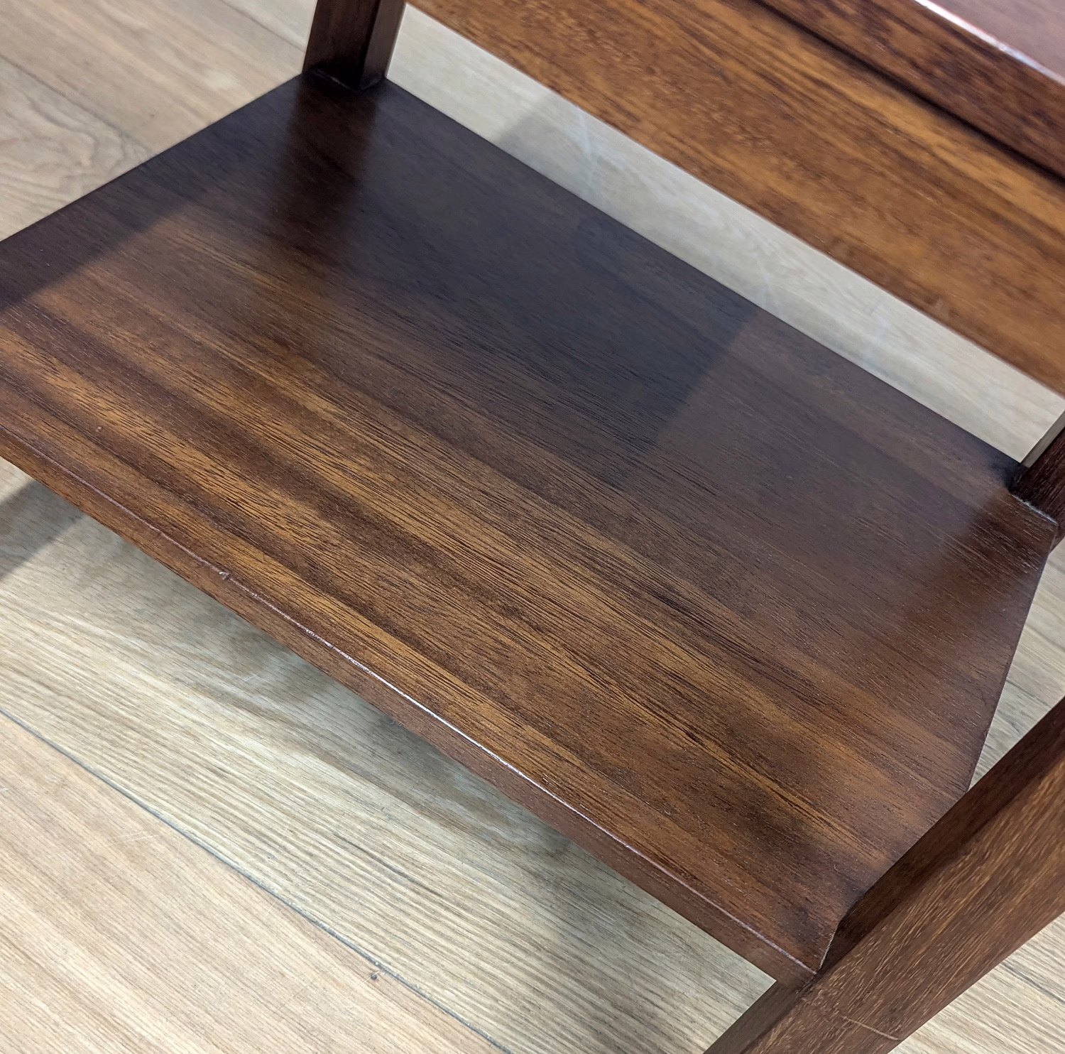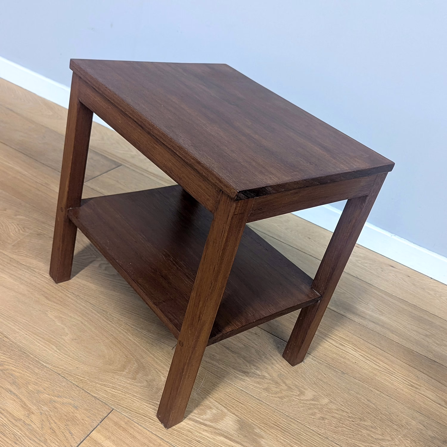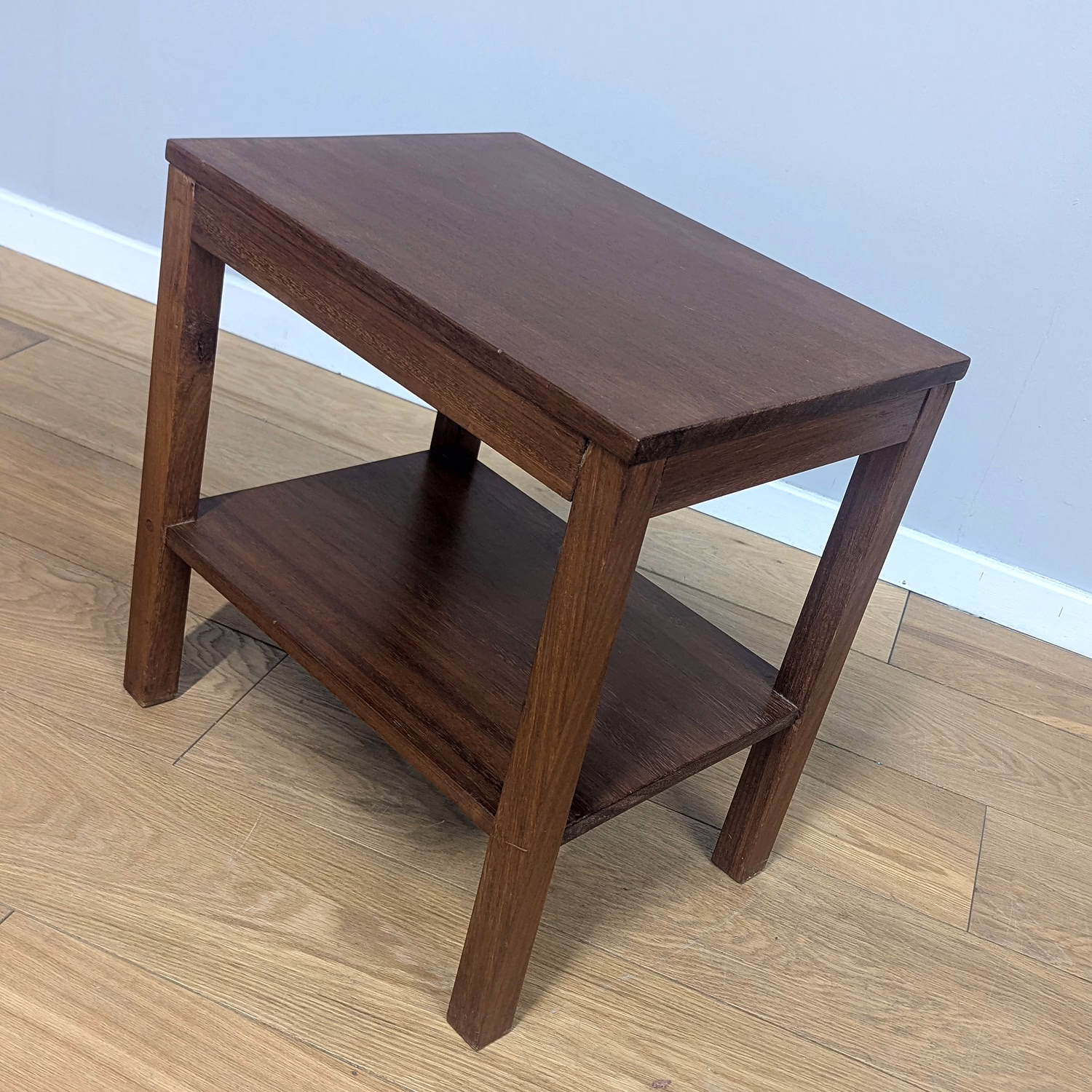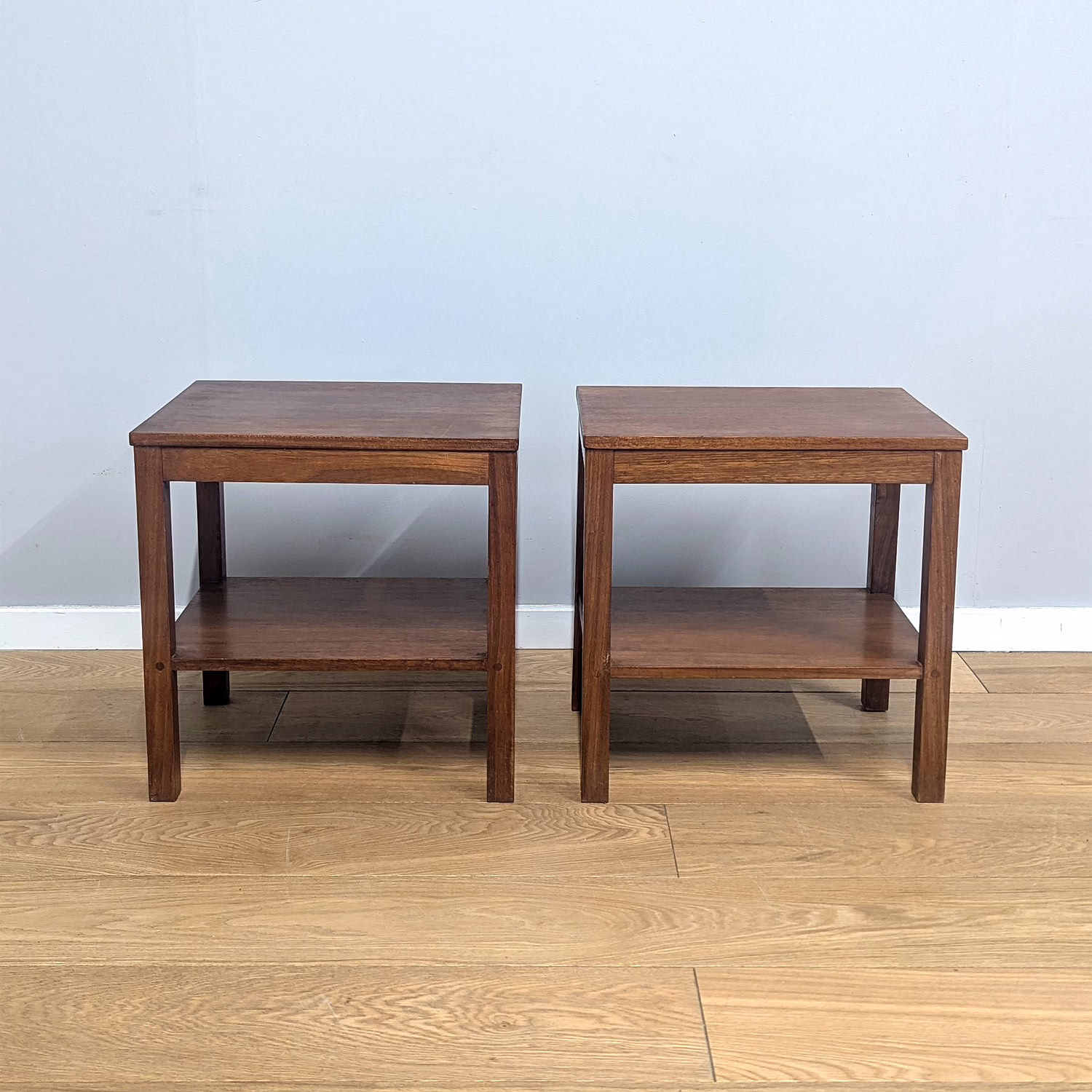 This pair of original, vintage tables is ‘sold as seen’. They are in good – very good, used condition. They have been checked, cleaned and a natural beeswax polish applied to restore shine and nourish the wood but otherwise the finish is original. They are a nicely crafted set that someone has laboured over with care and skill. Overall, there is just minor wear and tear here and there, a little sunlight fading and some knocks but nothing to flag. Do browse our images to get an accurate sense of their overall condition. They are well-made, solid and stable with no areas of concern. If you have any queries, do ask.