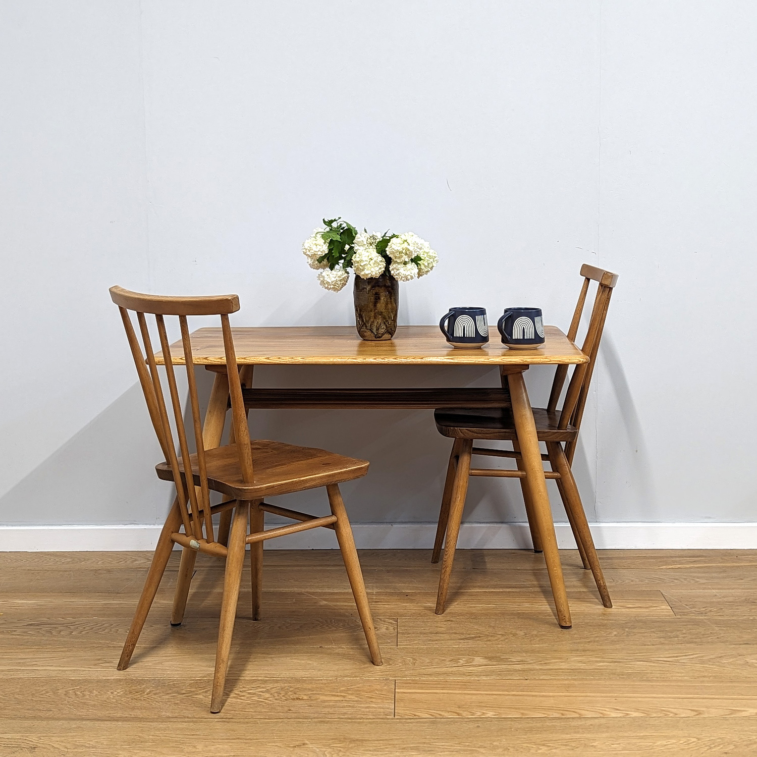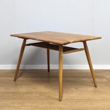 This is an original Ercol, vintage table that is ‘sold as seen’. Overall, it is in very good, used condition but it has been modified so do read on. The table has been cleaned and a natural beeswax polish applied but otherwise the finish is original. The legs have been shortened reducing the table height, measured from the ground to the table top, to 62cm – it would have been 72cm. You can still push in smaller dining chairs (we’ve used Ercol 391s in our photos) around the four sides but note, the shelf rack means you cannot readily tuck your legs under. The modification has been evenly and well done – there are wobbles or concerns with the legs, they’re just frustratingly shorter and this is reflected in our price. Otherwise there are just minor, very light signs of wear and tear to the solid beech, splayed legs and solid British elm table top. Please do view our photos for a good sense of the finish, super condition and grain. It’s particularly well-made, solid and sturdy as you would expect from Ercol. There is no blue label in place but this is a well-documented model that we attribute with 100% confidence. If you’ve any questions or would like to view this piece, please get in touch.